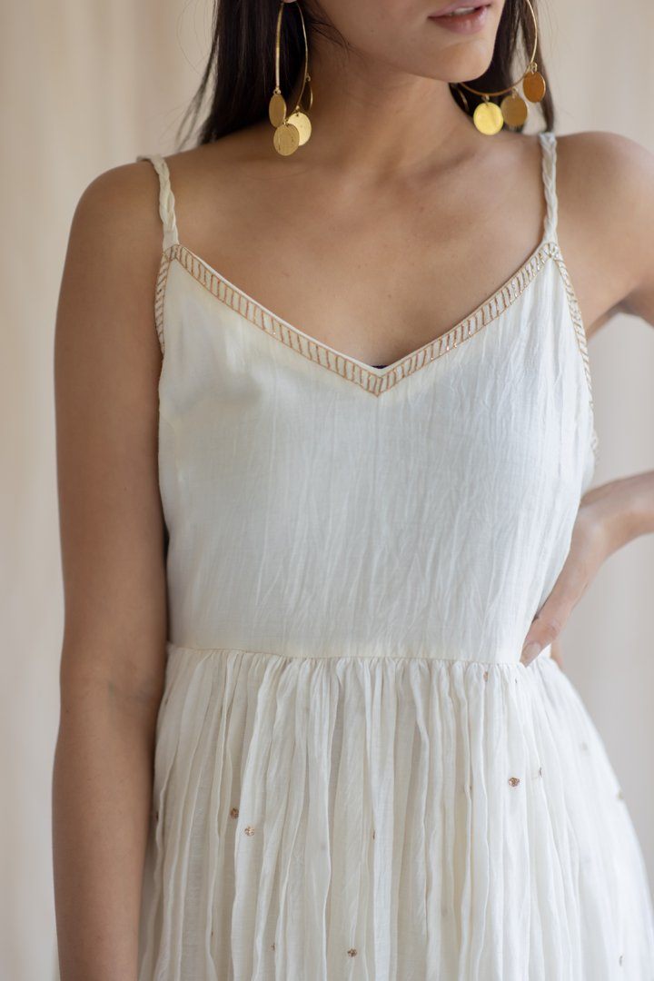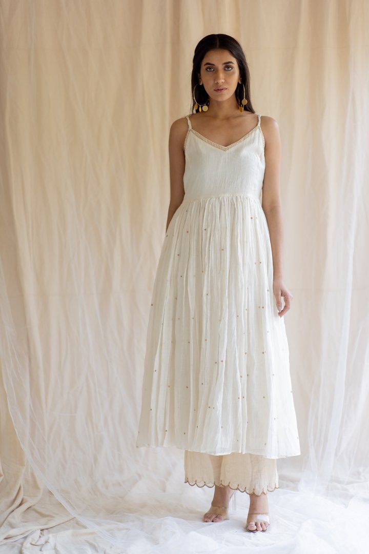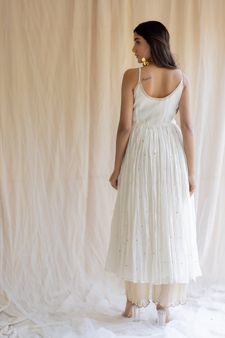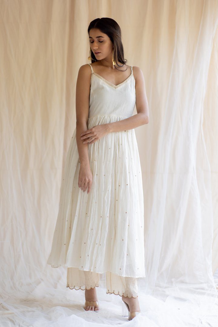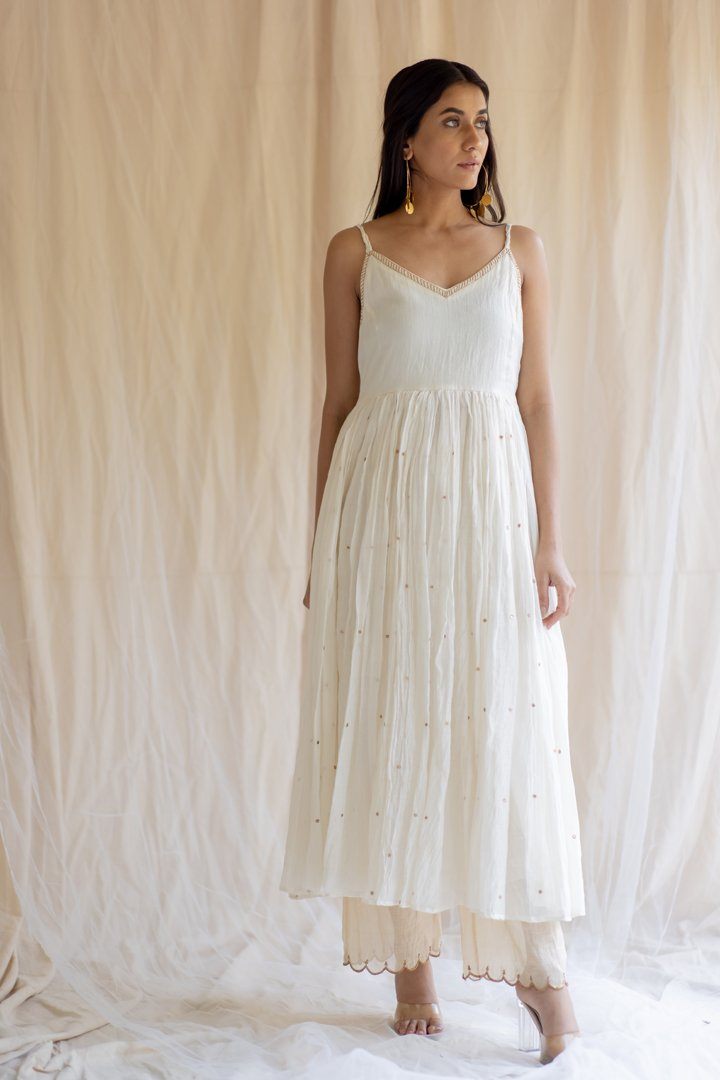Sleeveless fitted upper bodice attached to a flared bottom, paired with embrodiered tissue izaars . This silhouette speaks of the fluid organic femininity.