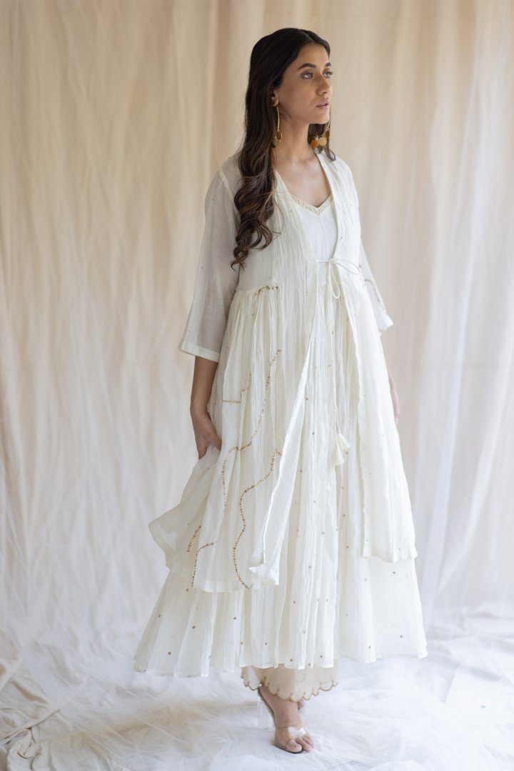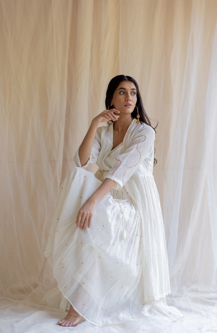 Sleeveless fitted upper bodice with a flared bottom paired with signature Ruya embroidered long tunic (shameez), often worn over a jama and scalloped izaar. This silhouette speaks of the fluid organic femininity.