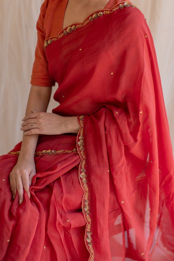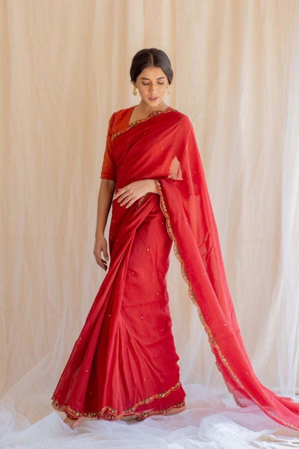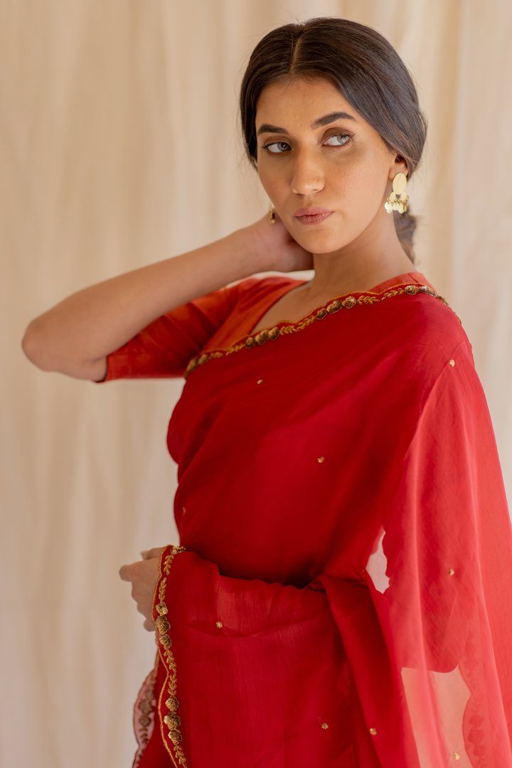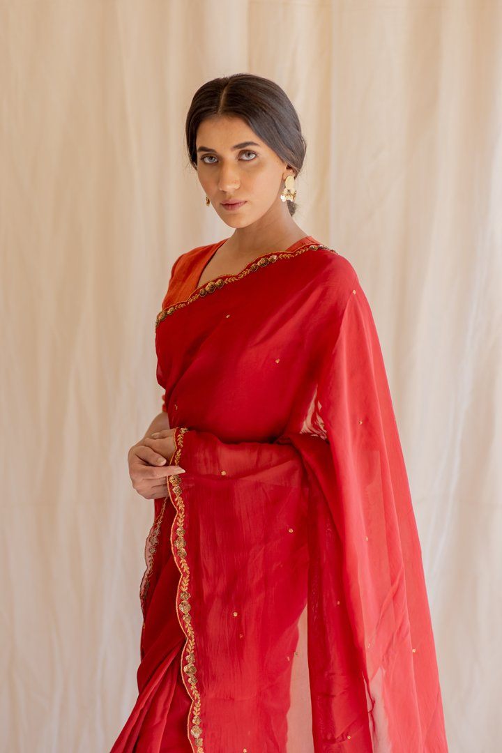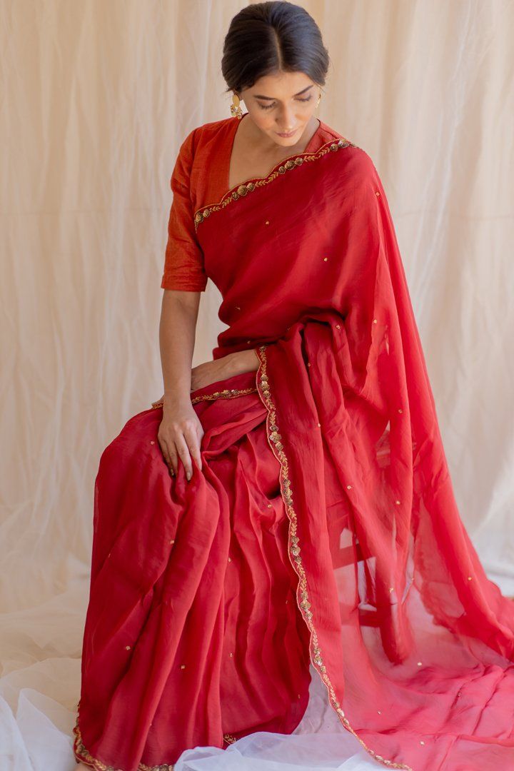 With embellished kanni, this 5.5 metre long saree throws light on the consideration of adornment and power of dignity. Paired with chanderi zari blouse