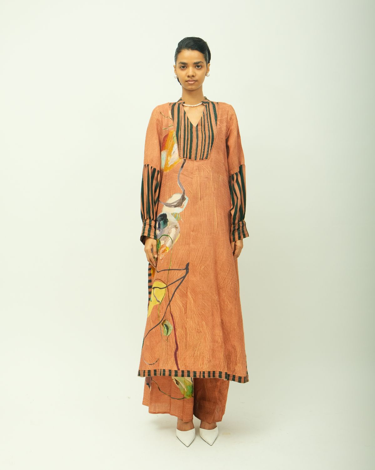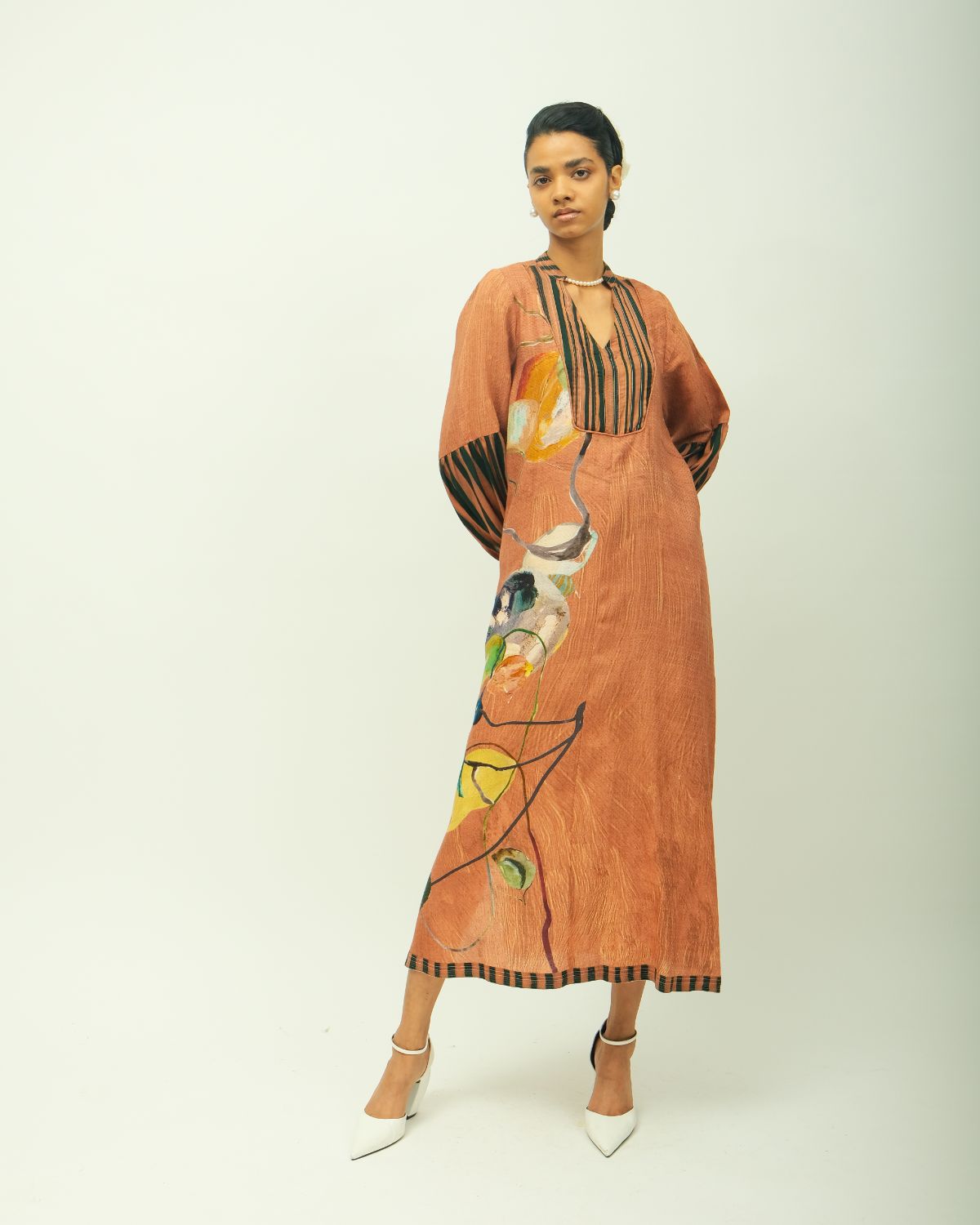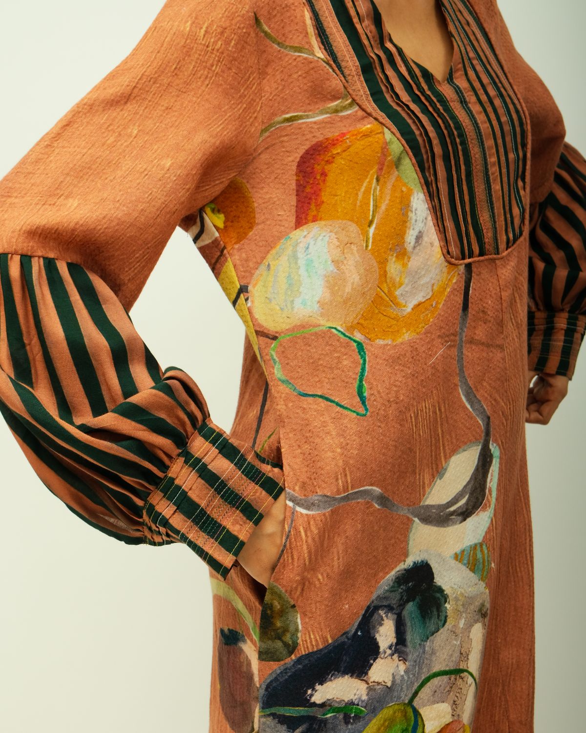 Dress: Anti fit, band collar, relaxed fit, flared long-sleeves, hand-painted abstract expressionist digitally transferred print, pin tucks on yoke, top stitch detailing, cording, striped pattern on sleeves and border, side slit. Ideal for festive celebration and dinner. Print placement may vary - single piece