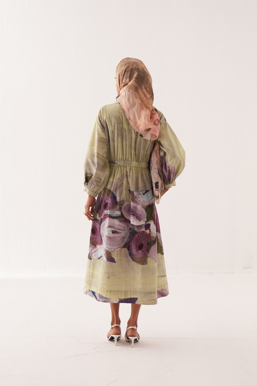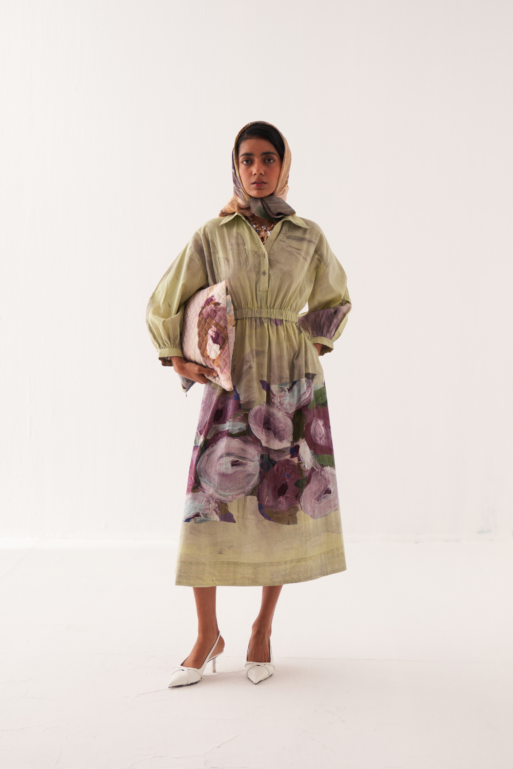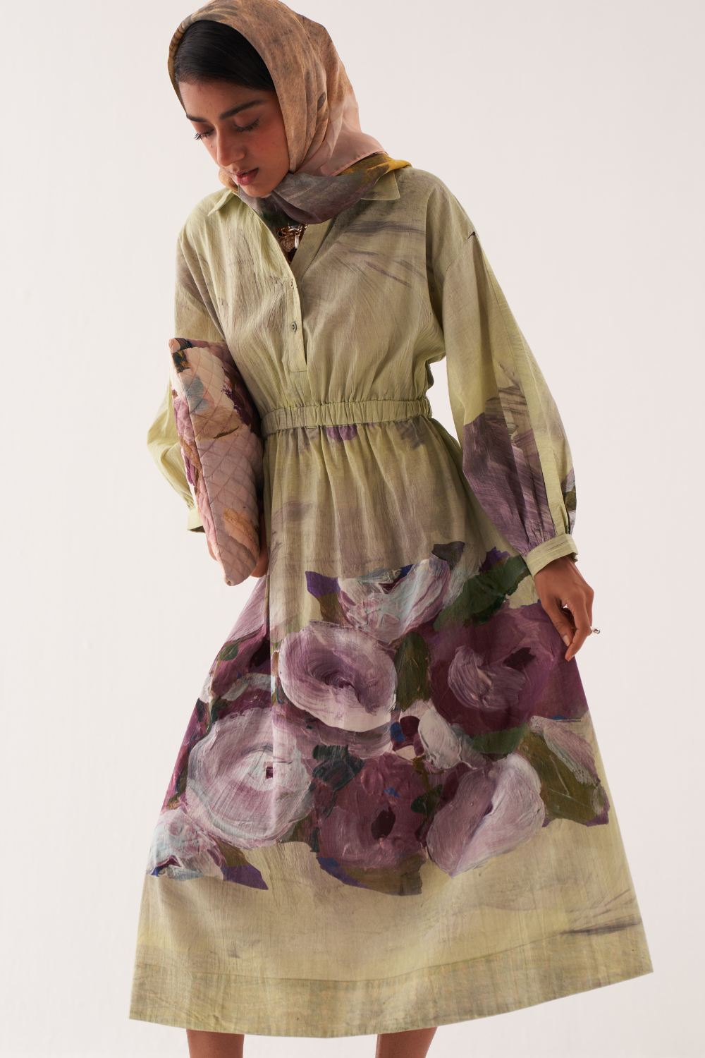A-line dress with shirt collar, half V-neck, and half placket. Full elasticated waist with gathered sleeves with cuffs and side seam pockets. OFR’s signature lune embroidery on the back. Print placements will vary—single Piece. Model is wearing size XS/S. Garment Length: 48"