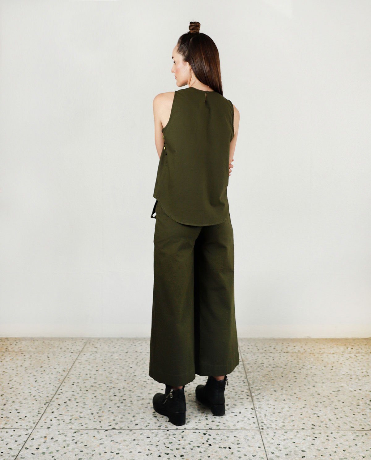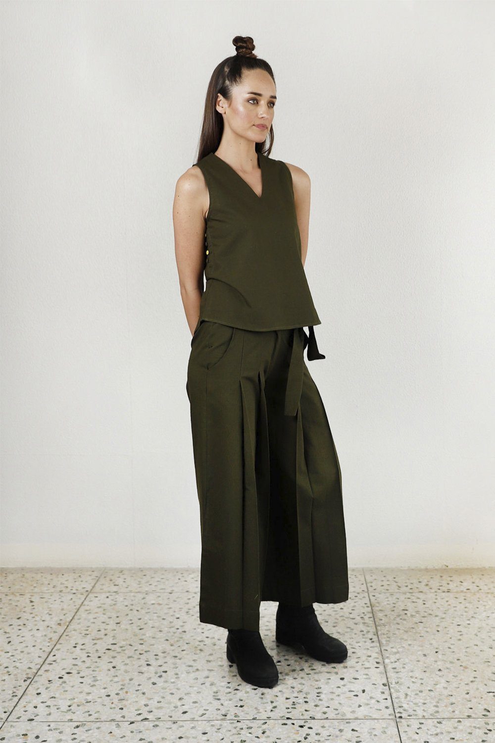 This silhouette features a smart side opeing with big fabric contrat buttons and a plunging neckline. In olive , it's perfect for your lunch or a casual trip out. Pair with our culottes or tie up pants .