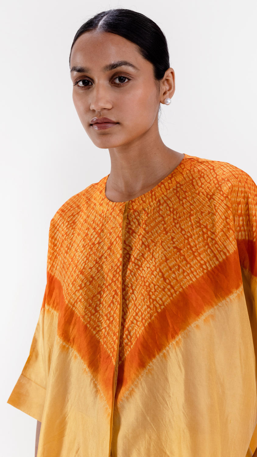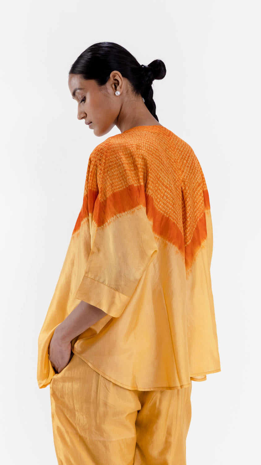 Free size silk shirt dyed in shades of yellow and rust, with a defined shibori pattern on the neckline.