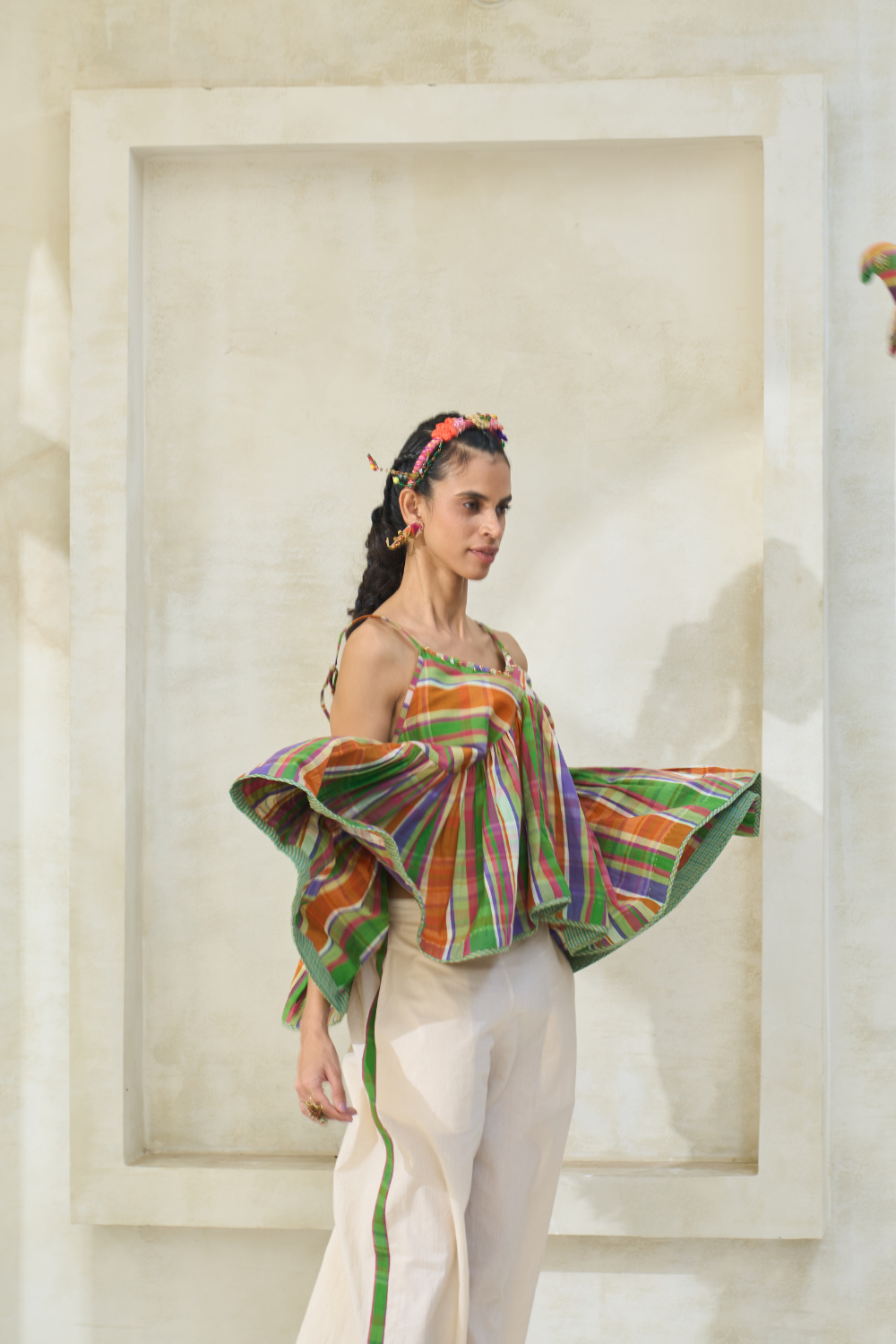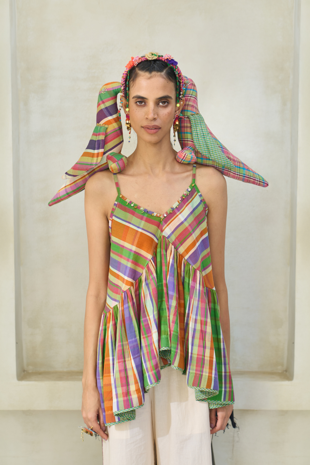 Frill V-neck top with spaghetti straps and tassel pom-pom details, crafted in handwoven, yarn-dyed Bengal 100% cotton irregular Playful Pop Multi check, with 100% cotton Spring Green very small check accents.