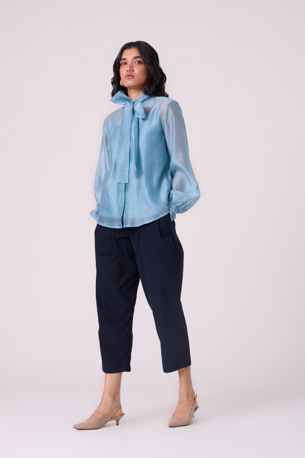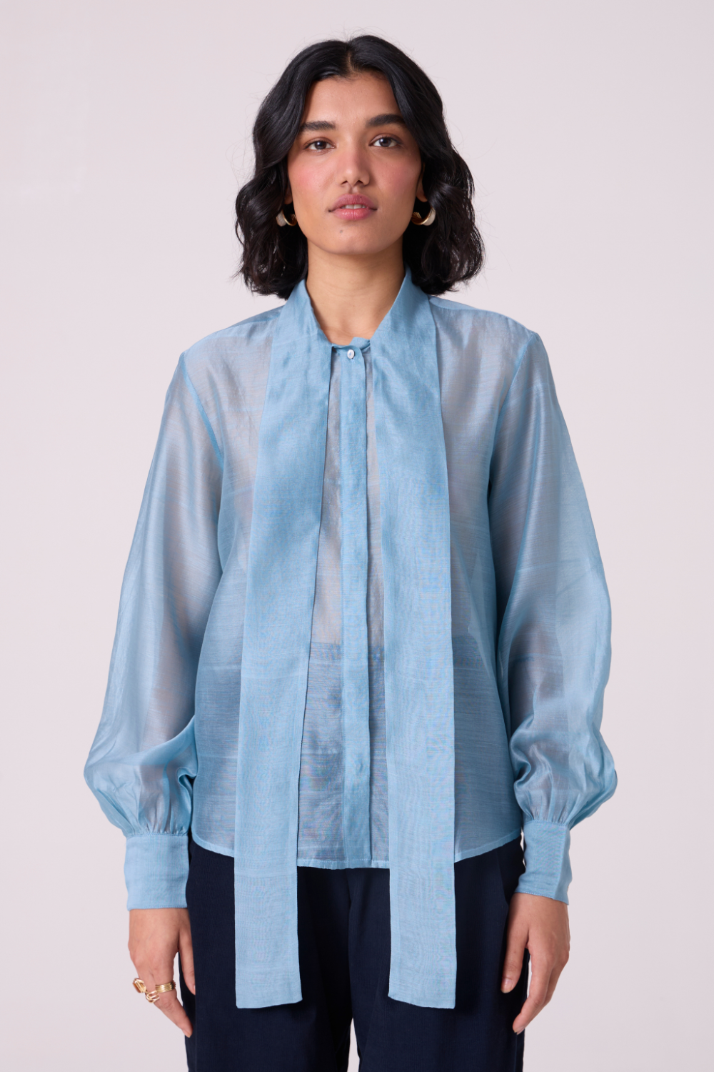 a soft tie at the neck, gentle gathers through the shoulders and yoke, and sleeves finished with a precise cuff. Elegant whether tied or left undone.