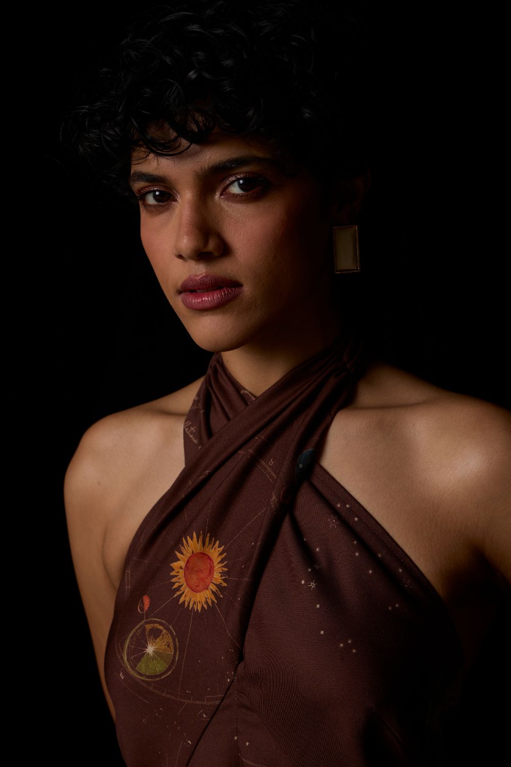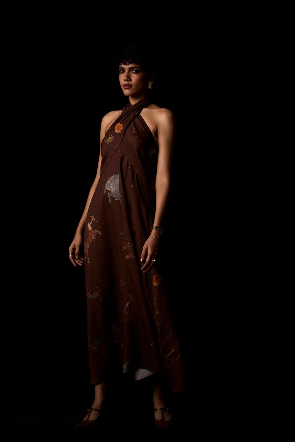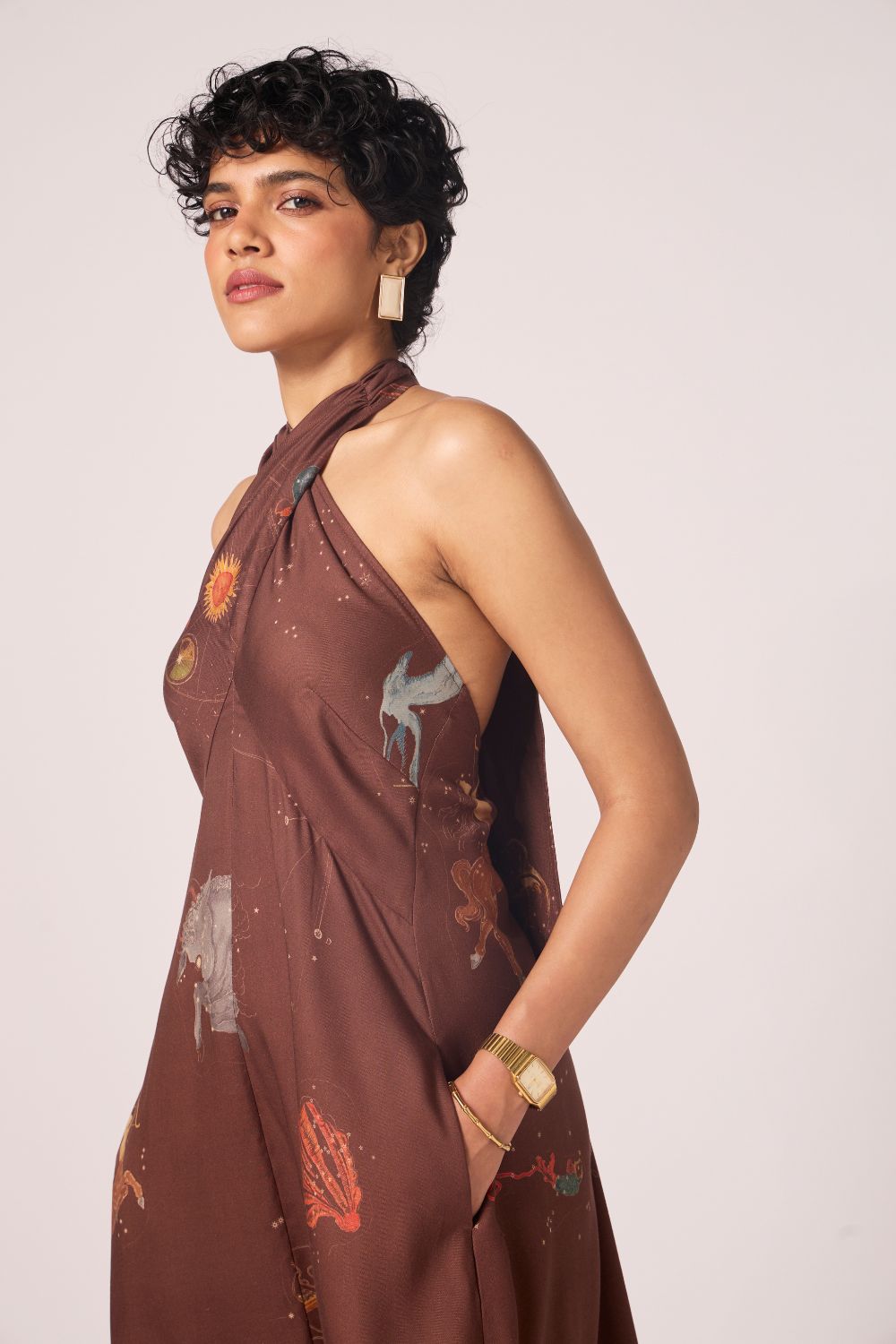 A print that enlivens a classic shape. Measured elegance. Bare shoulders framed by a crossover halter neckline with an open bow-tied back.