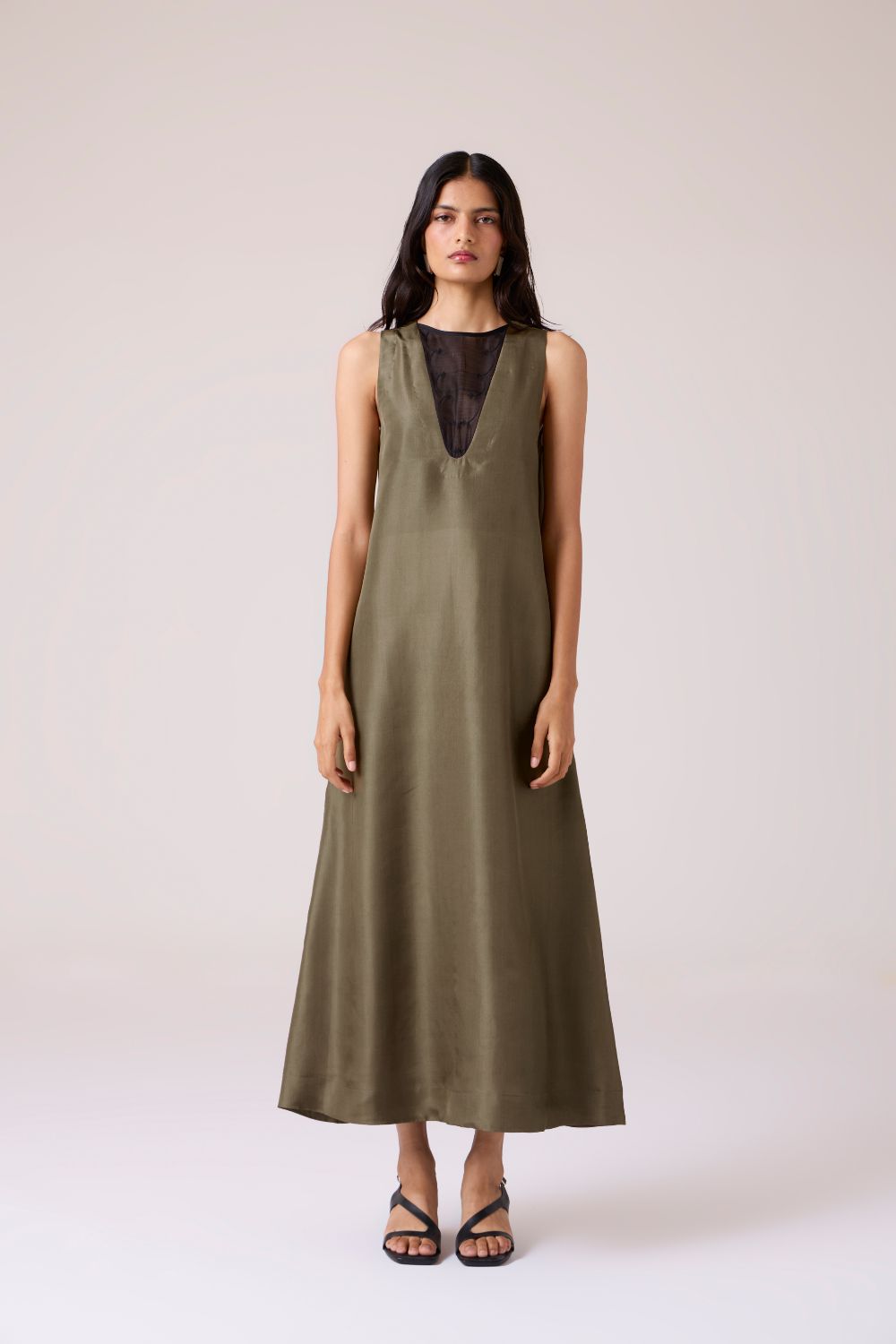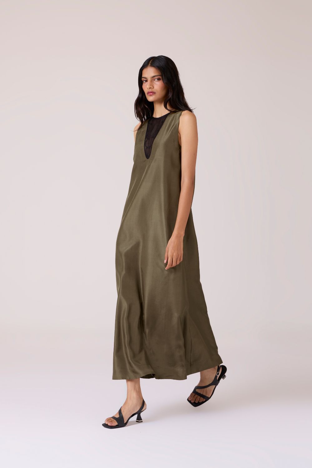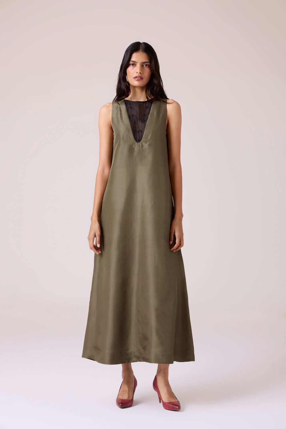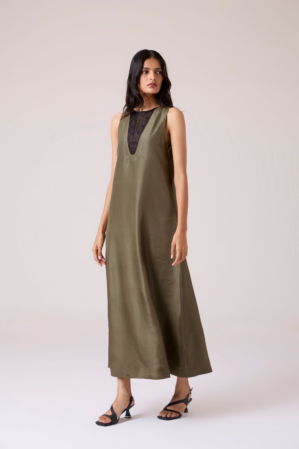 Fluid silk anchored by sheer detail. A round necked slip on dress, lifted by an embroidered scoop yoke and finished with quiet volume.