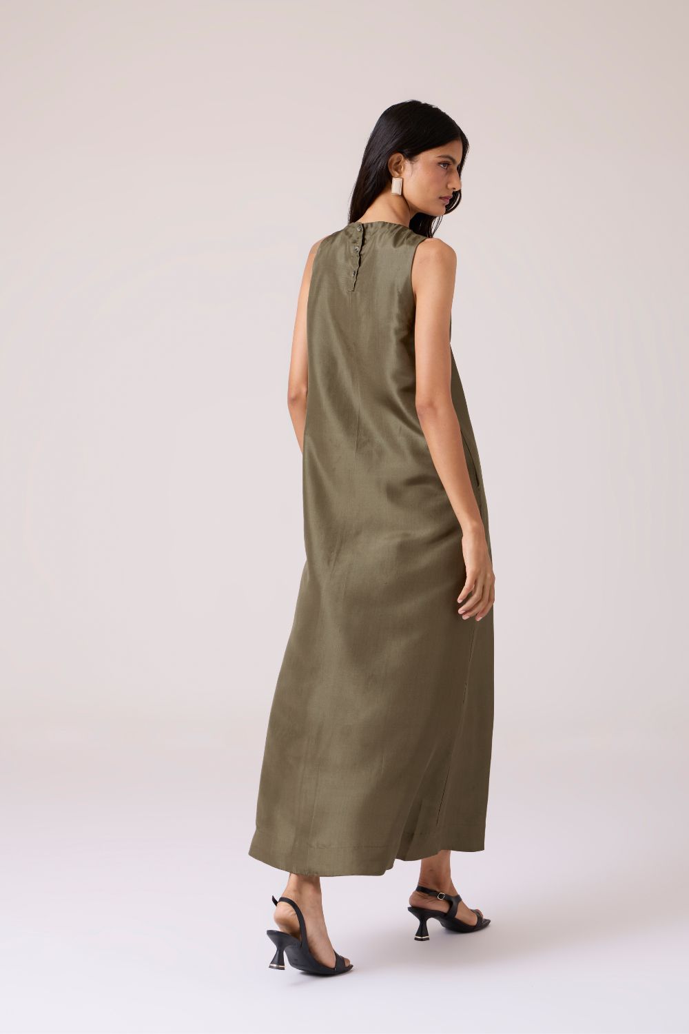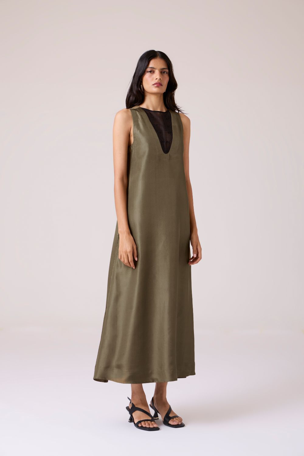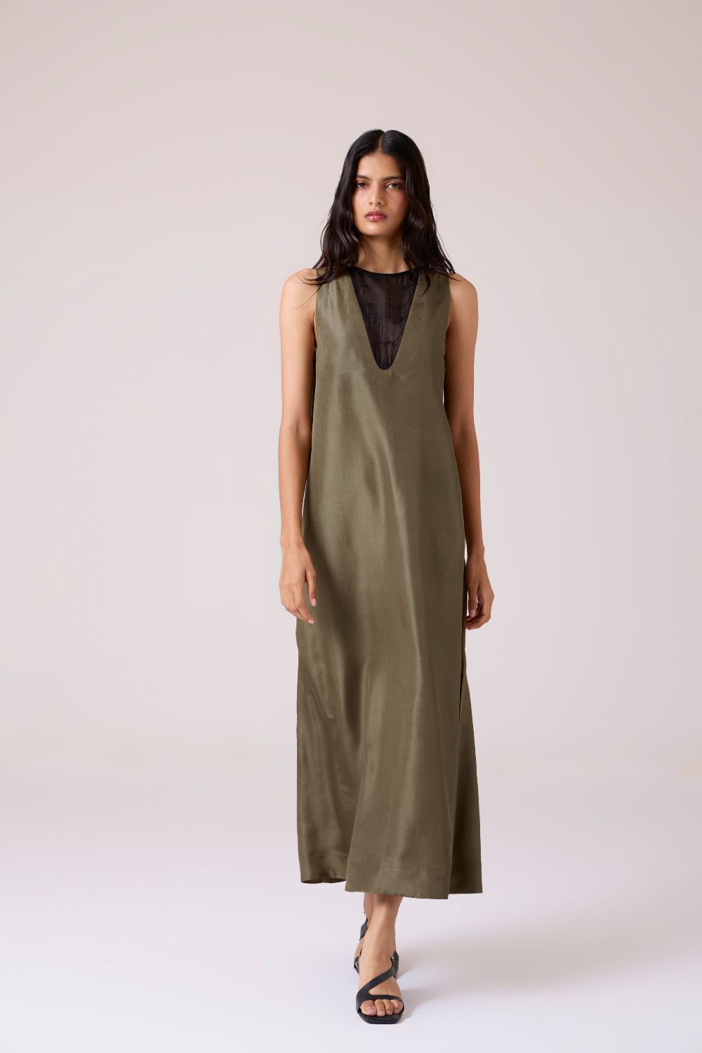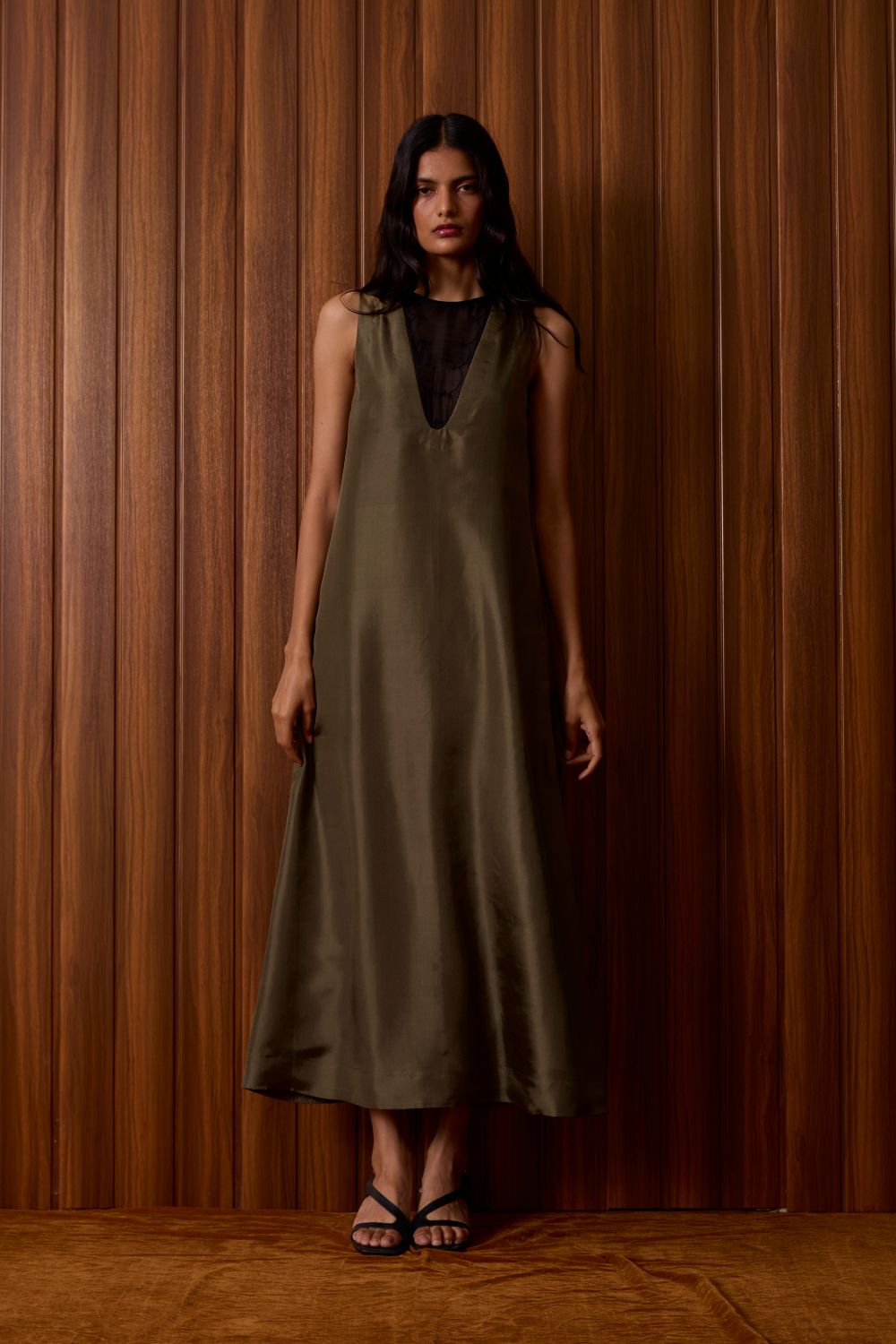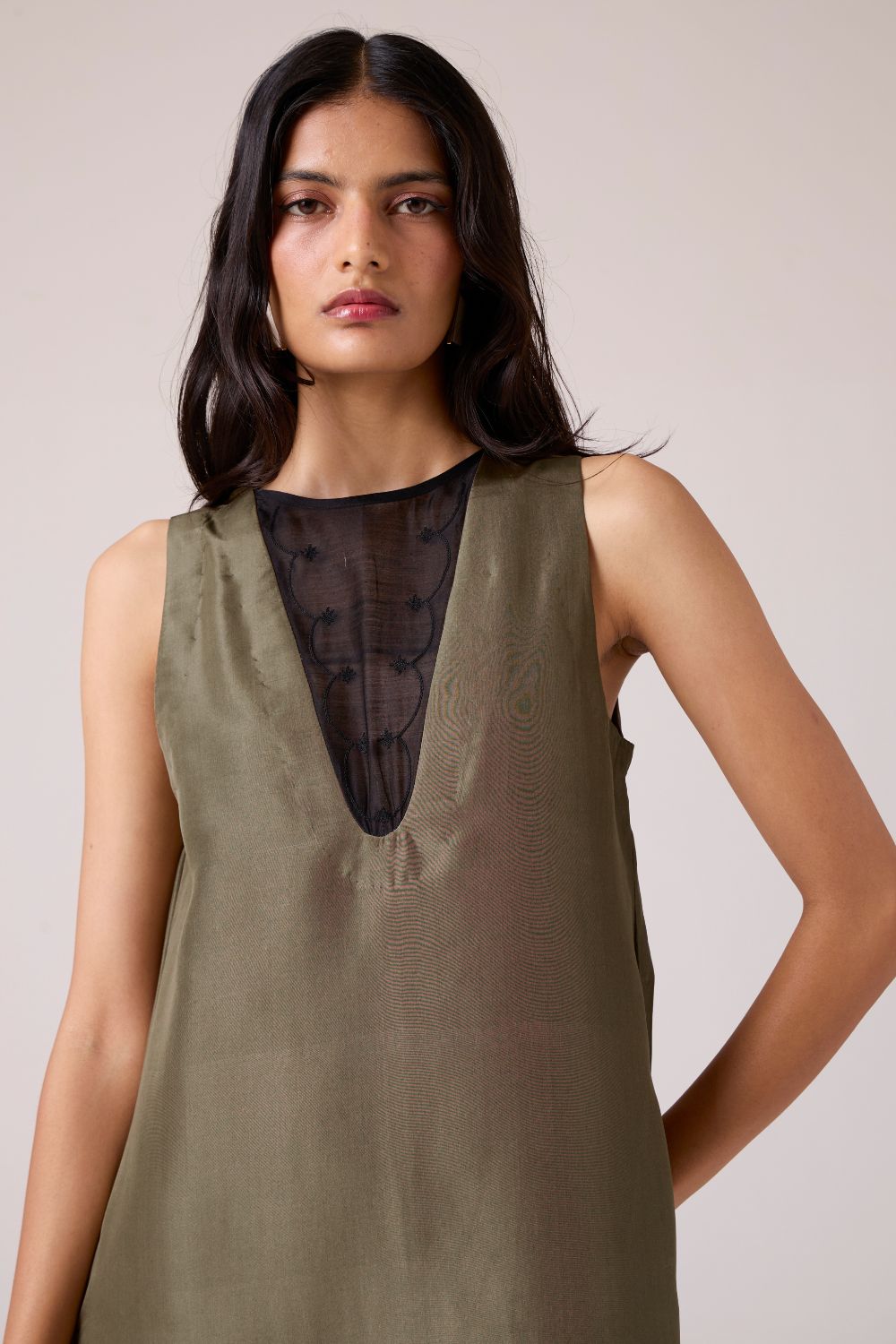 Fluid silk anchored by sheer detail. A round necked slip on dress, lifted by an embroidered scoop yoke and finished with quiet volume.