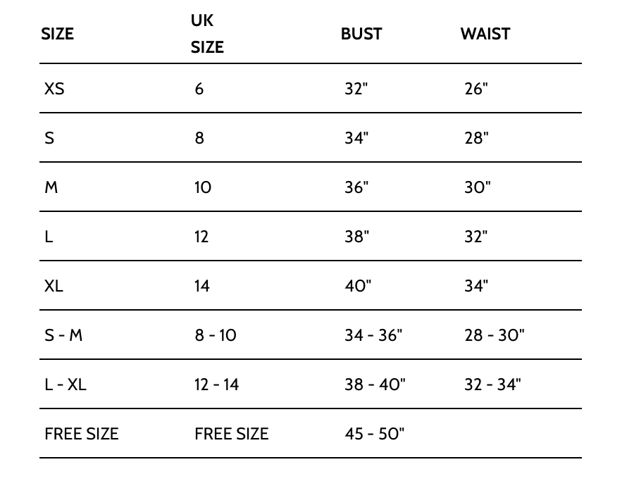 | Size | UK Size | Bust | Waist |