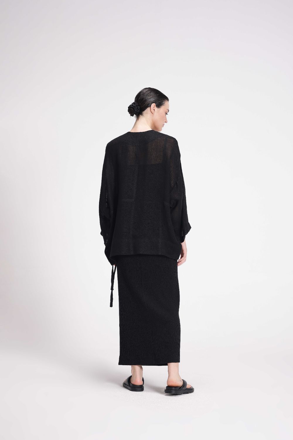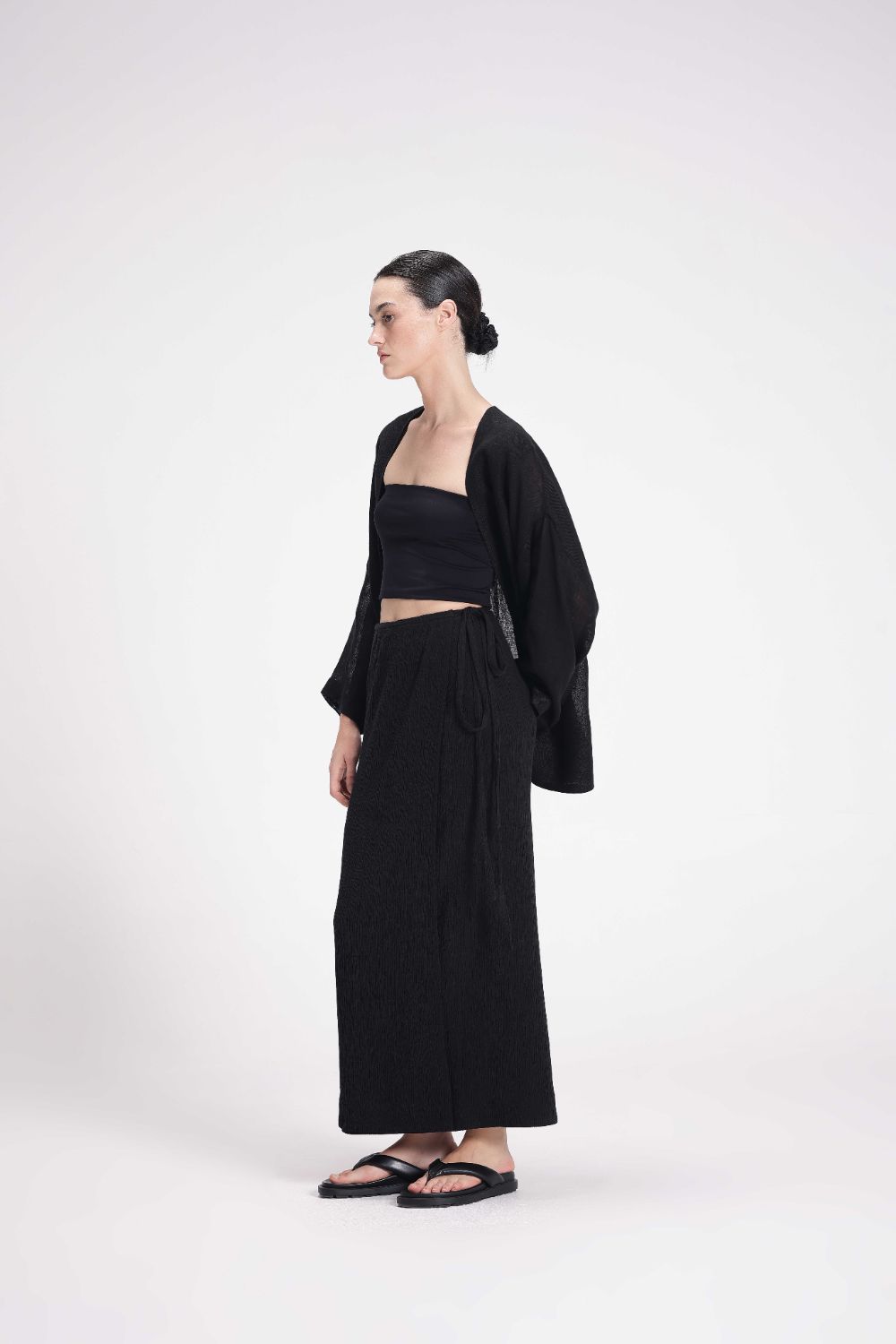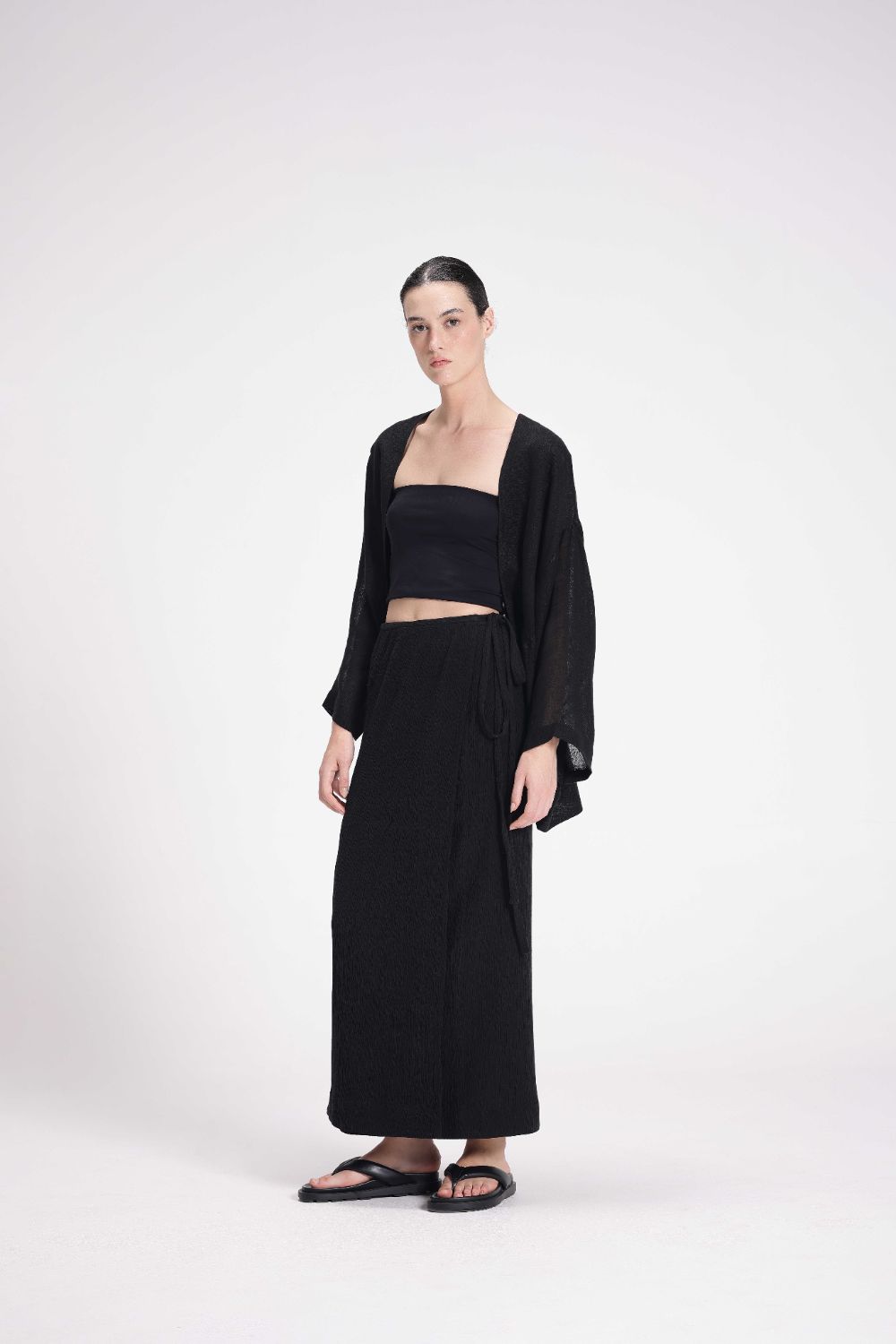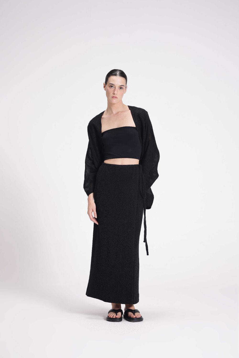 This overlap skirt is designed for a straight fit and features a string tie-up for a customizable fit. Made from stretchable cotton crepe, it offers comfort and a sleek silhouette.