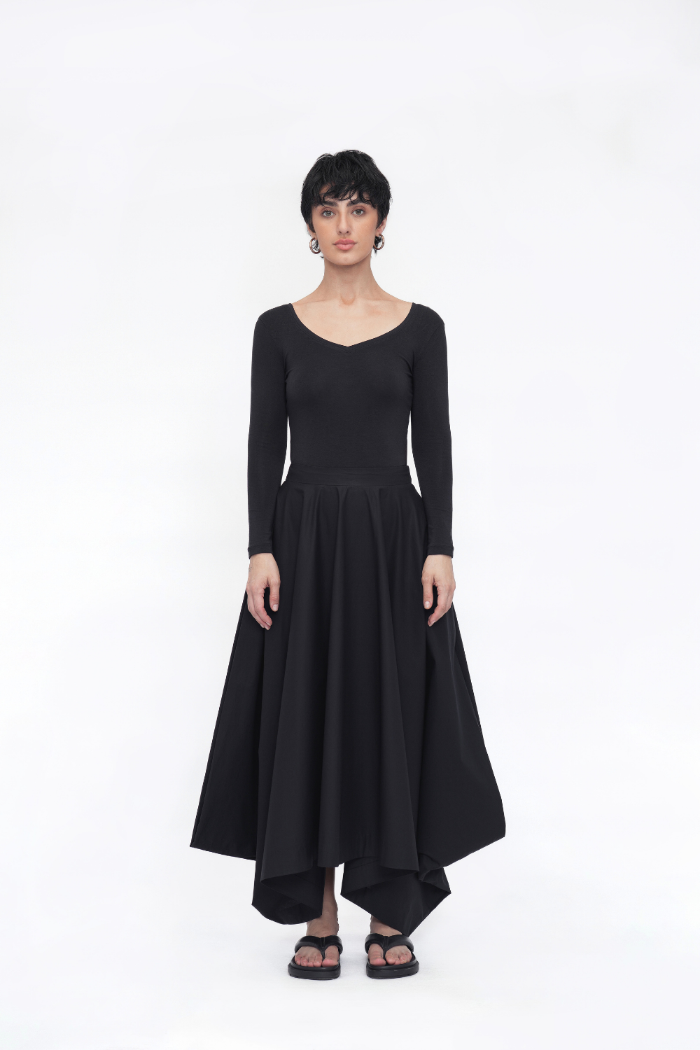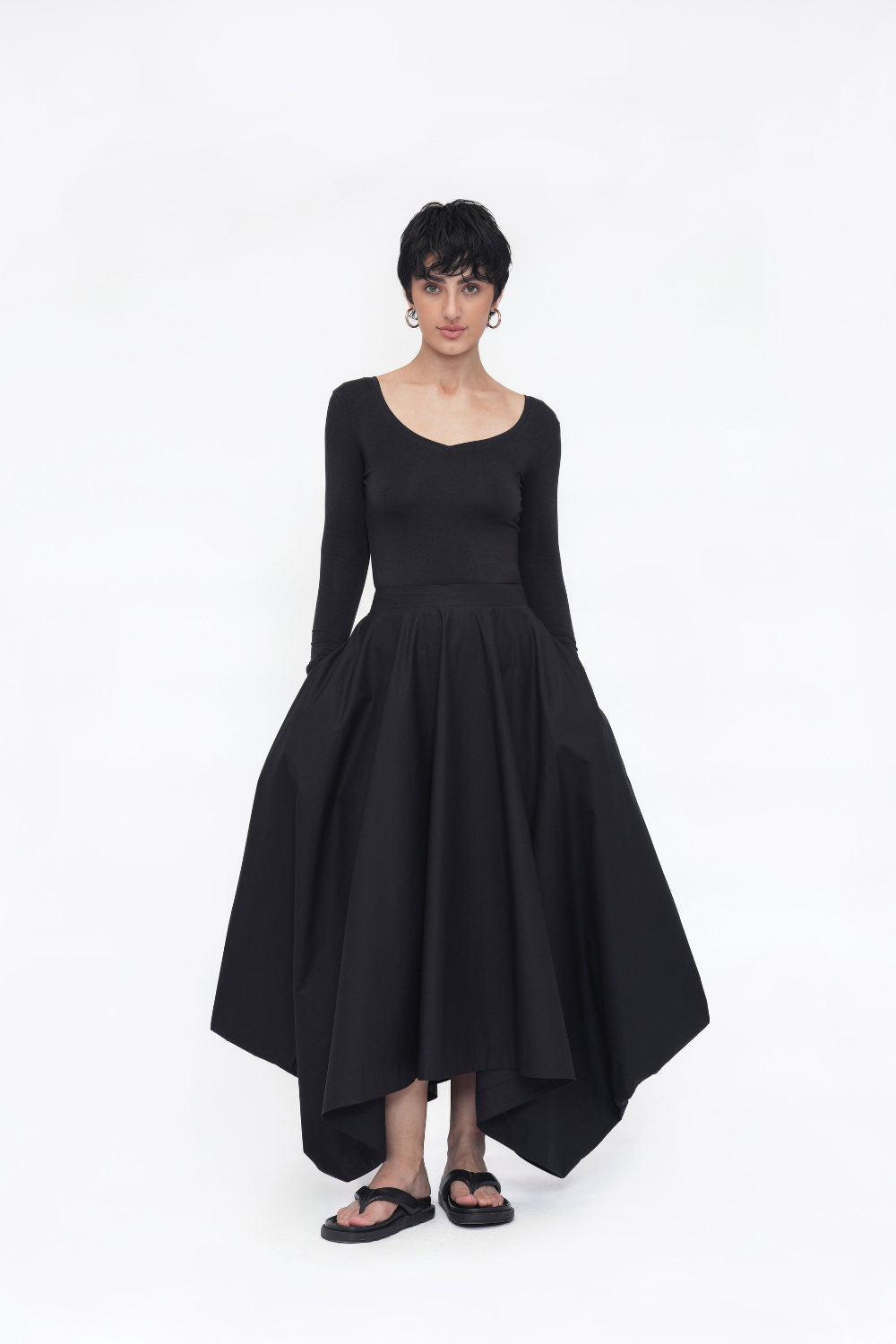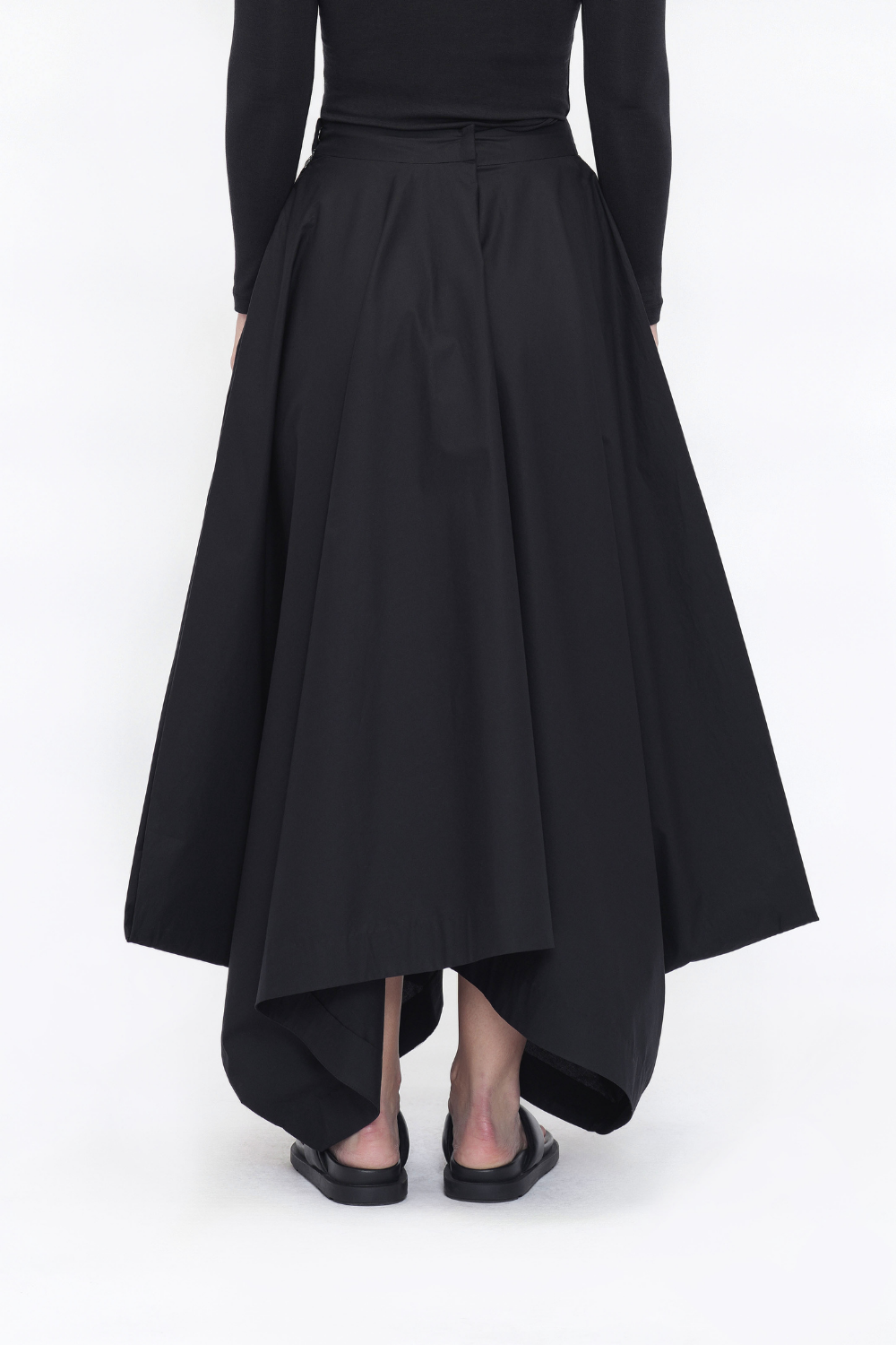Fitted at the waist with an elegant handkerchief asymmetric hemline, the Zema flows with effortless grace. Crafted from crisp cotton poplin, it features an all-around waistband, concealed zip closure, and practical side seam pockets.