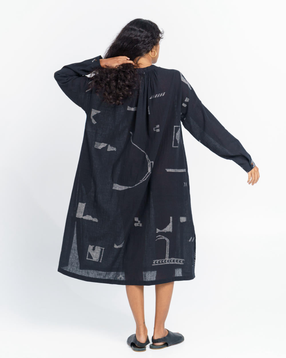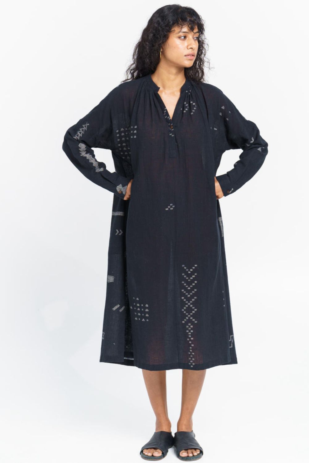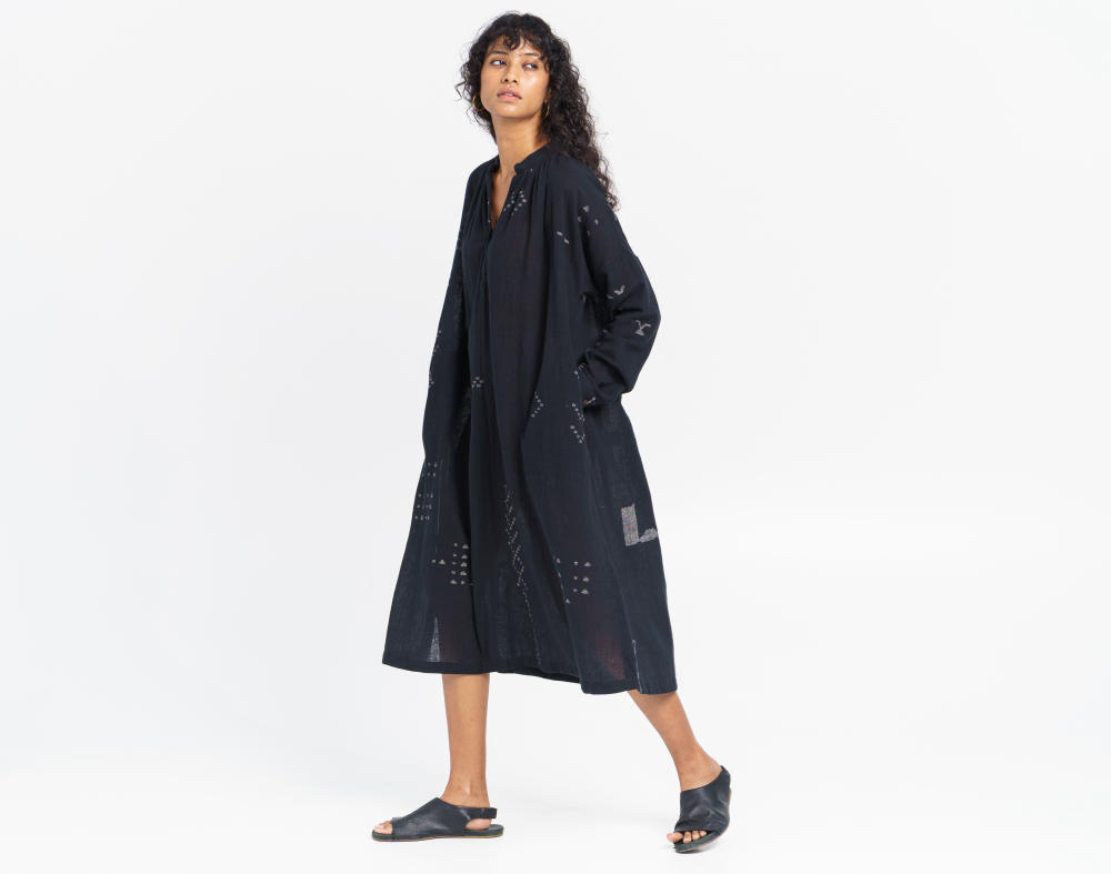 Designed for an oversized fit, this calf-length dress is cut from a beautiful hand-detailed cotton fabric with woven tribal motifs made by talented weavers of India. It features a free-flowing cut and a relaxed stand collar neck framed with playful gentle gathers. Its relaxed full sleeves taper at the wrist with cuff closure. An ideal pick for everyday comfort, casual evenings or travelling.