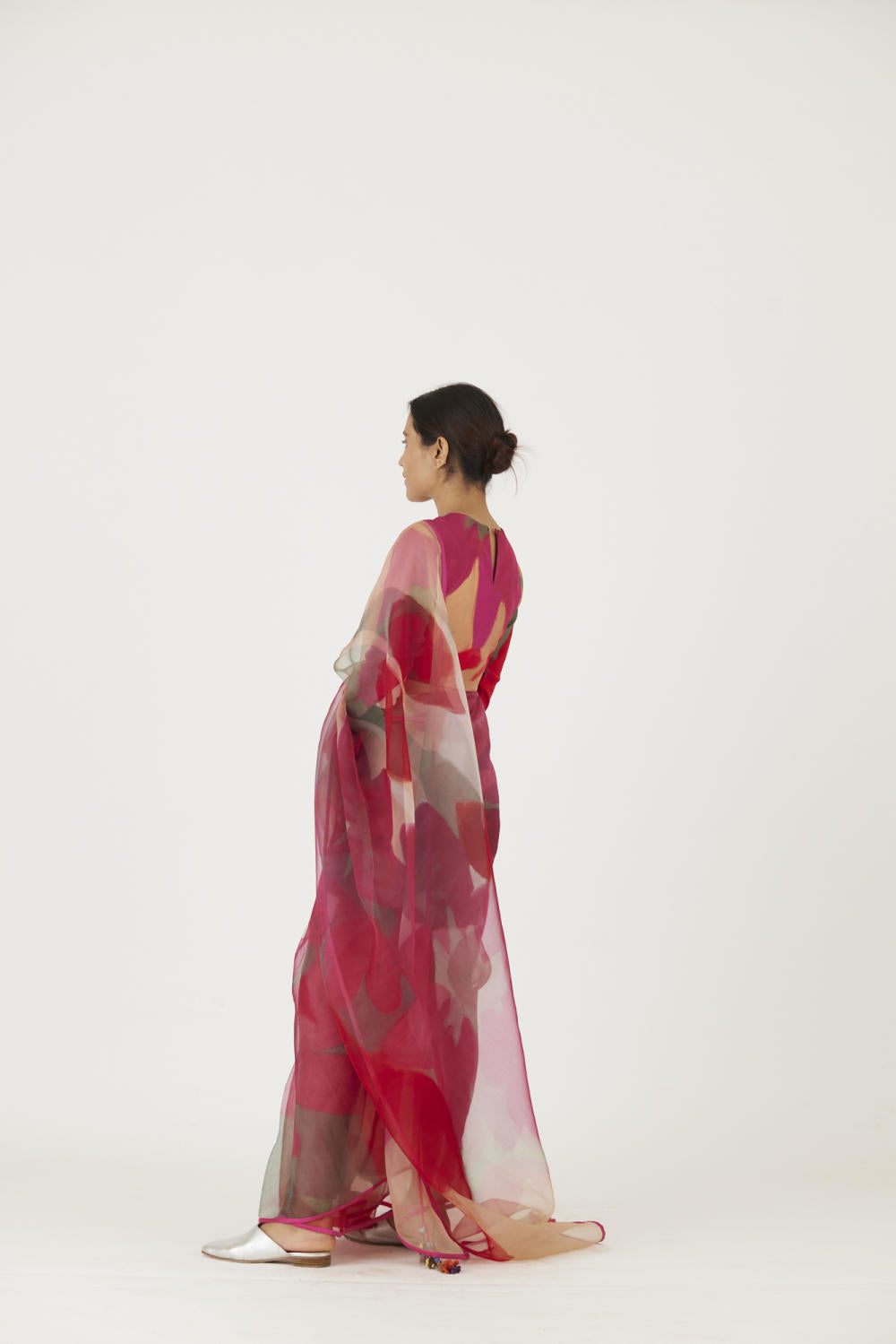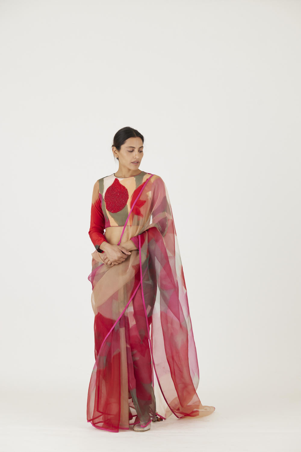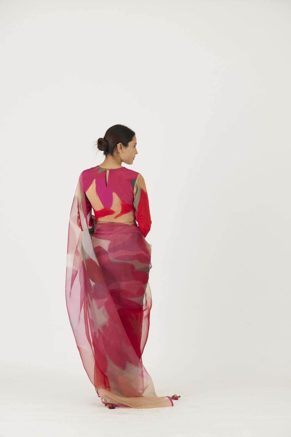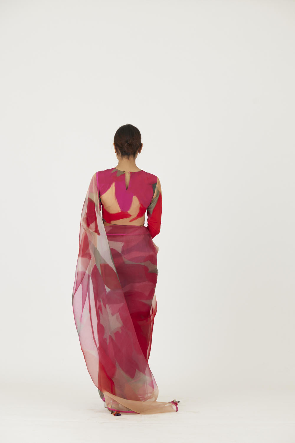 The print is inspired by a rosebud and features a bouquet of flowers and buds in a unique arrangement. The saree is in pure silk organza and is finished with rani pink piping .