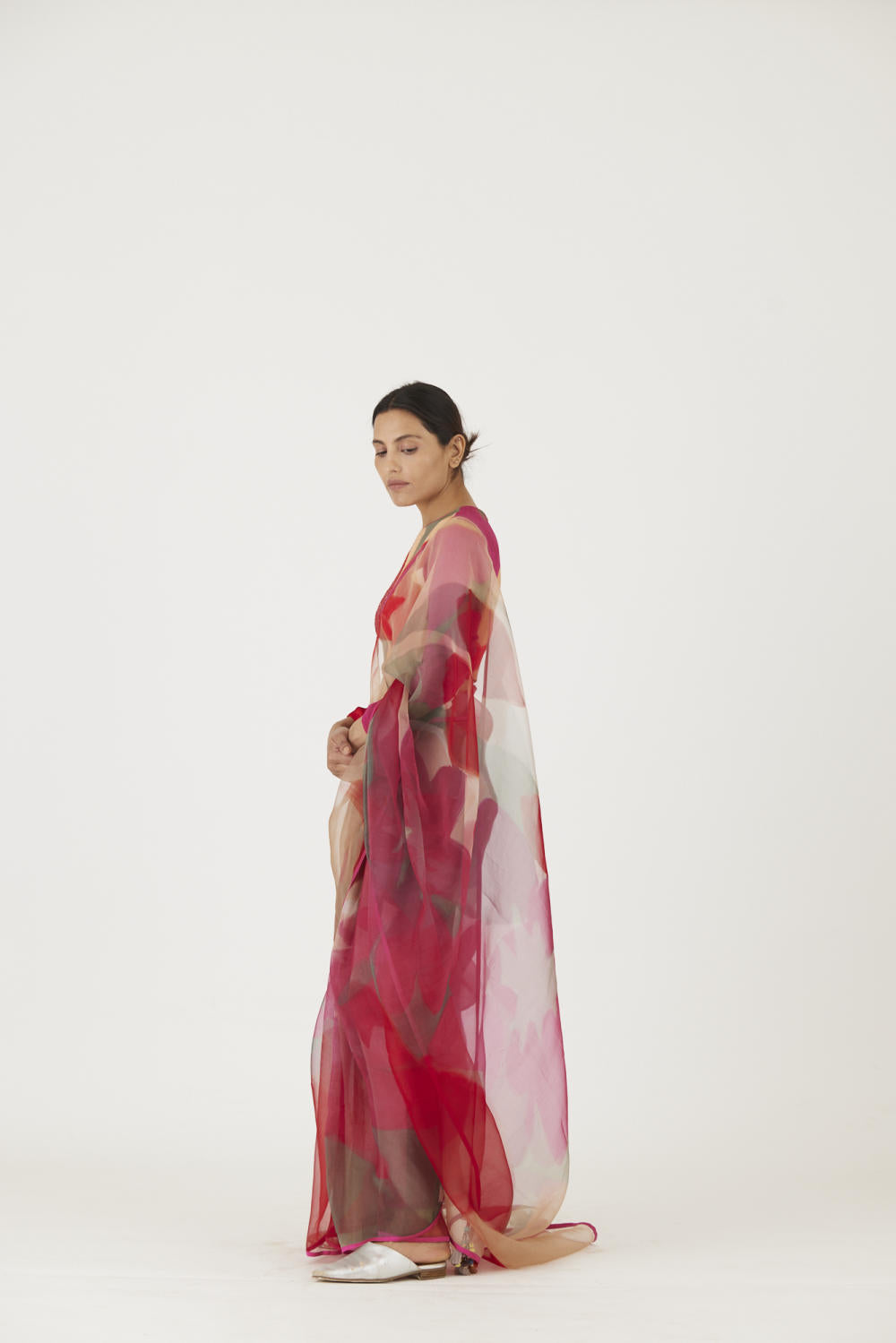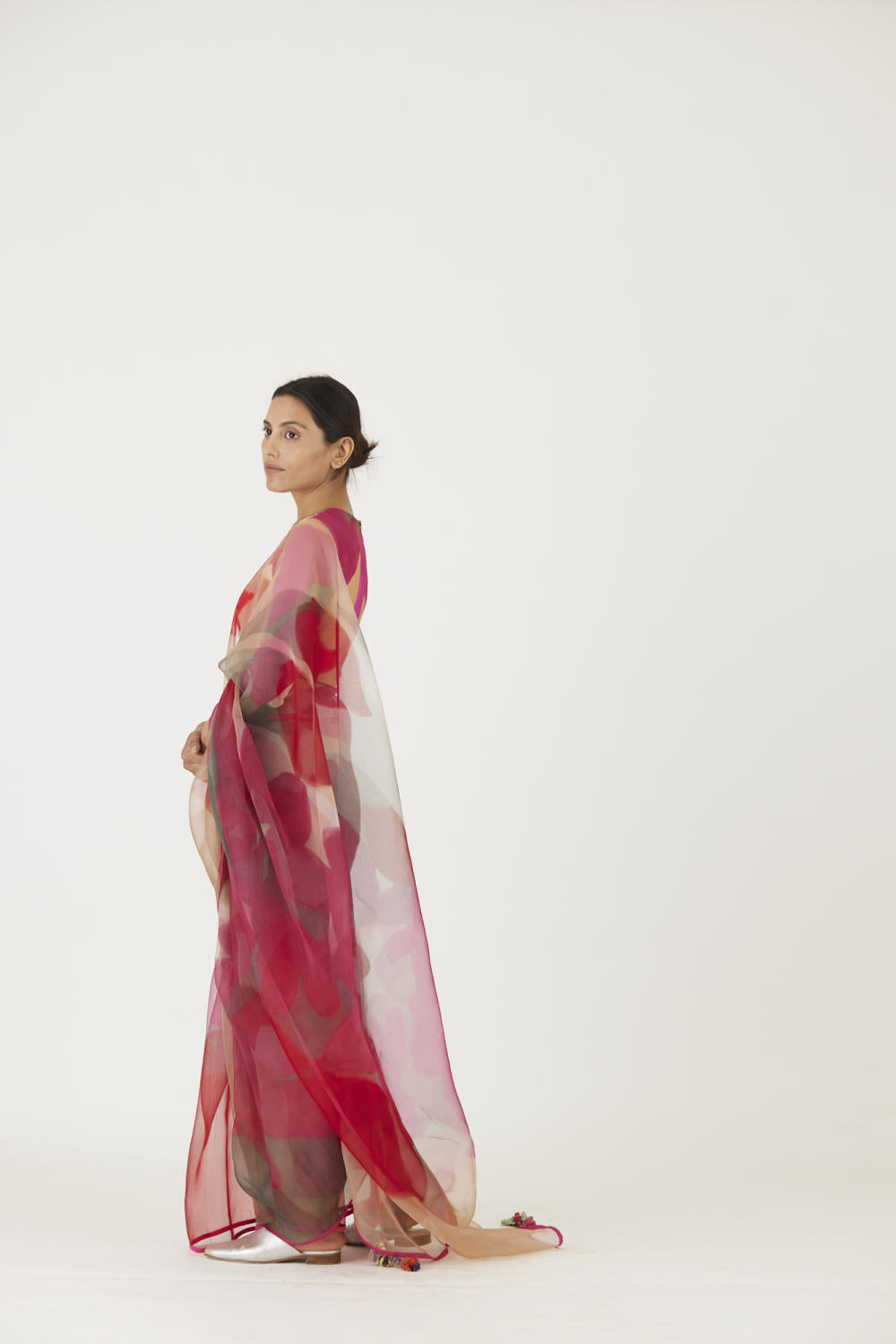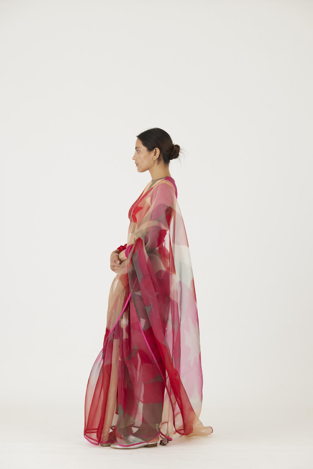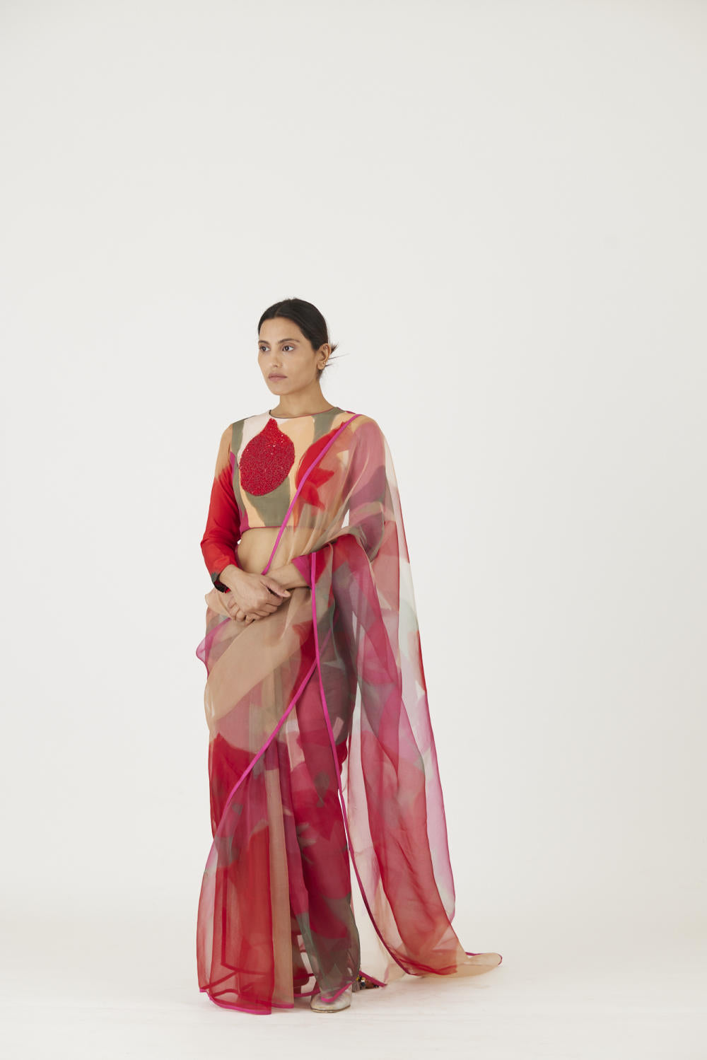 The print is inspired by a rosebud and features a bouquet of flowers and buds in a unique arrangement. The saree is in pure silk organza and is finished with rani pink piping .