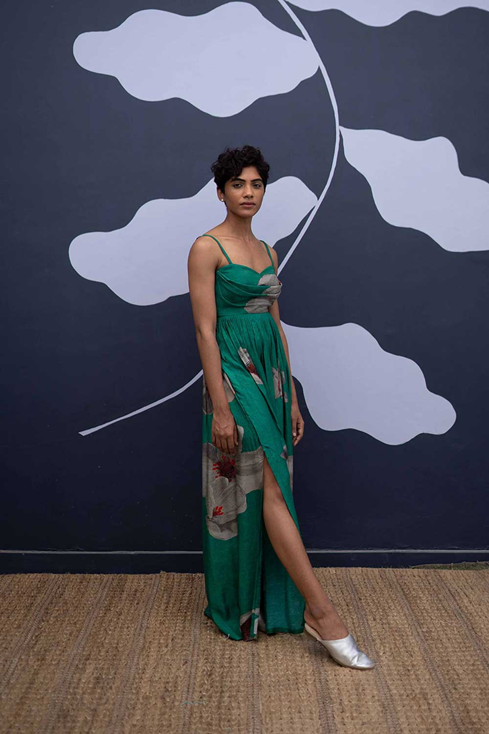 The dress is crafted in a unique green colour with massive white poppies carefully printed on dora silk.