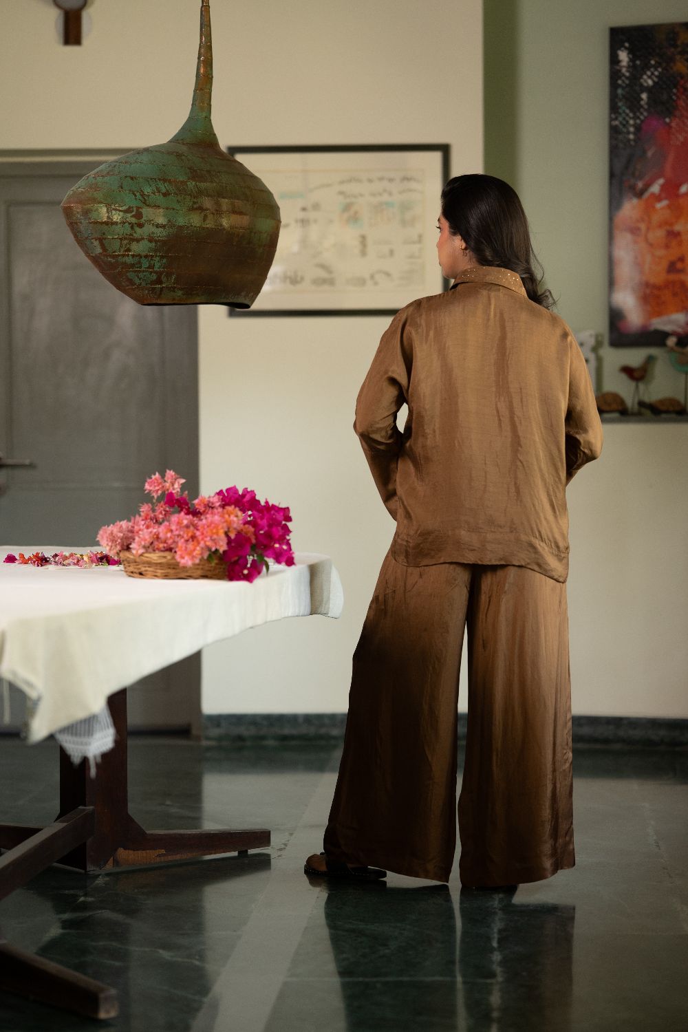 The matching straight-leg trousers bring balance, creating a set that’s as effortless as it is refined
