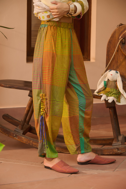 Handwoven Yarn Dyed Silk/Cotton Pant with Side Drawstring and beaded detail.
