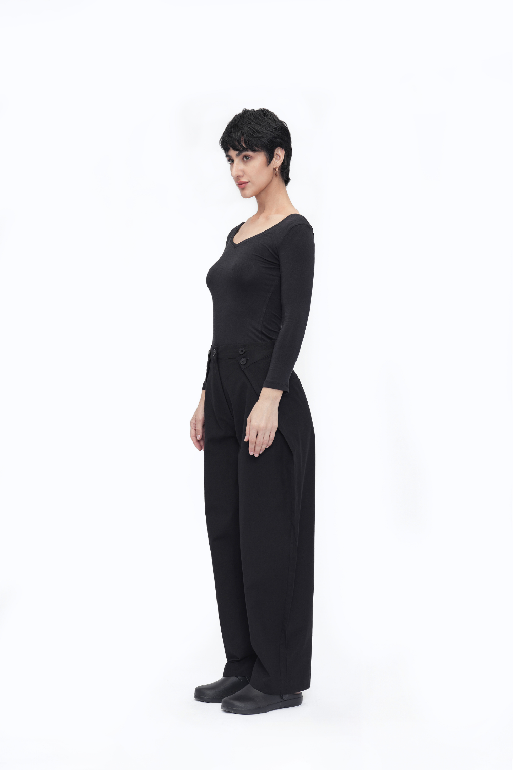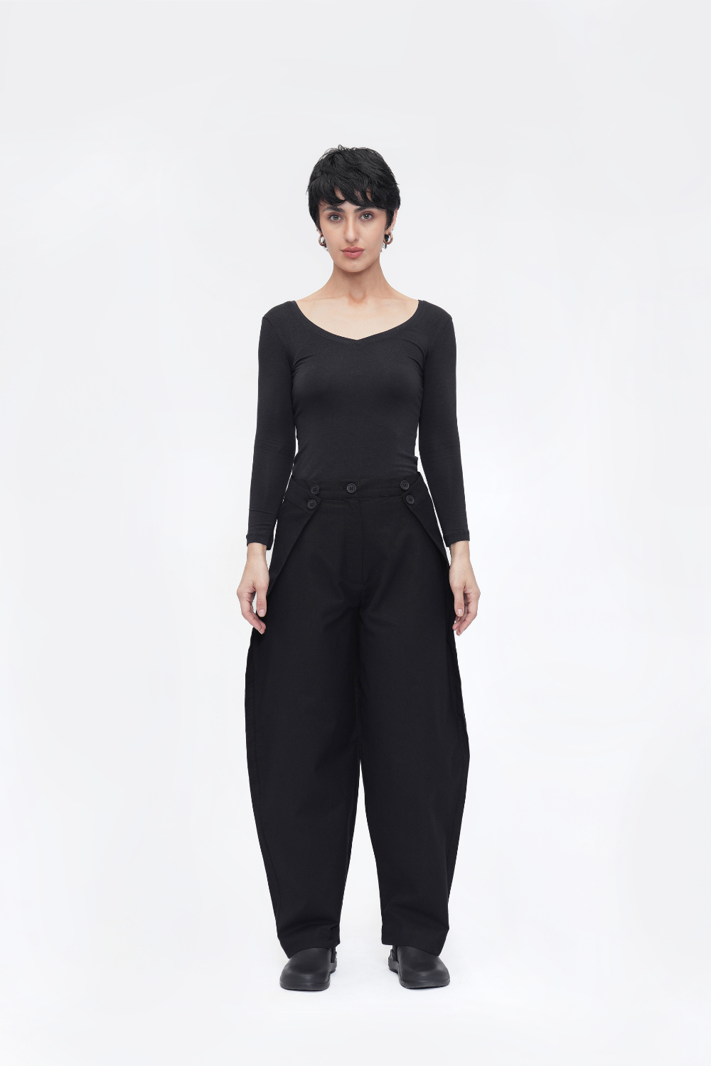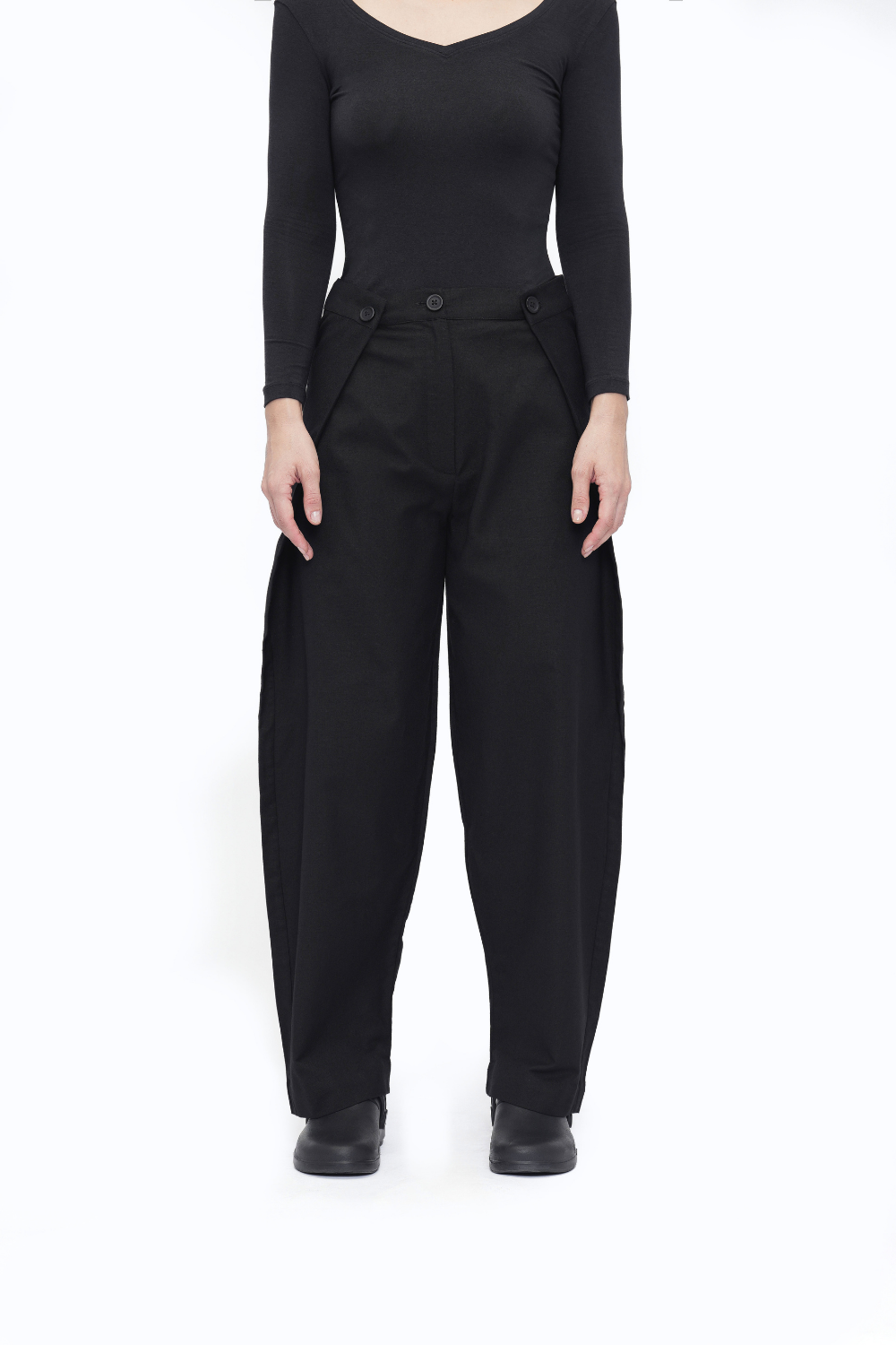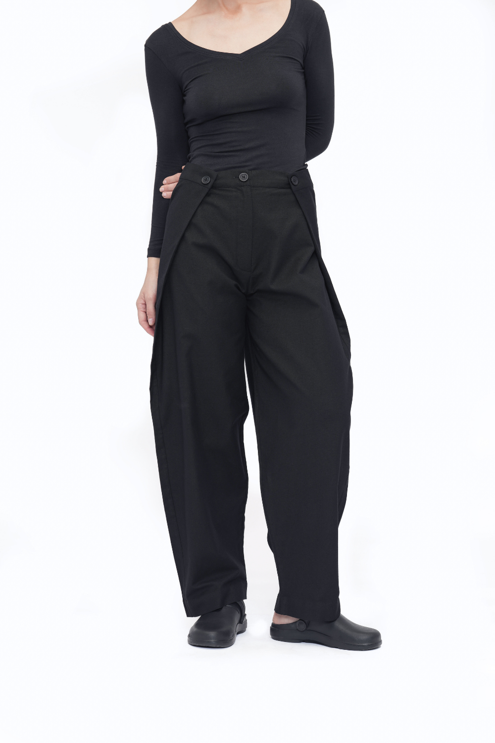 Barrel-fit bottoms with an overlapping design, featuring an all-around waistband and a fly zipper with button closure. Tailored with back darts for a flattering shape and finished with back welt pockets, crafted from comfortable cotton flex fabric. Sharp yet easy for everyday structure.