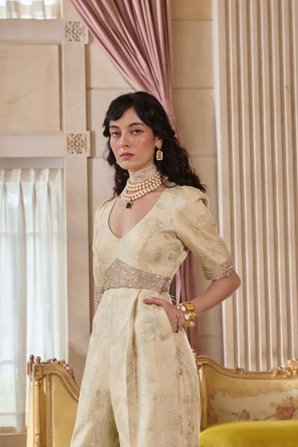 This ivory jacquard jumpsuit features a flattering fit with embroidered waist detailing and subtle puff sleeves finished with embroidery at the sleeve hem—adding just the right touch of glam and charm.