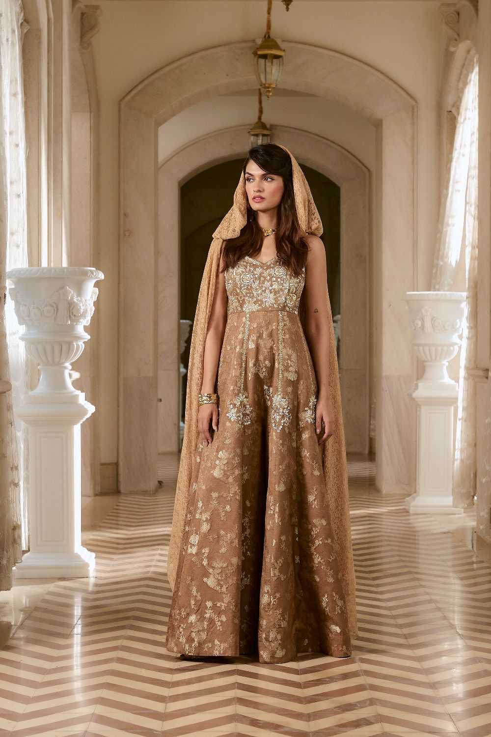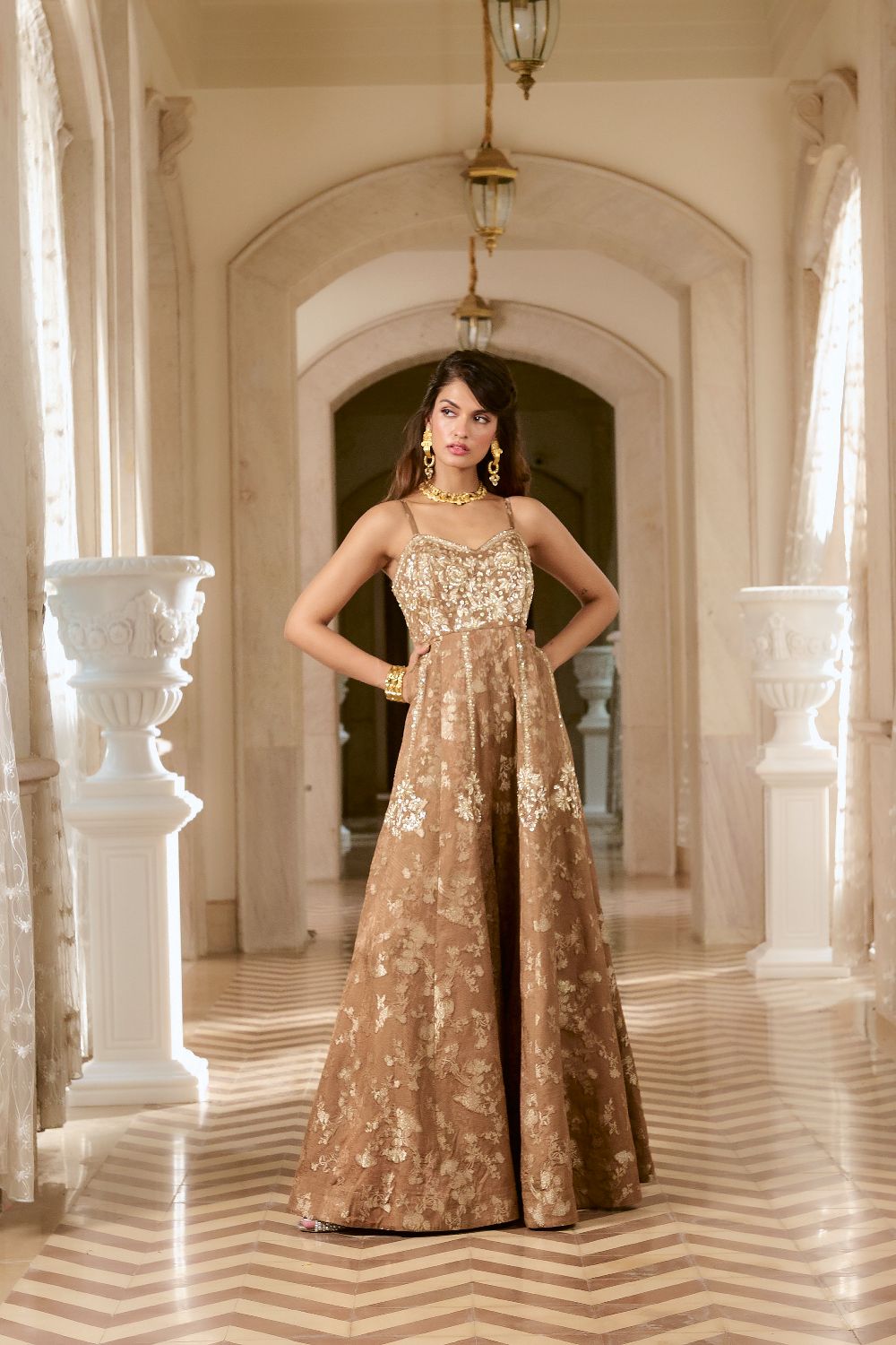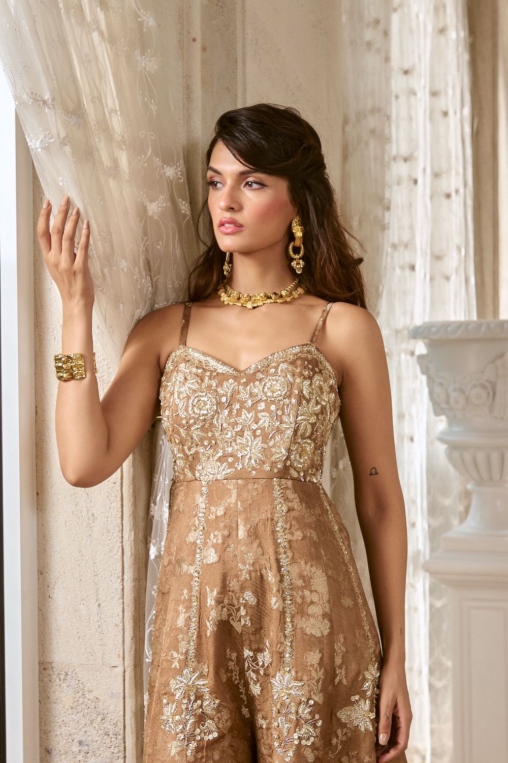 A rich brown jumpsuit crafted in lustrous silver jacquard, featuring a sleeveless silhouette that exudes modern sophistication. The front yoke is fully adorned with intricate zardozi hand embroidery, which gracefully extends below the yoke, adding depth and elegance to the ensemble.