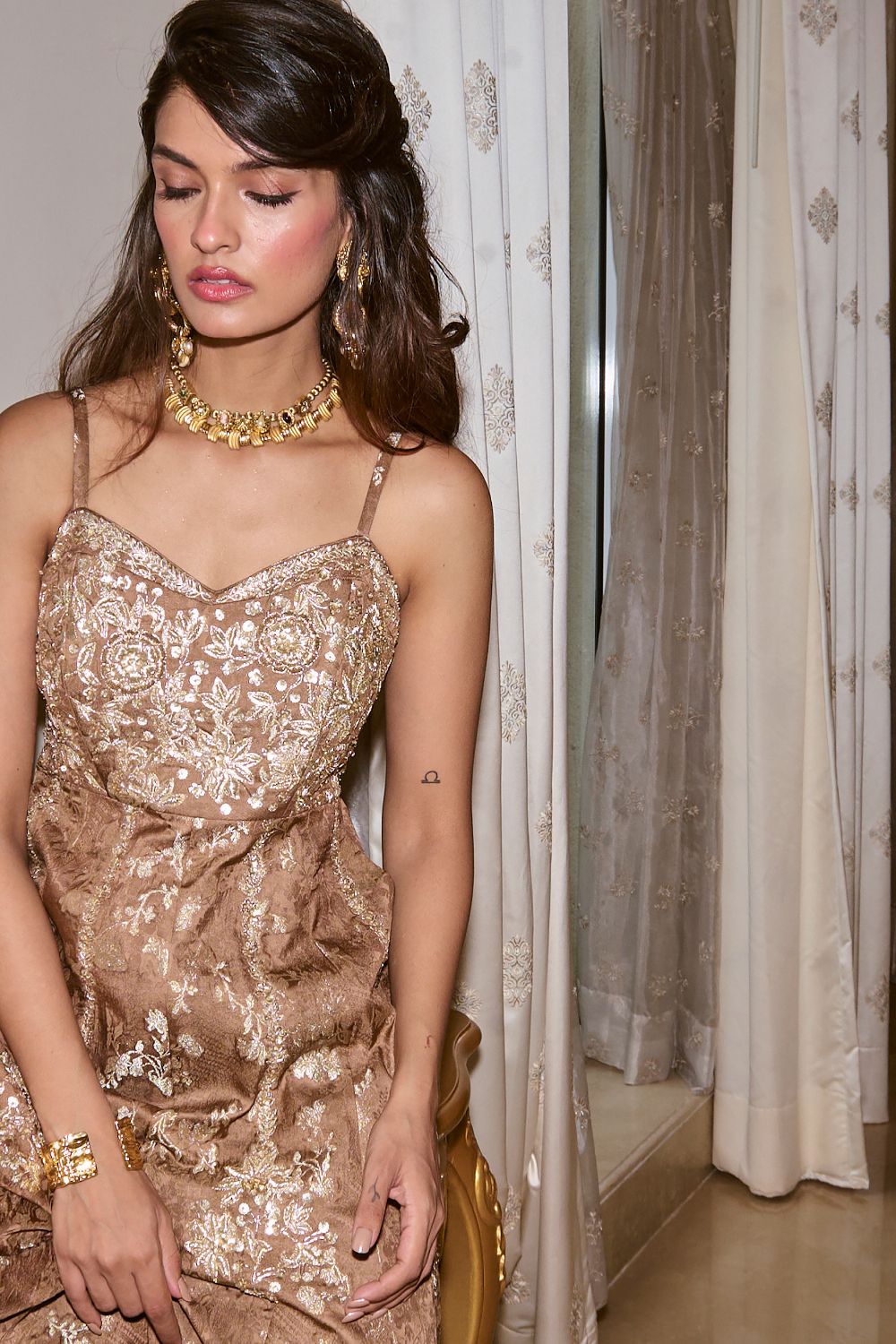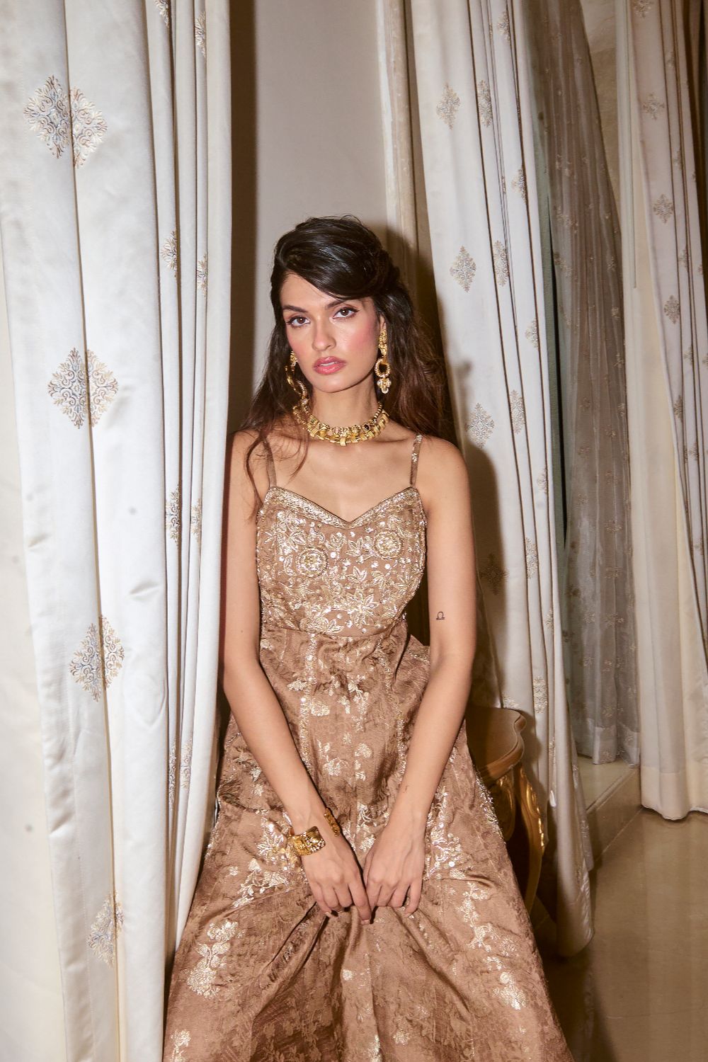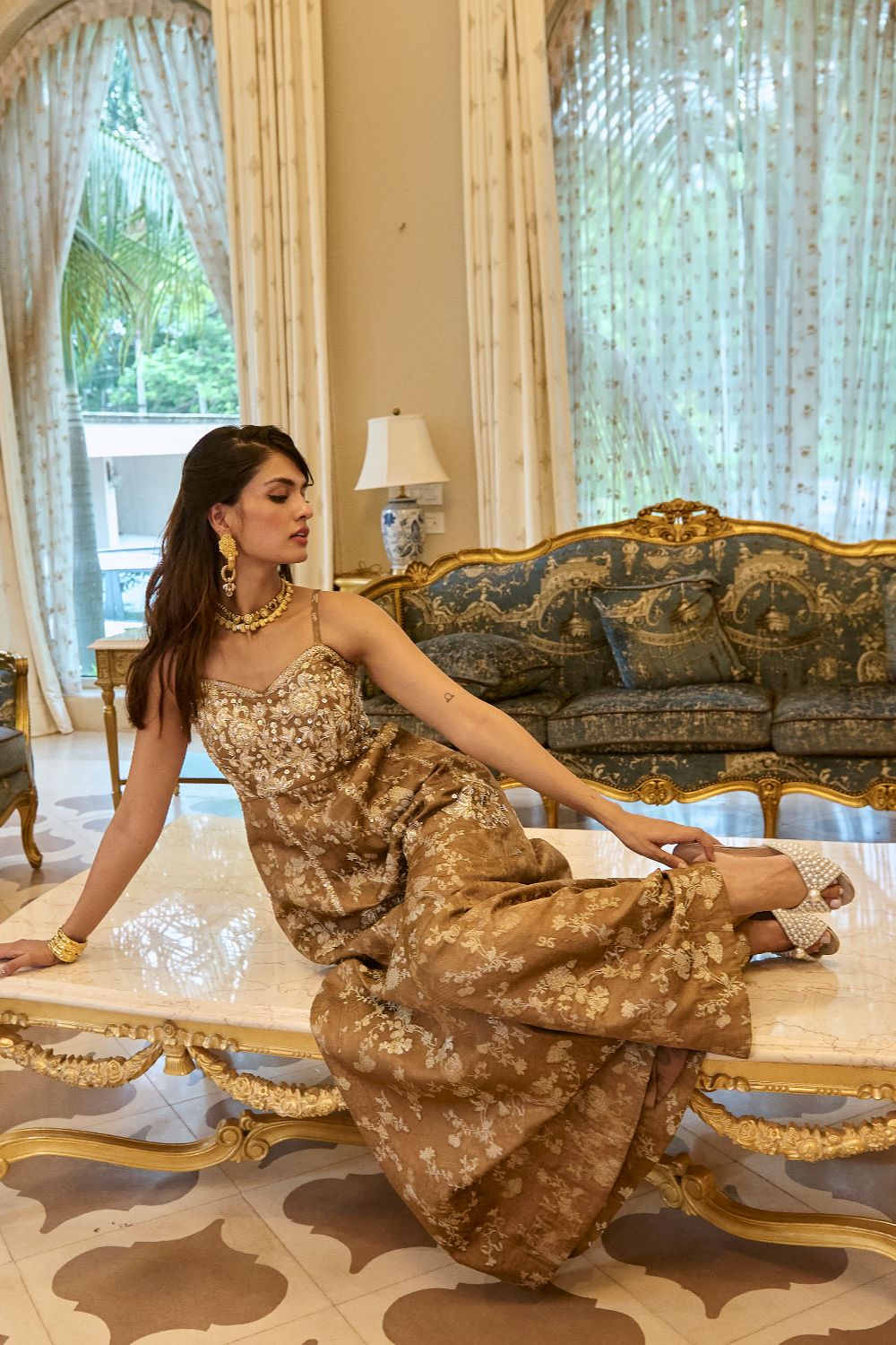 Every collection begins long before the garment is stitched: months of research into India’s rich craft traditions, followed by the painstaking creation of detailed illustrations. These artworks are then scanned, enhanced with jewel-toned palettes and touches of rich gold, and finally translated onto fabric. The result is a visual language so distinct that their name has become synonymous with print, colour, and the kind of glamour that still feels feather-light.