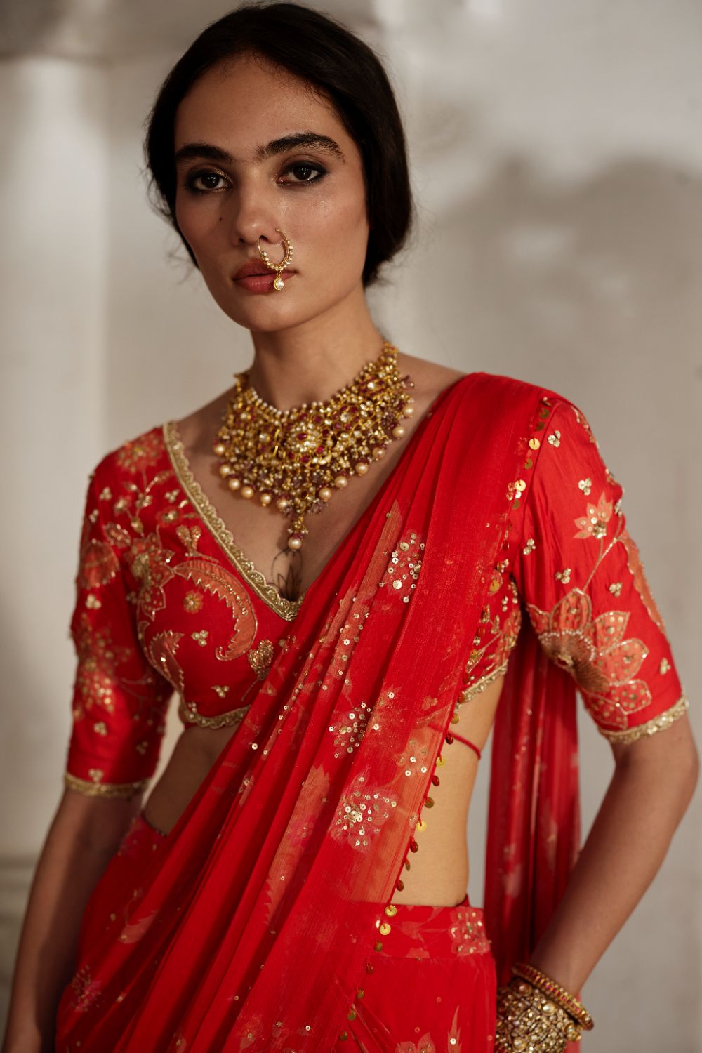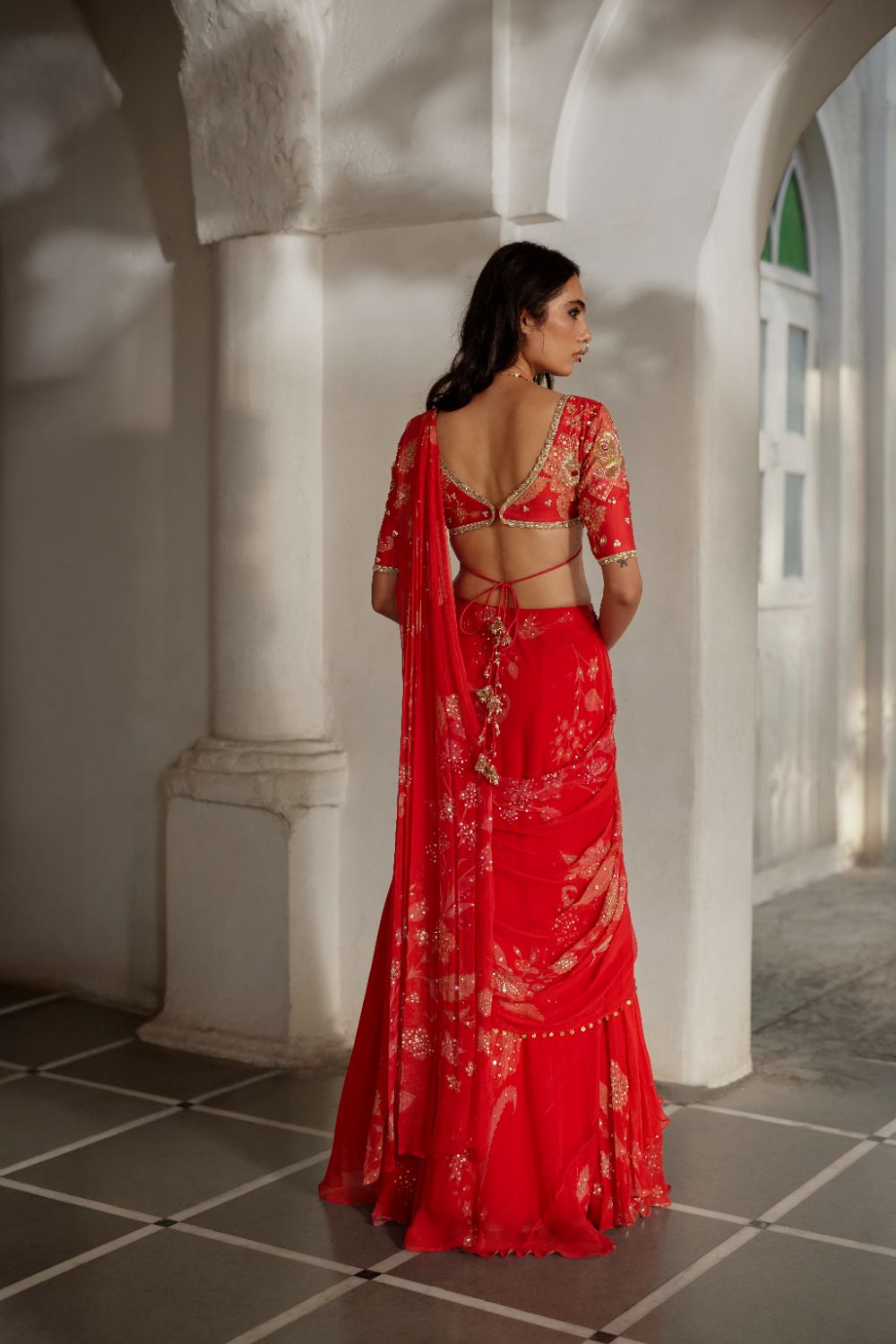 A signature floral-printed blouse in a refined silhouette, fully hand-embroidered with detailed borders and hand-tucked tassels. Paired with a pre-draped matching saree featuring a subtly sequin-highlighted pallu for effortless elegance.