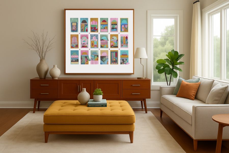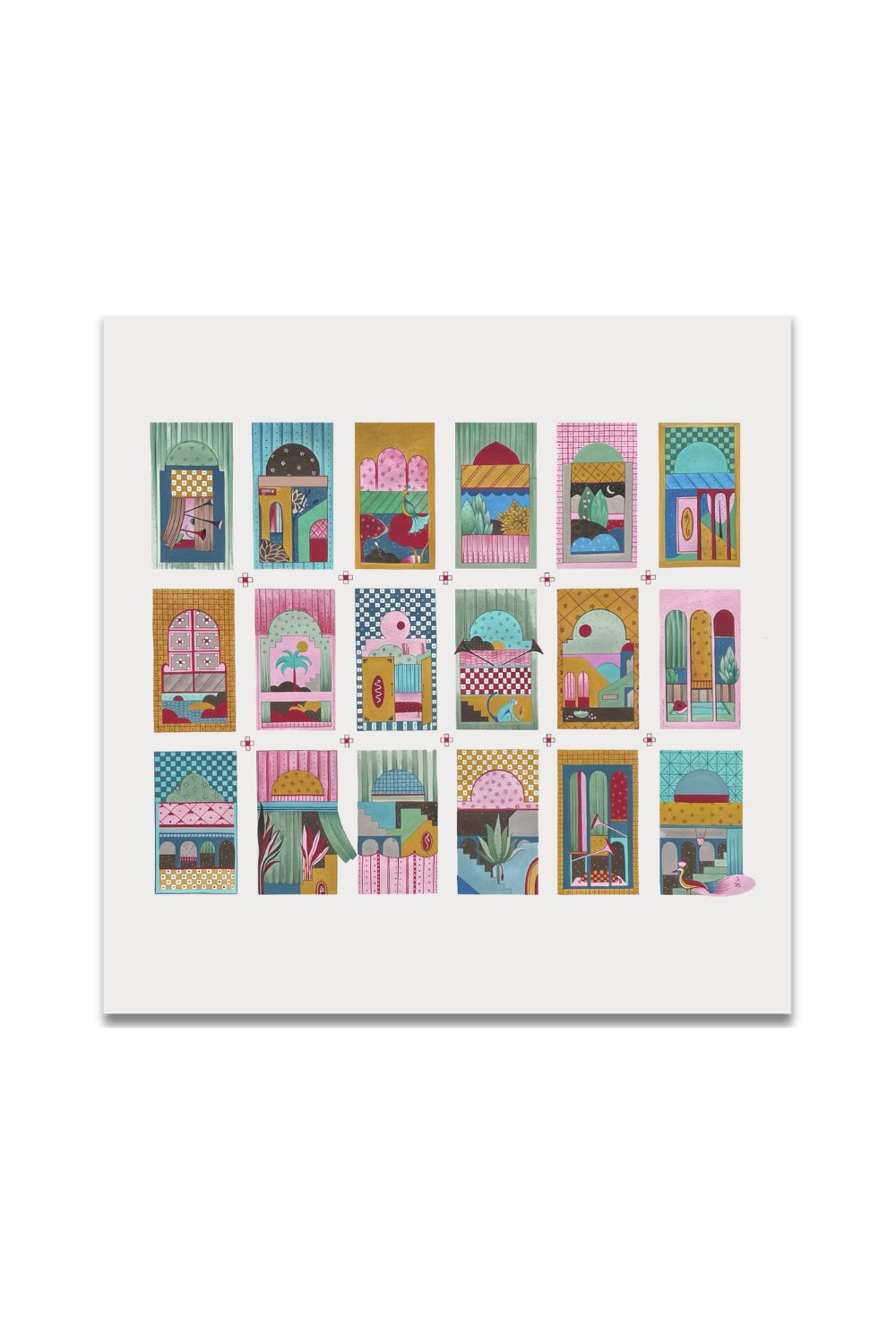 Each piece begins with a study of shape and hue — colours borrowed from mango skies and twilight hours — before she layers in the imaginary: architecture, flora, figures, and symbolic objects that appear to belong to another time. The result is an immersive visual language that oscillates between the real and the fantastical, evoking both nostalgia and curiosity.