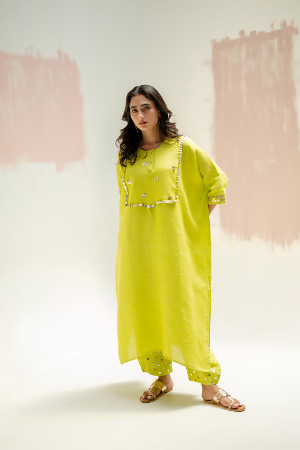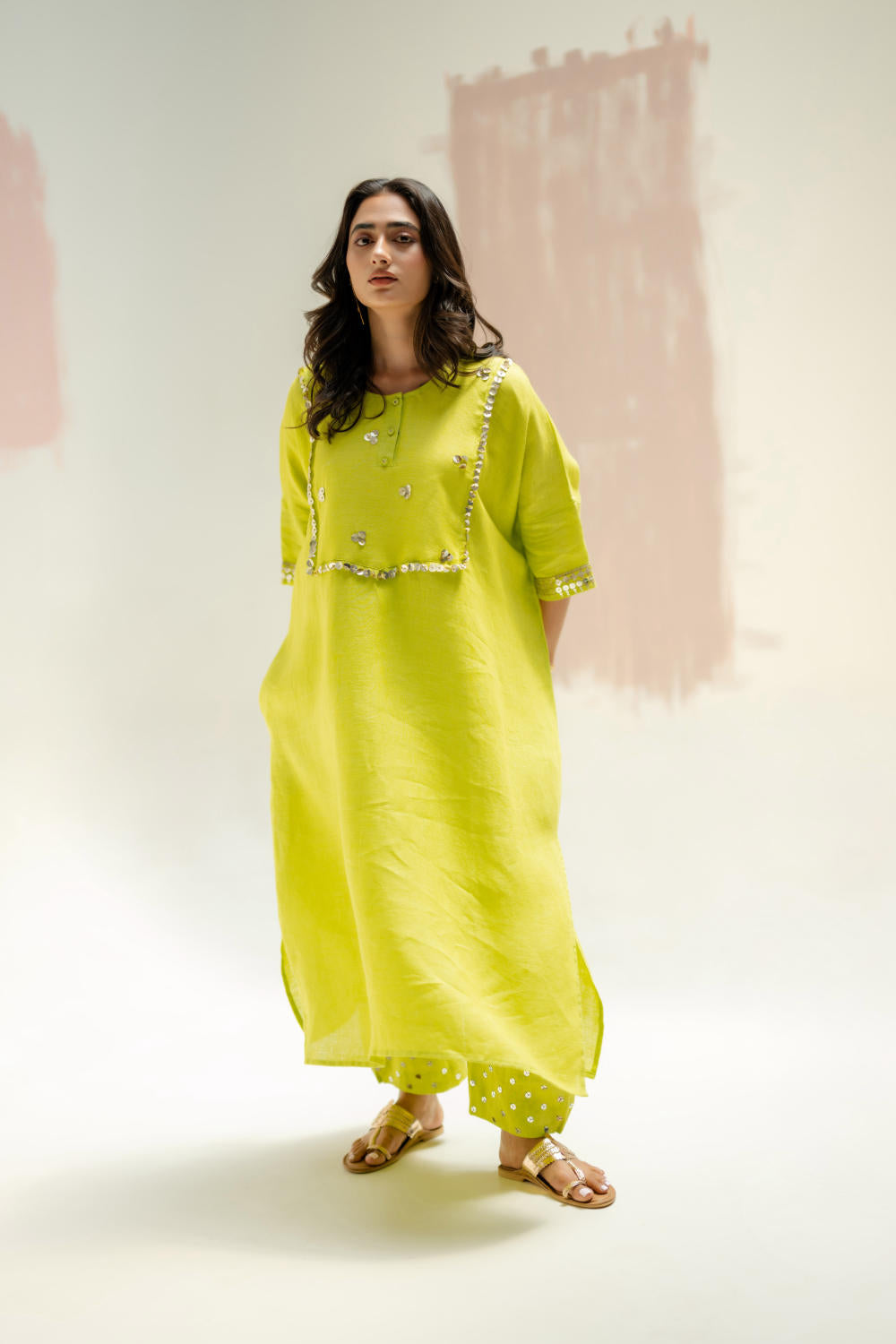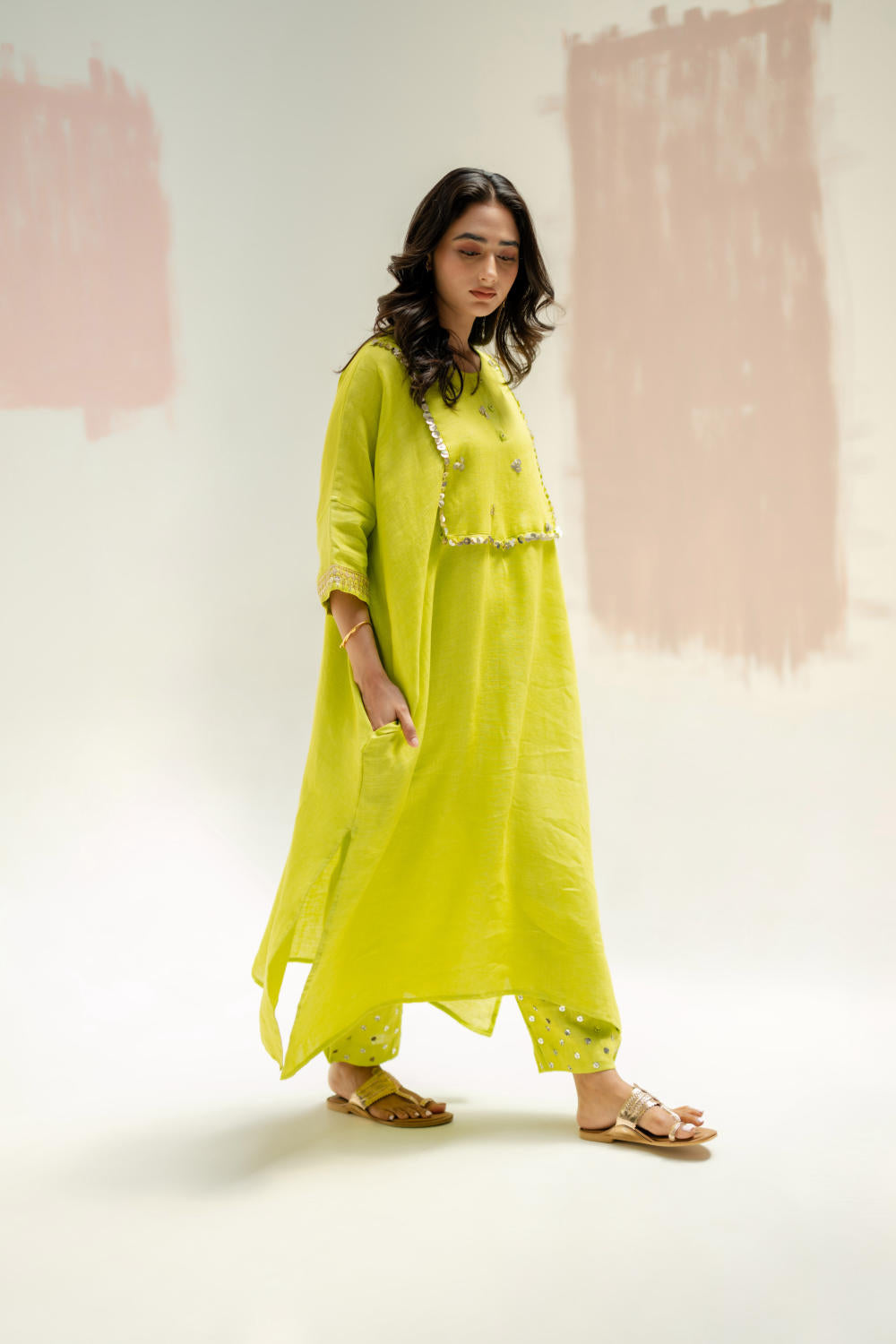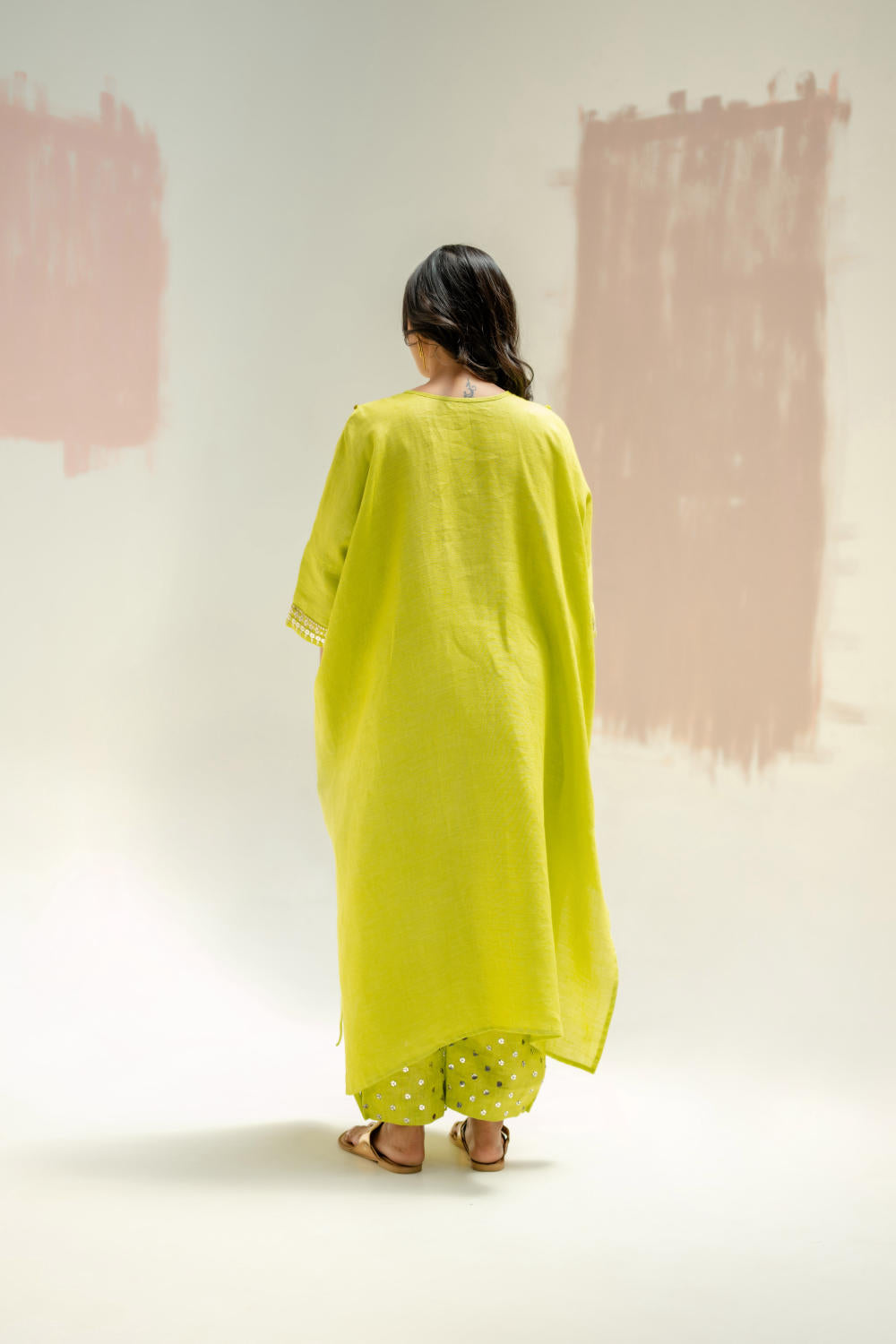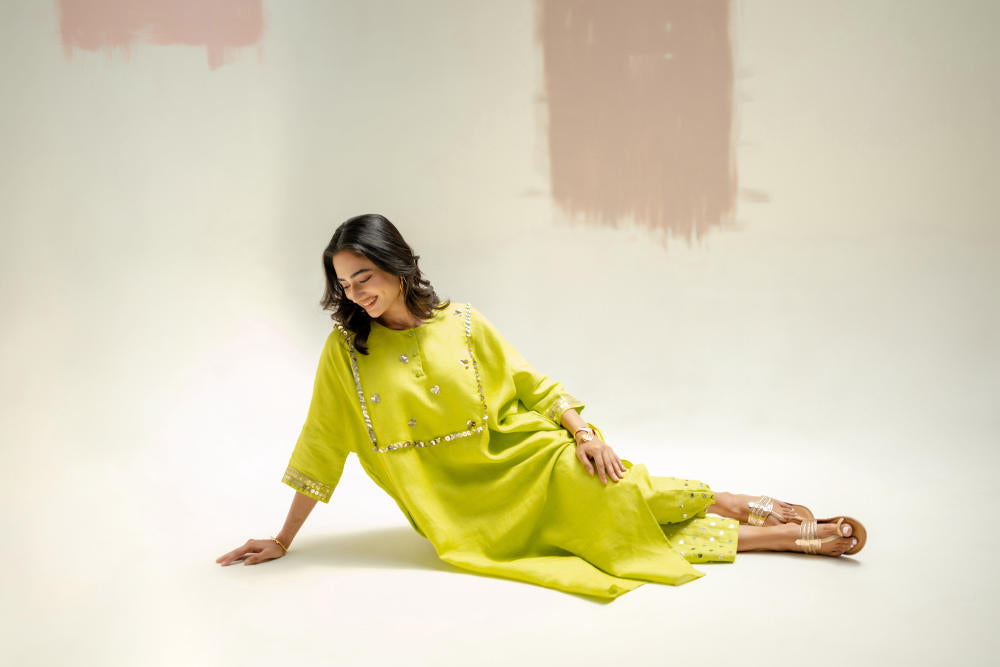 The pure linen longline kaftan kurta set has become a highly sought-after dress, known for its elegant design and comfort. The hand-embroidered yoke and wide sleeves add intricate detailing. Paired with comfortable linen pants, delicately embroidered and gathered at the hem for a stylish touch