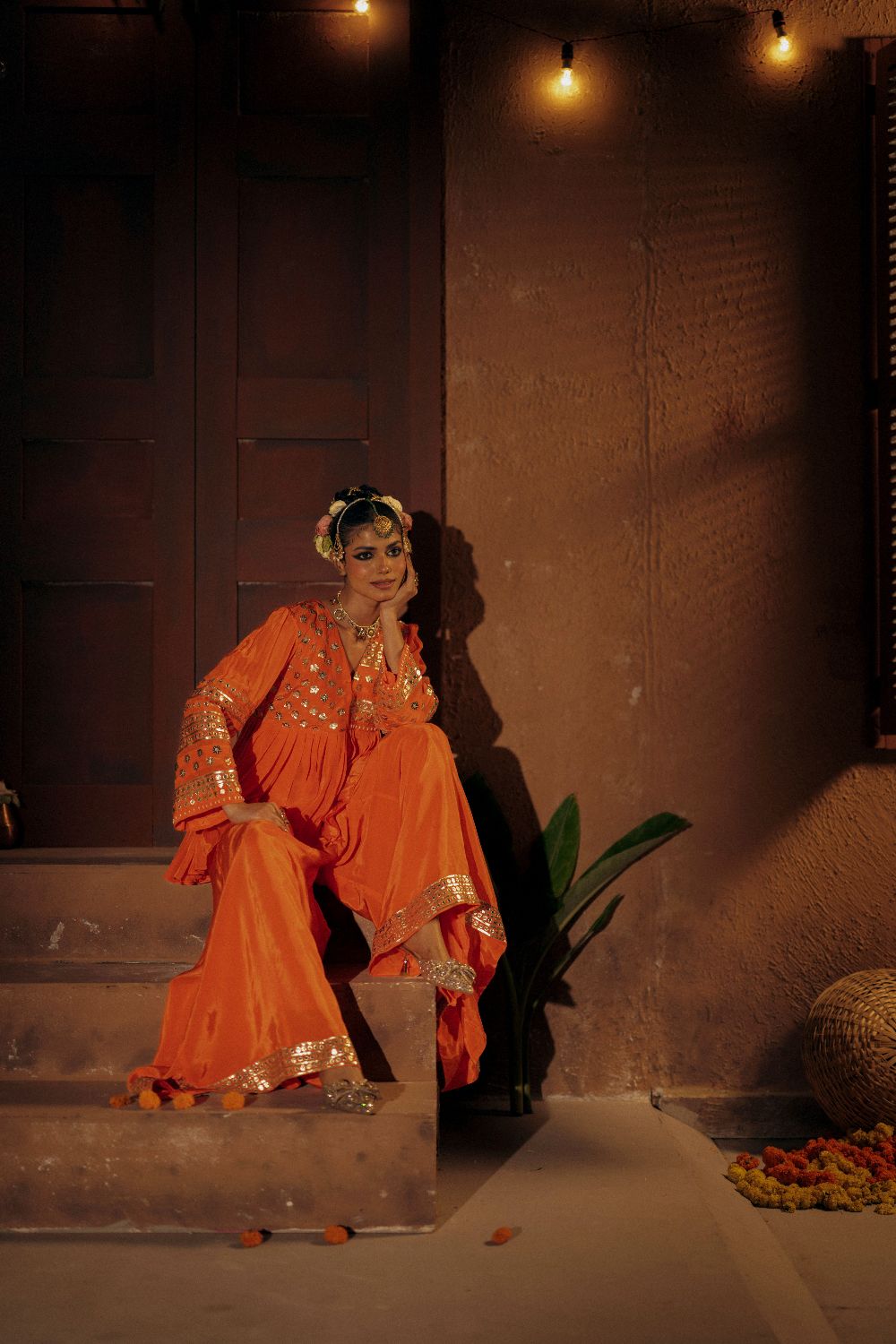 A vibrant and effortless ensemble, this celebratory set features a radiant orange pleated top paired with flowing kali palazzos. Lightweight, flattering, and full of movement, it blends festive charm with everyday comfort. Perfect for celebrations or evenings when you want to feel bright, stylish, and beautifully at ease.