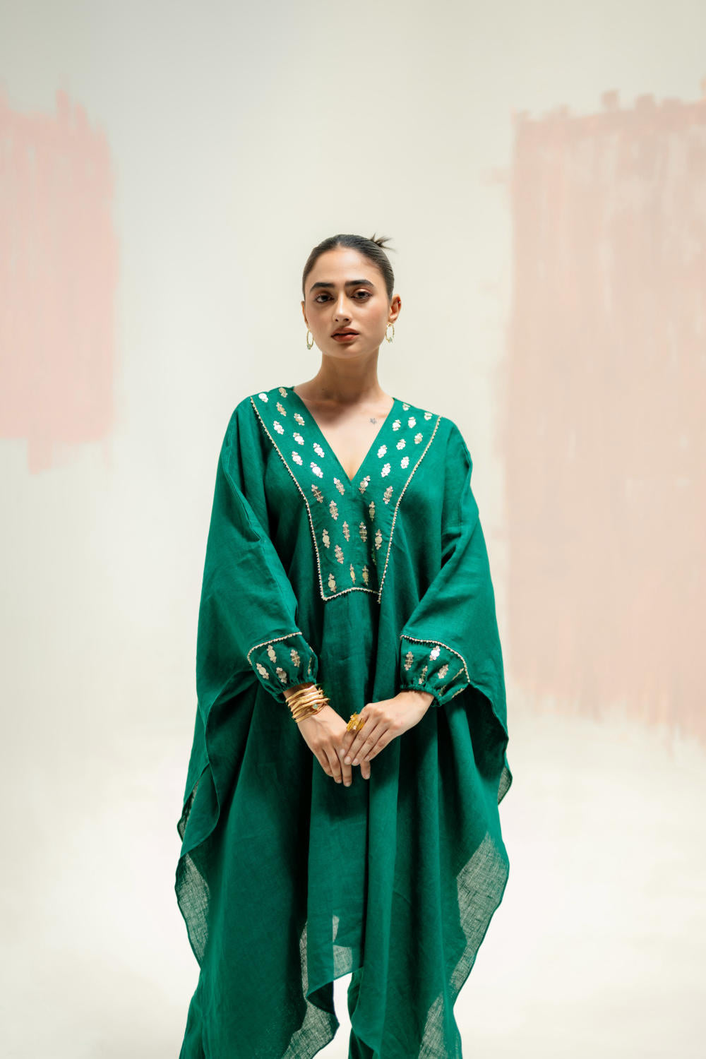 The green Kaftan Kurta Set features a best-selling free-fall silhouette with a V-neckline and hand-embroidered cuffs. Paired with slim linen pants, it offers effortless style and comfort for any occasion.