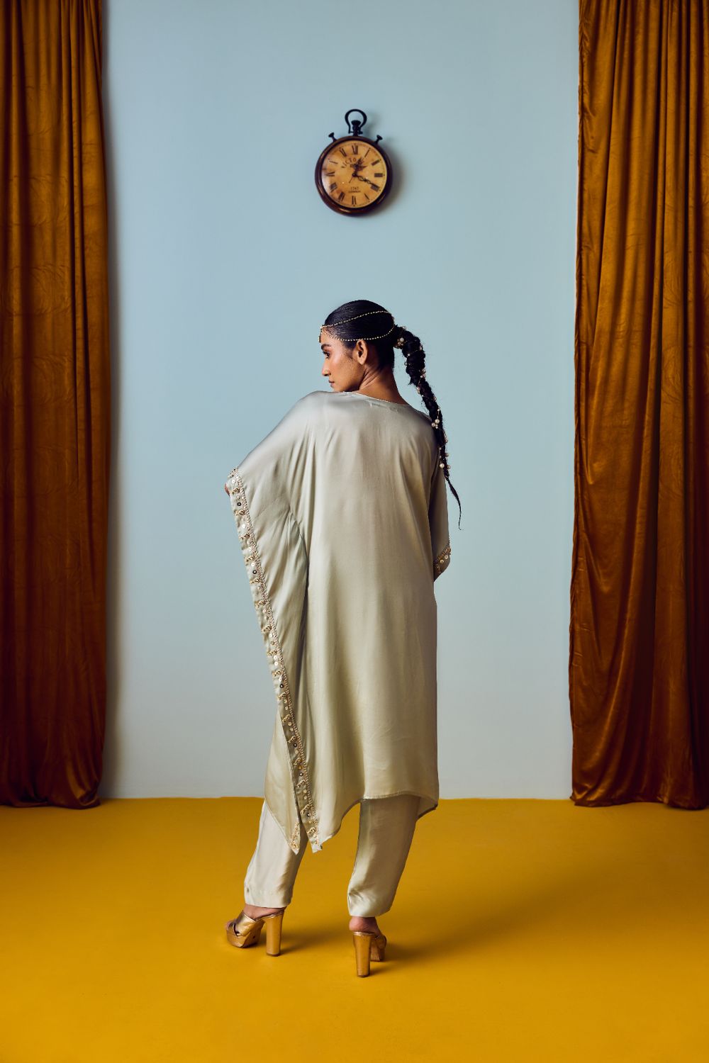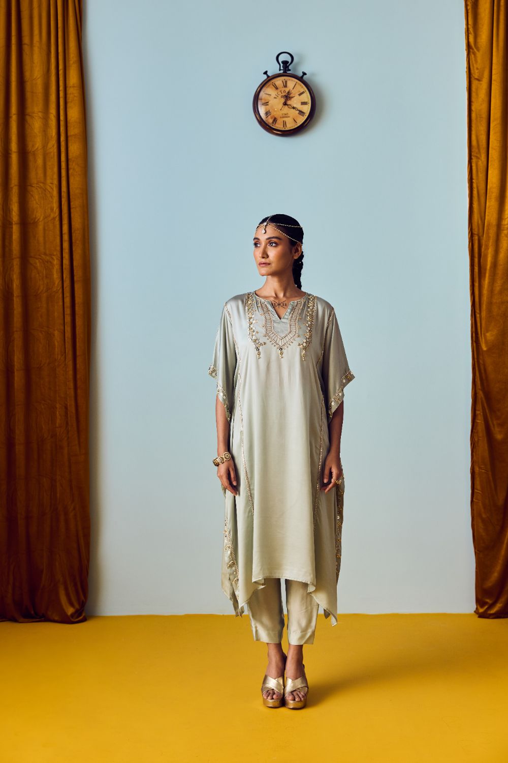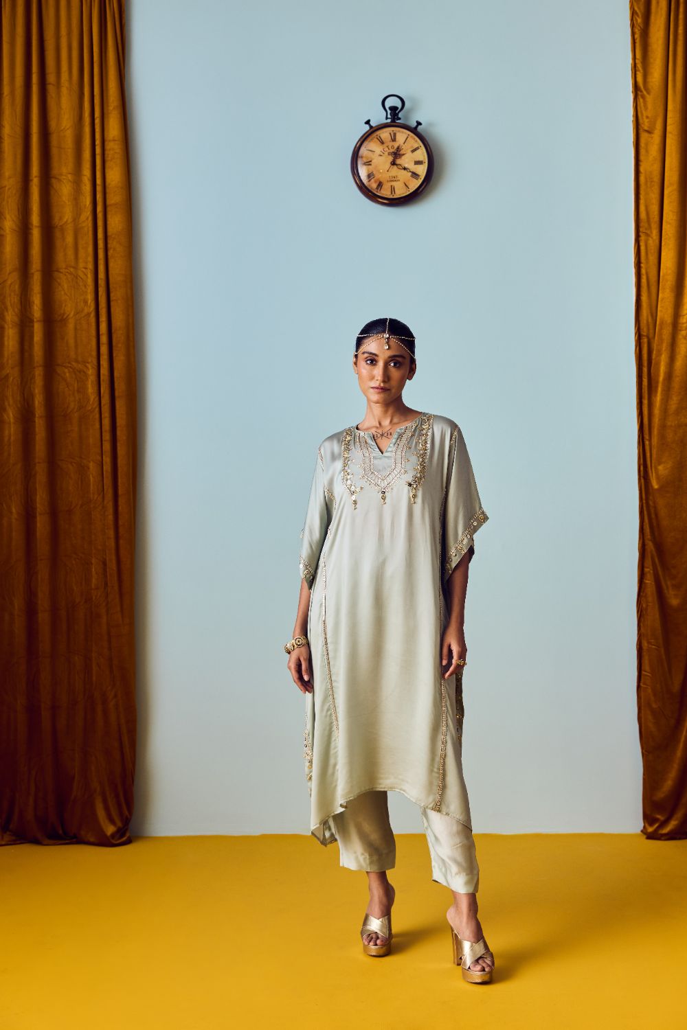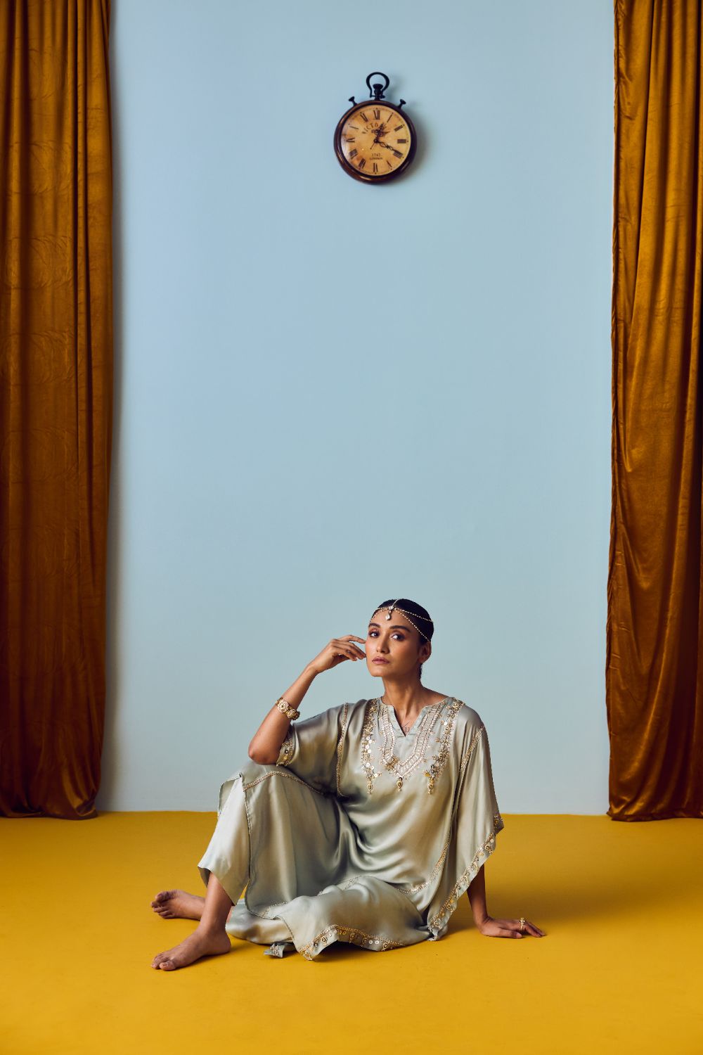 Celebrate in comfort and style with this elegant two-piece set featuring a hand-embroidered, anti-fit kaftan in a relaxed, regular-length silhouette. Subtle shaping stitches from below the bust to mid-length add gentle structure without compromising ease. Paired with elasticated straight-fit pants for a clean, tailored look. Model wears size S.
