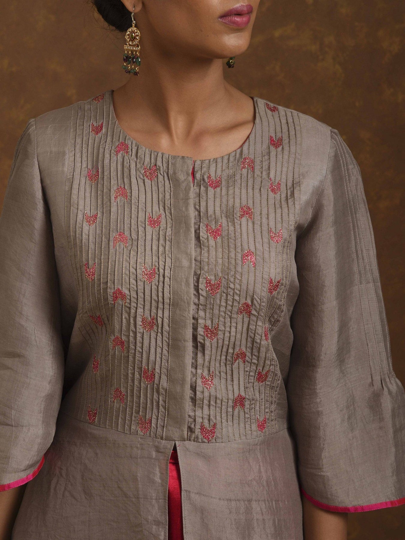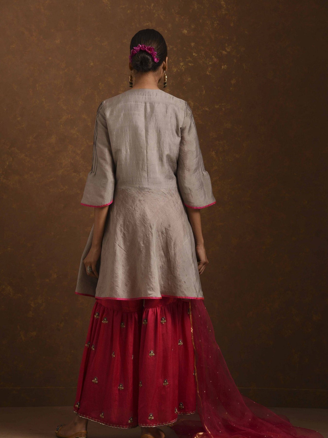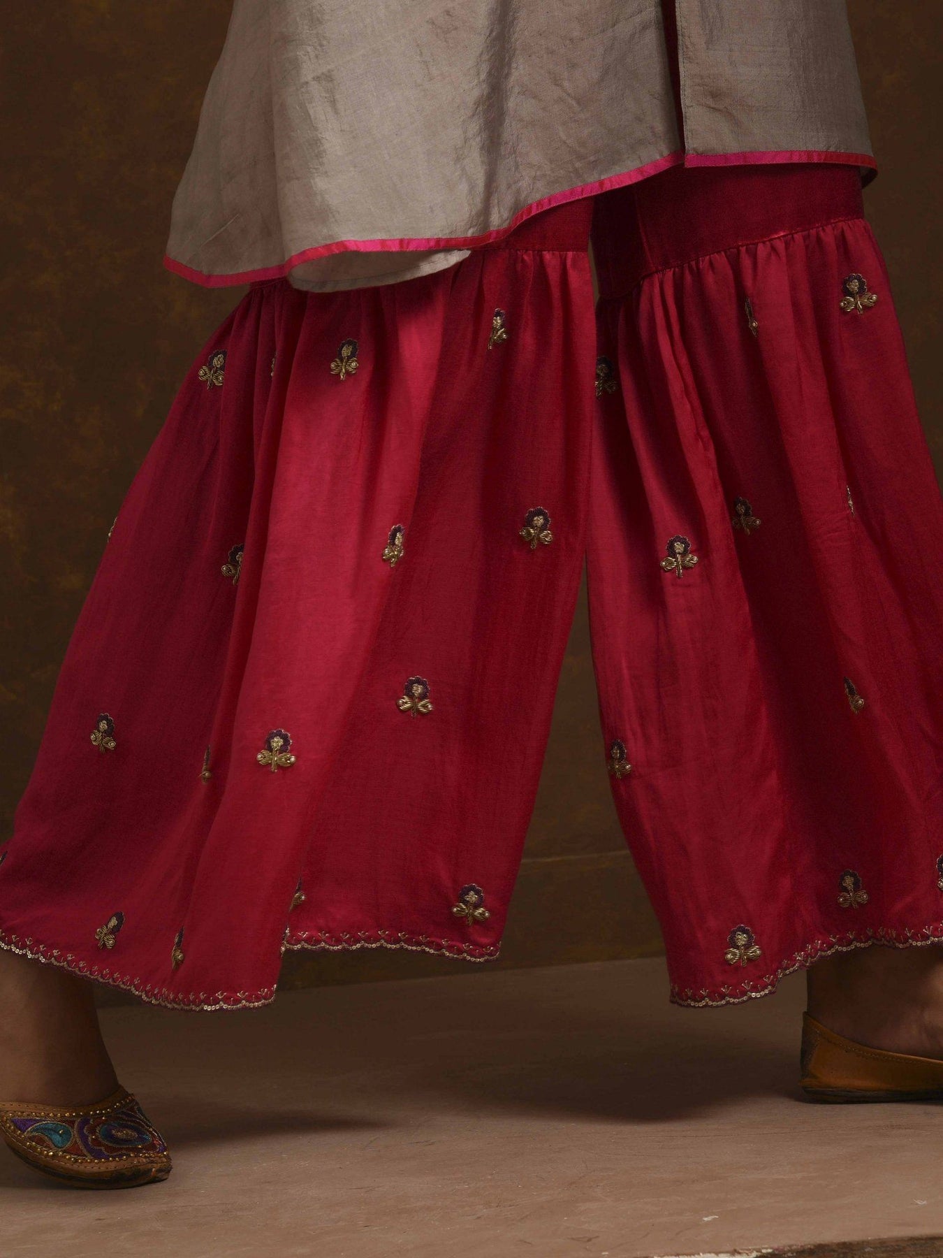 Textured and embroidered silk tunic, dupatta, mashroo zardozi embroidered gharara pants, zardozi handwork