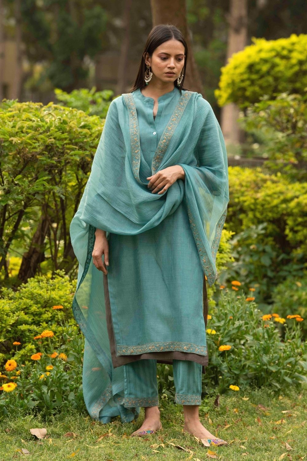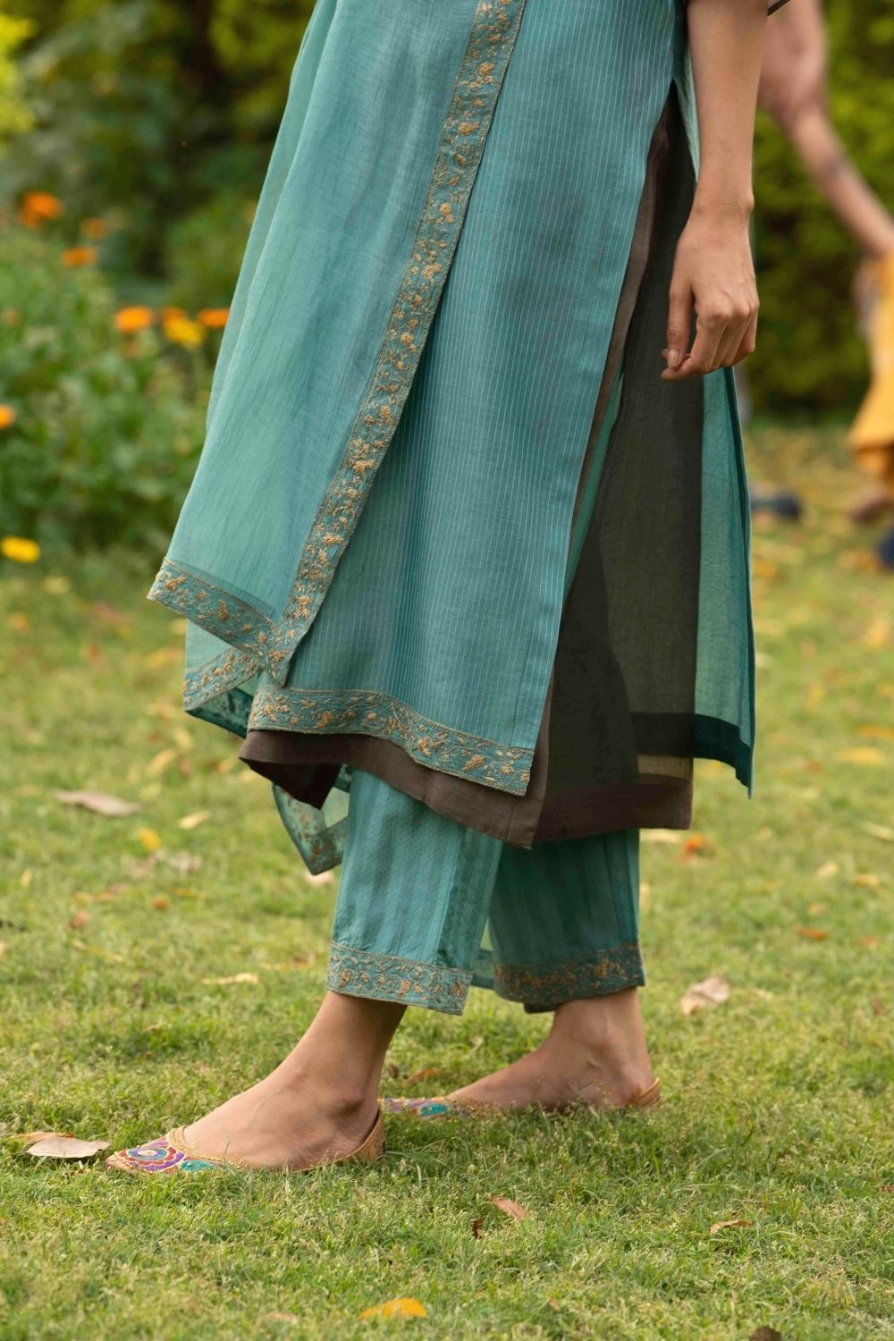 Unusual combination, double layer smart kurta with Till embroidered pants and dupatta