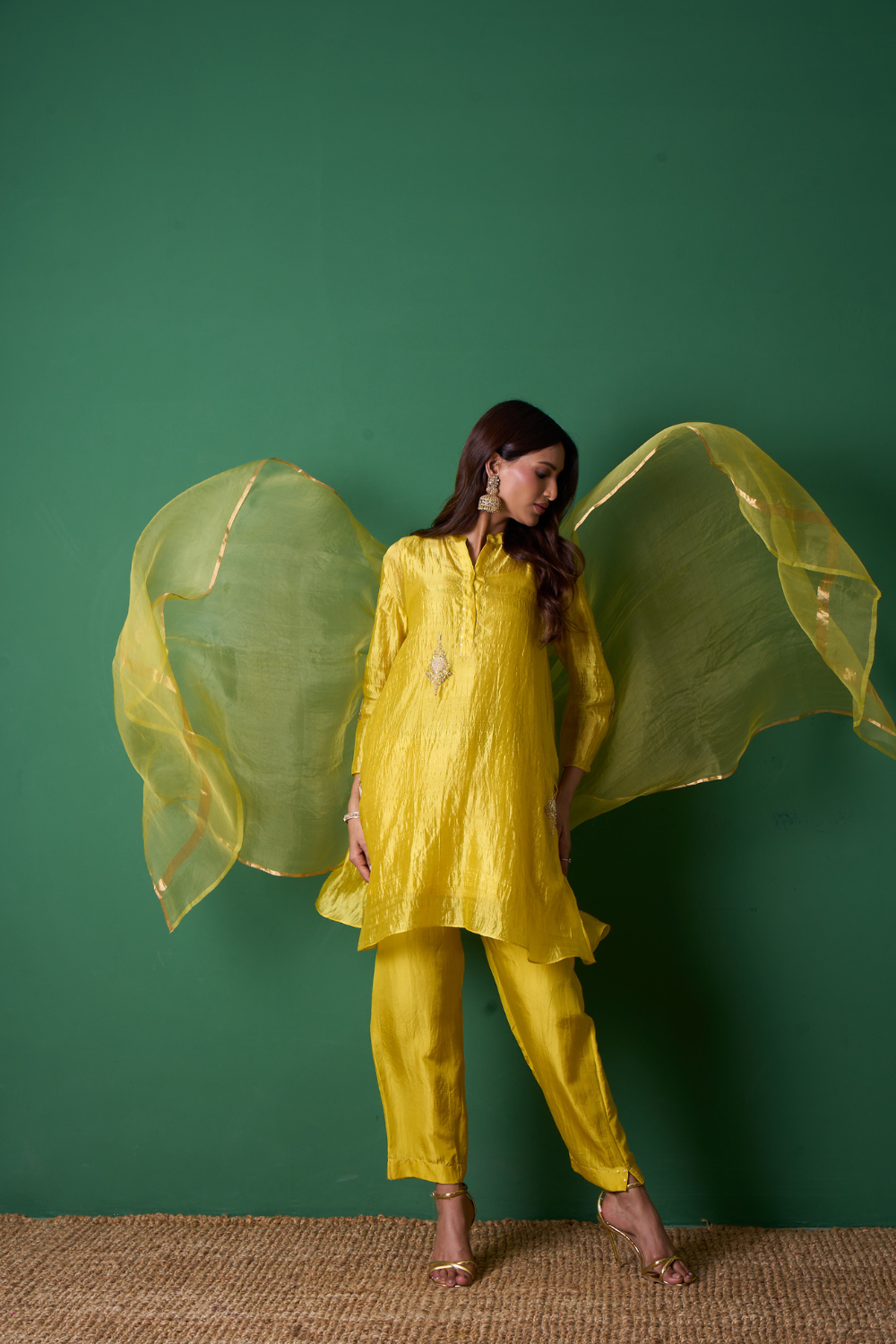 Cord Styled relaxed fit Top and pants with delicate zardozi and bead work on front , back and Sleeves. Embroidered Pants and Organza dupatta with golden border.