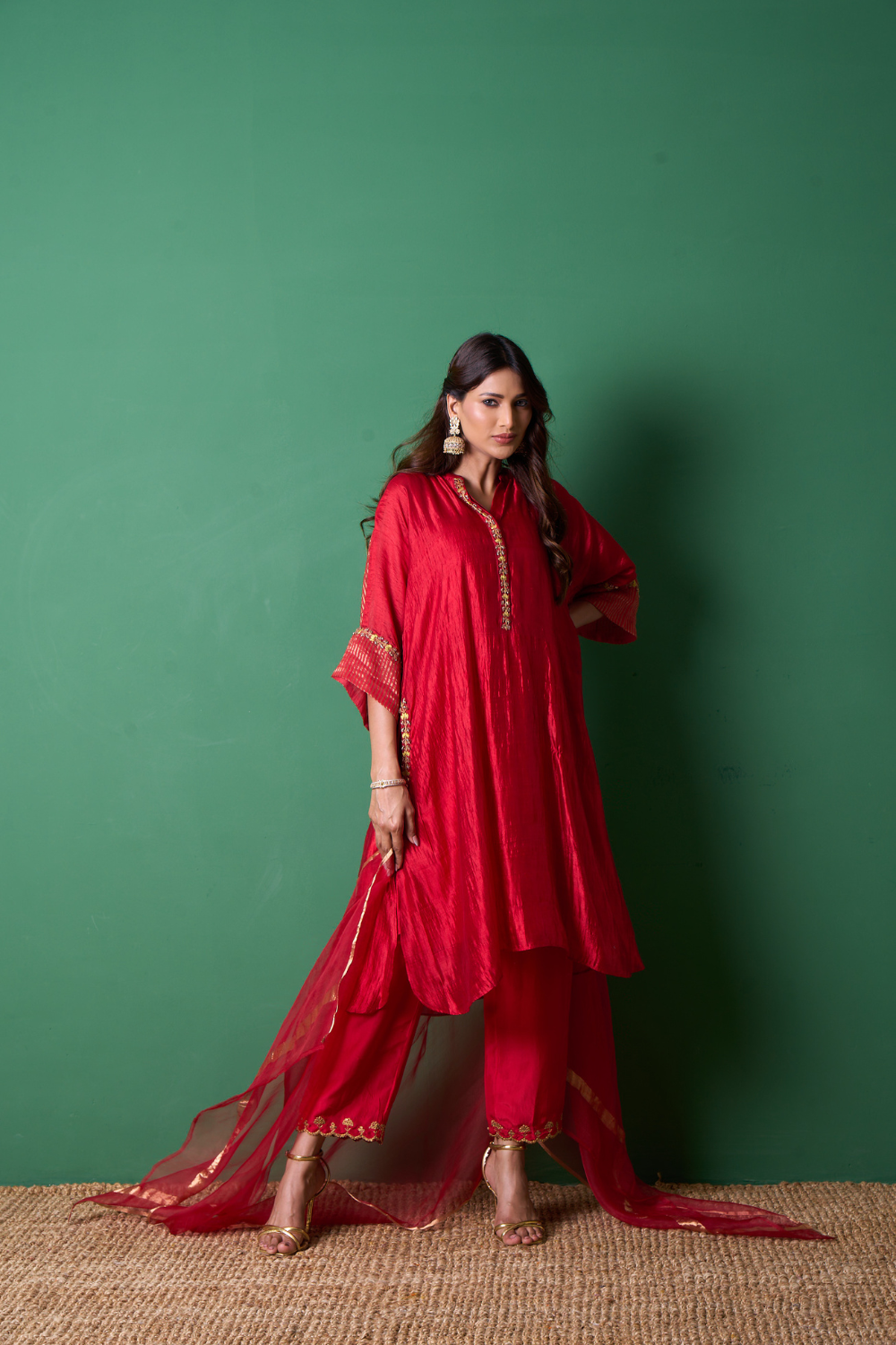 Kaftan styled kurta pant set with intricate zardozi details, Golden stripes on back panel, pockets, a relaxed fit with flowing sleeves with embroidered pants. Organza dupatta with golden border.