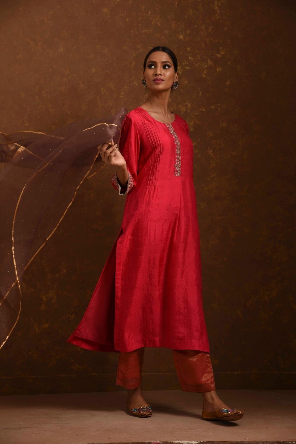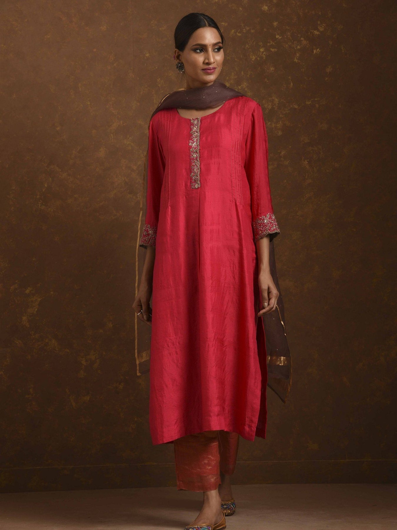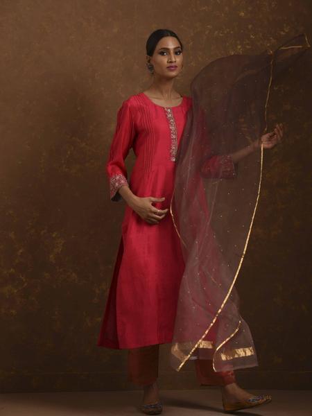Straight fit kurta with embroidery placket and sleeve, dupatta, tissue narrow pants, zardozi handwork