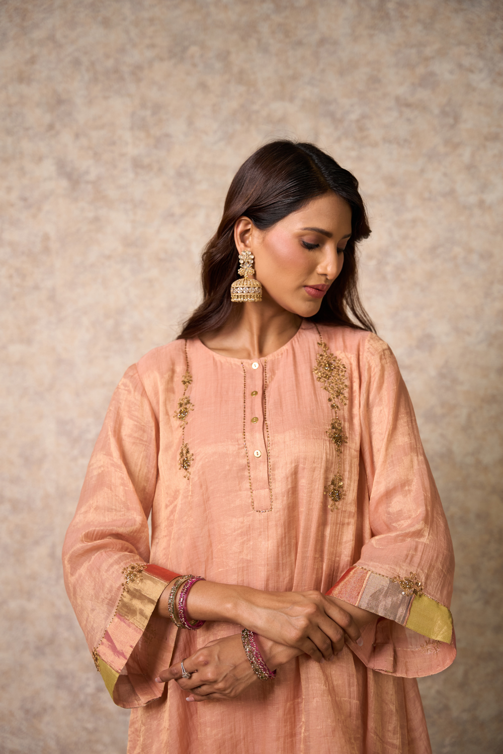 Asymetric indo-western top pant set with intricate zardozi and zari work on front and Back, flowing zardozi work sleeves with embroidered pants.Front adorned with woven tissue stripes.