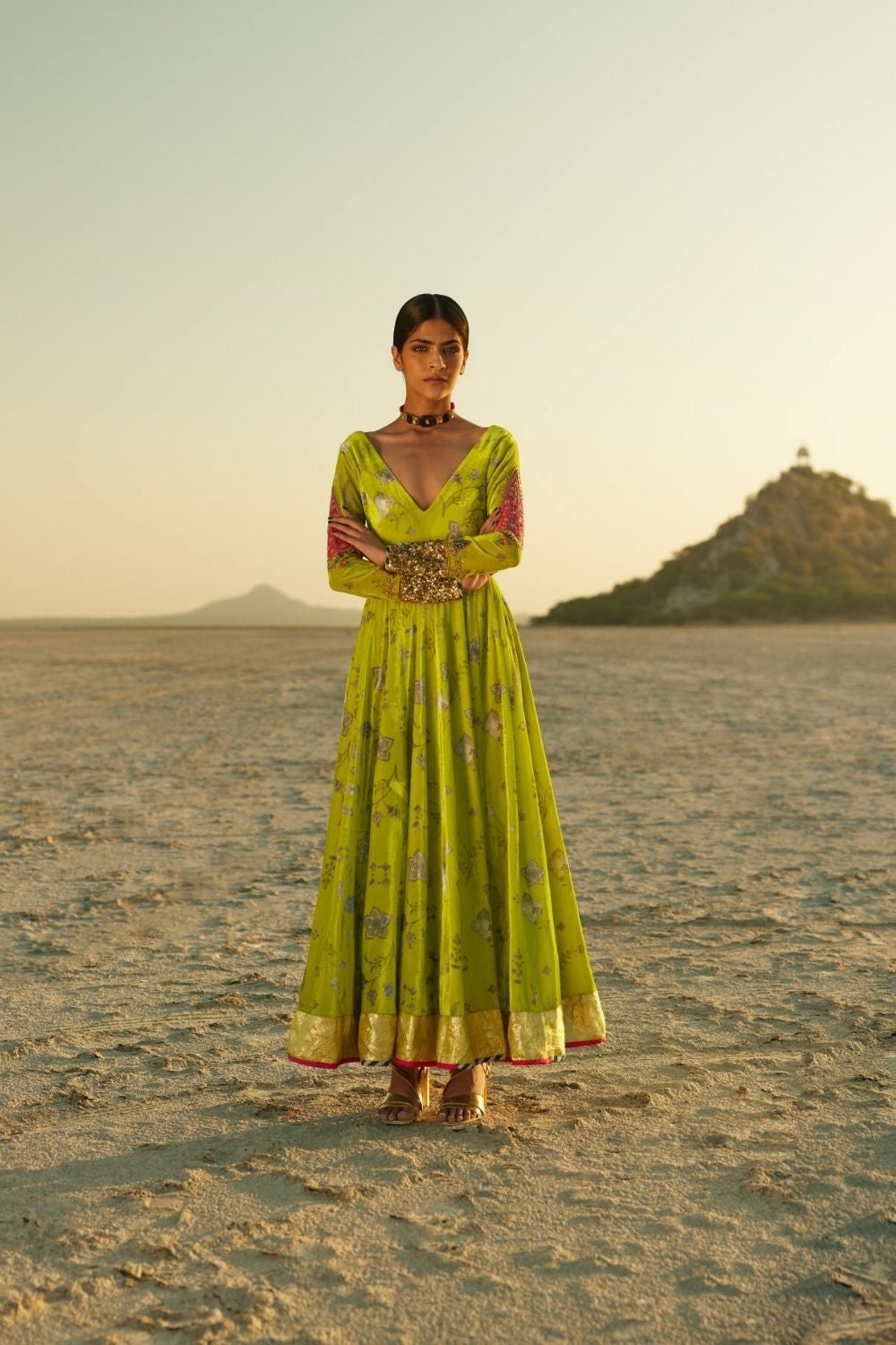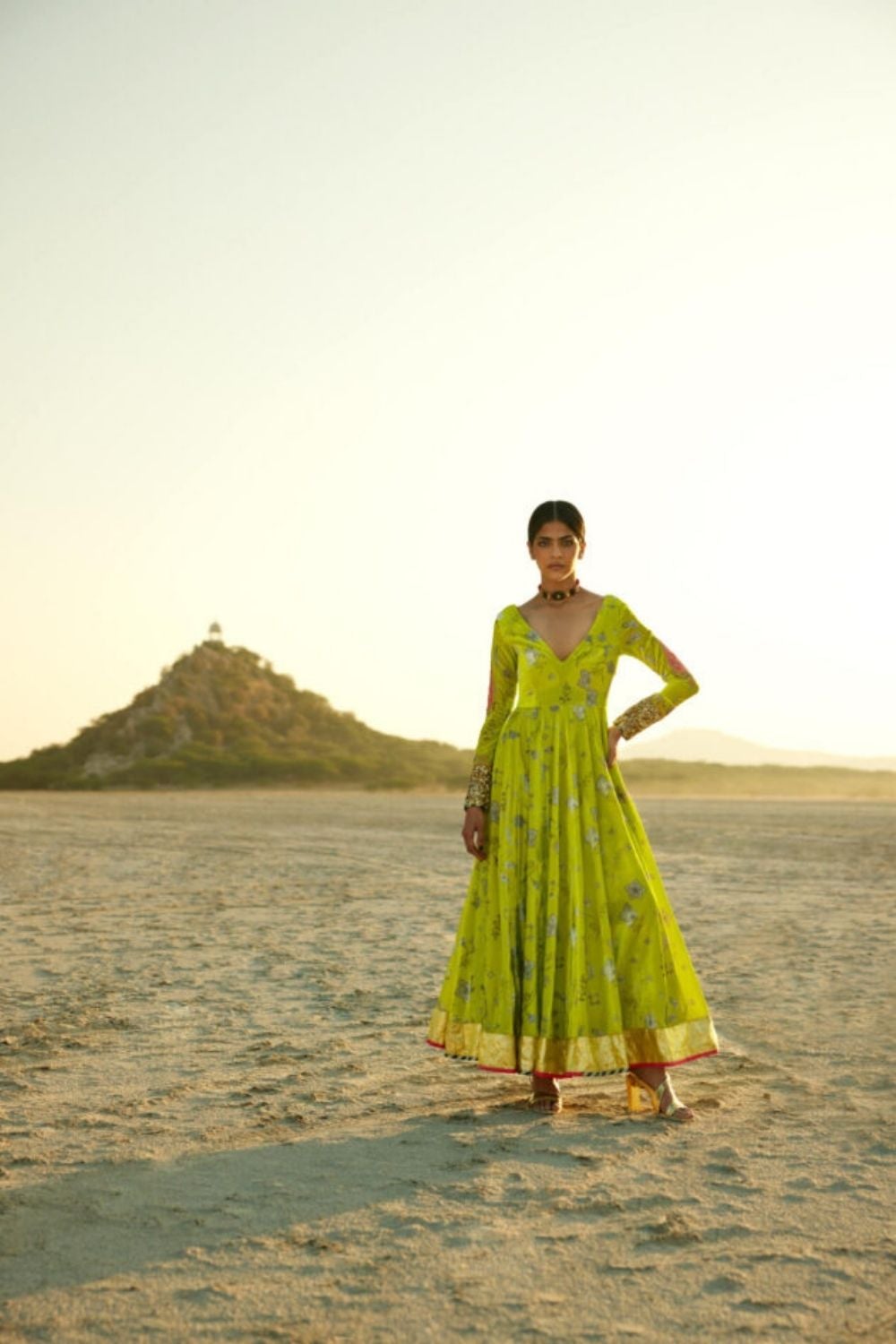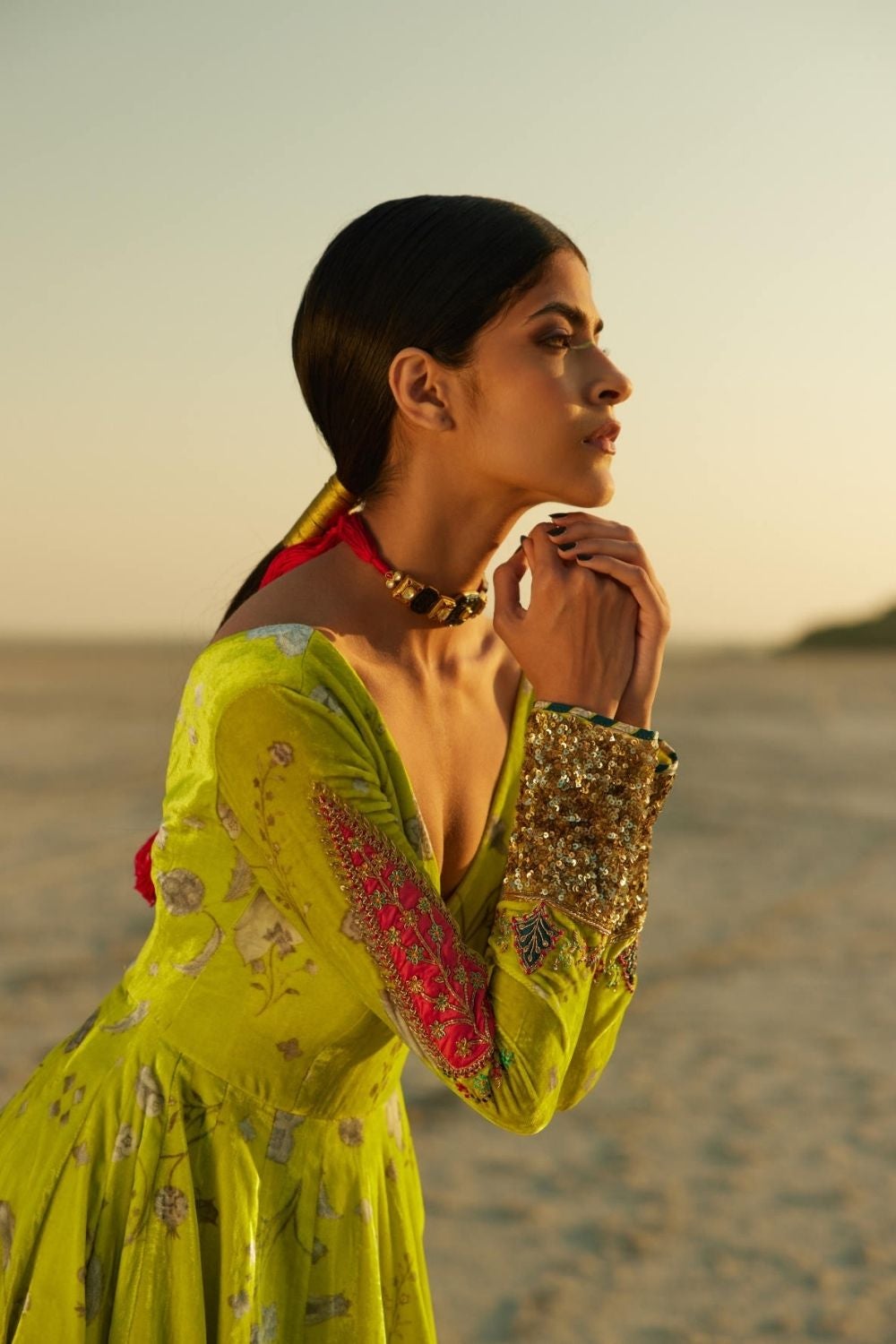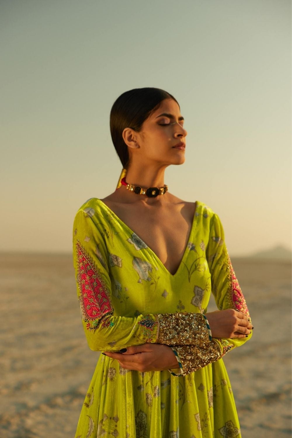 Printed Bright lime silk velvet full length anarkali with intricate hand embroidery on sleeves and gotta n silk finish on the hemline.