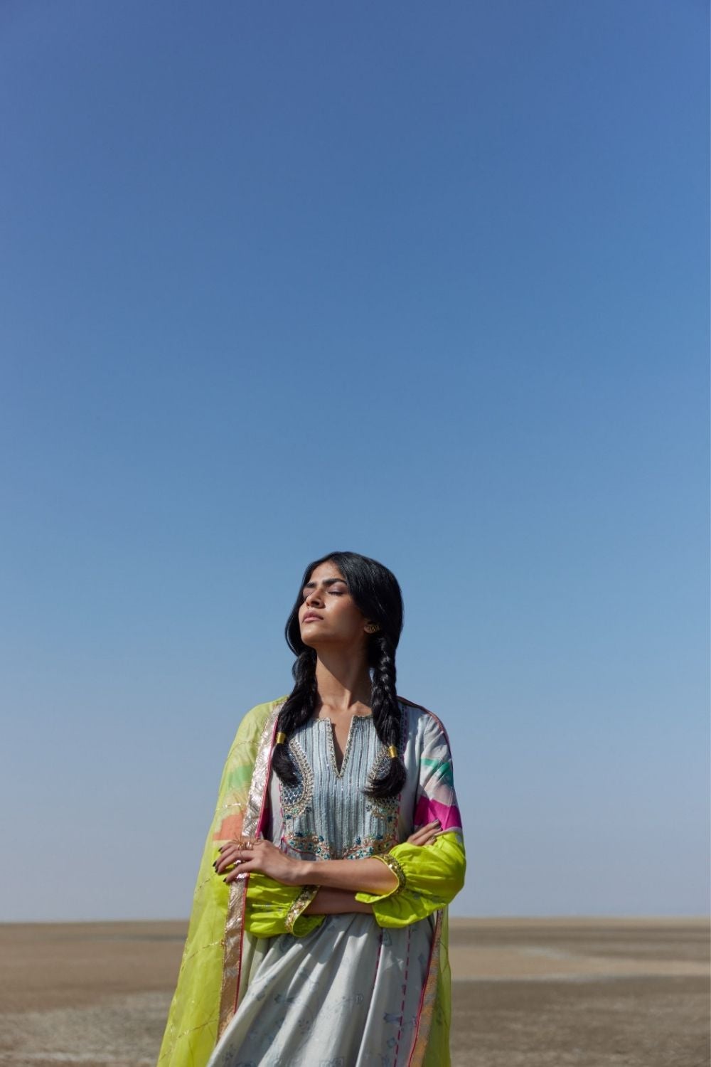 Grey printed silk side kali kurta with hand embroidered yoke and sleeves paired with silk embroidered salwar and lime organza hand embroidered jaal dupatta with silk and gotta finish.
