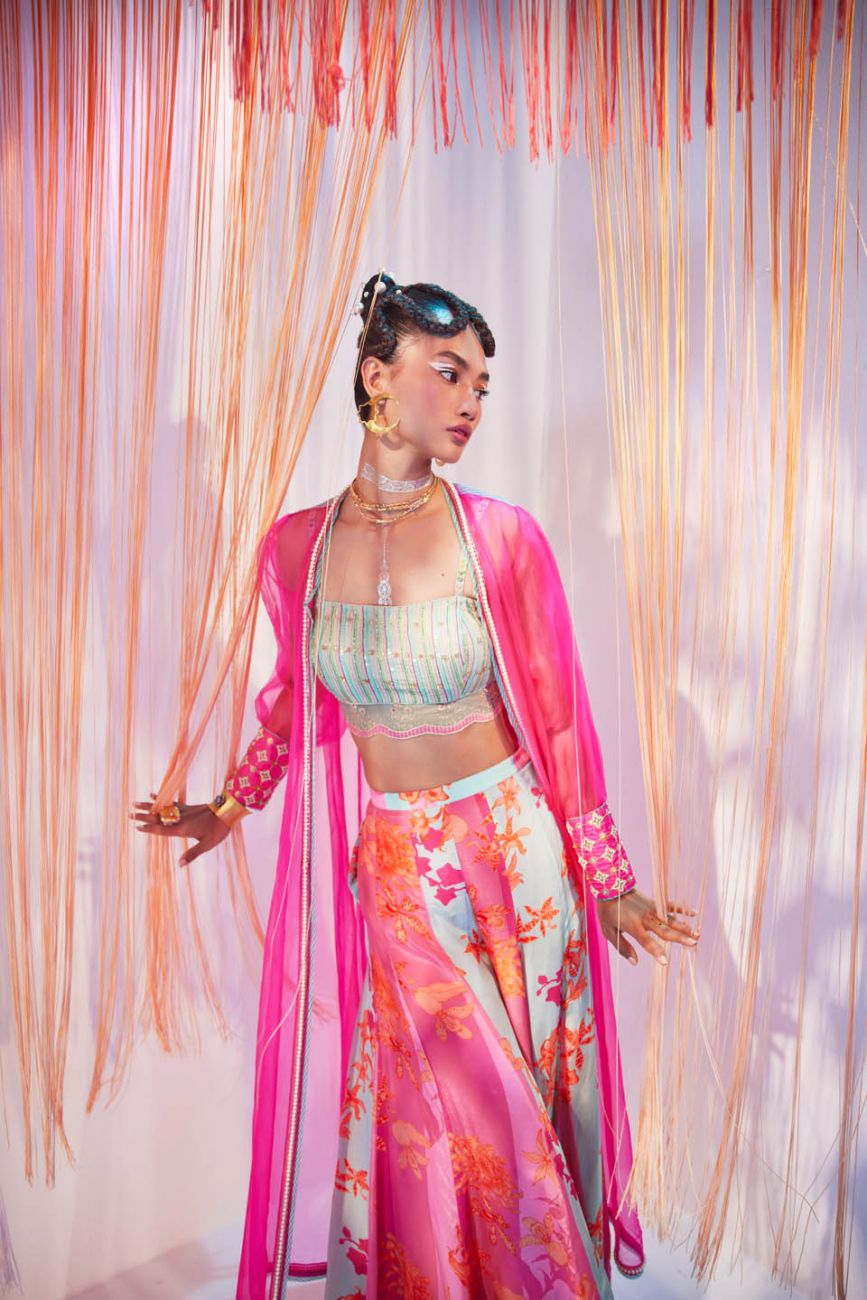 Hot pink silk organza jacket with hand embroiderd cuffs and bustier. Along with pink printed crepe flaired sharara pants.