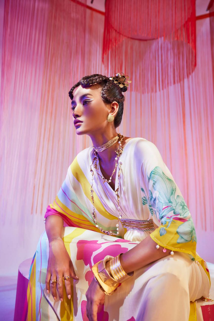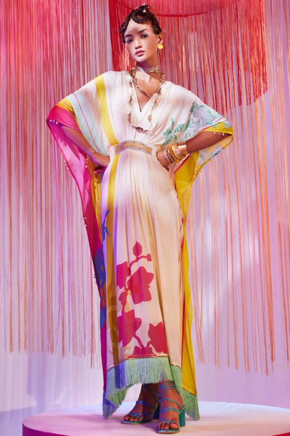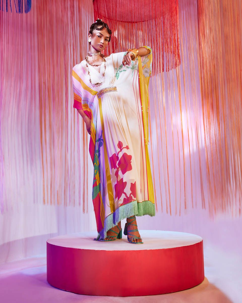 Ivory printed kaftan with intricate hand embroidered waist detail and back tie belt with fringes on hemline.