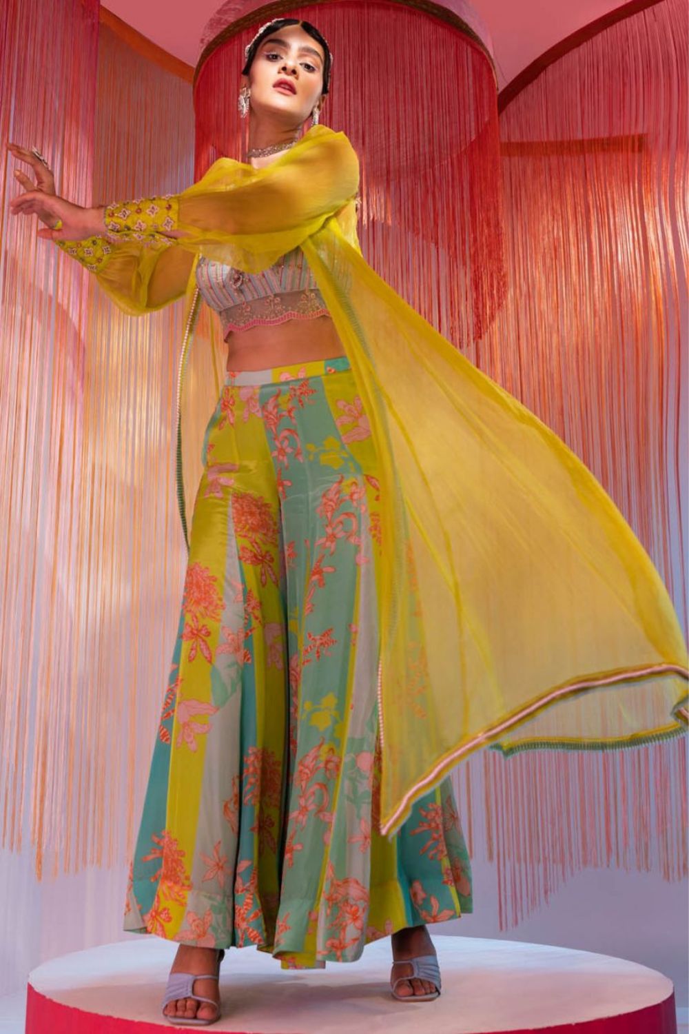 Lime green silk organza jacket with hand embroiderd cuffs and bustier. Along with ferozy printed crepe flaired sharara pants.