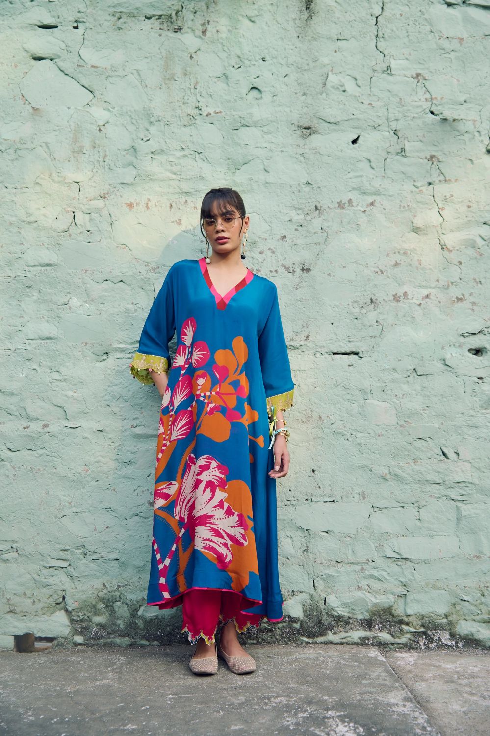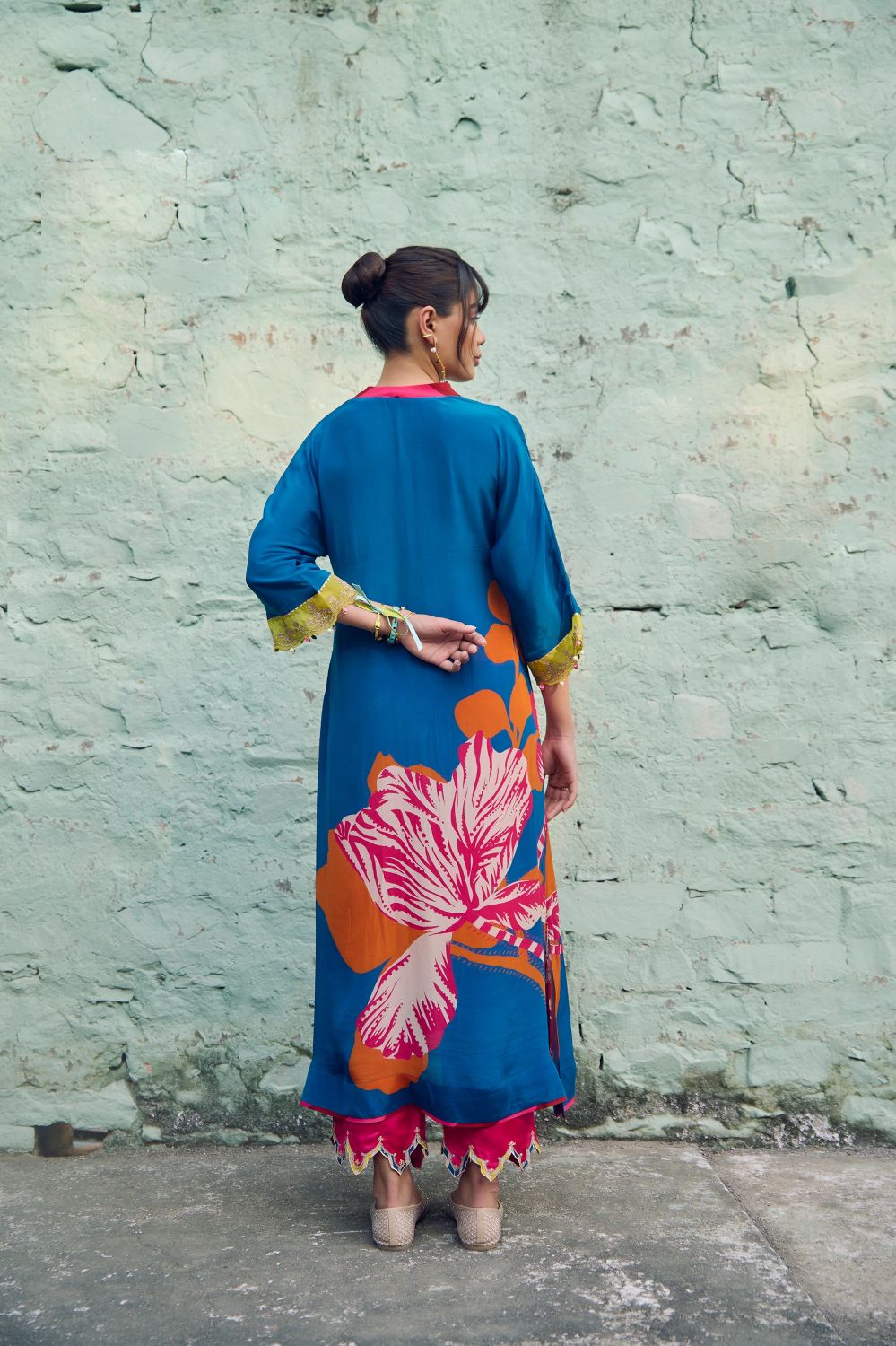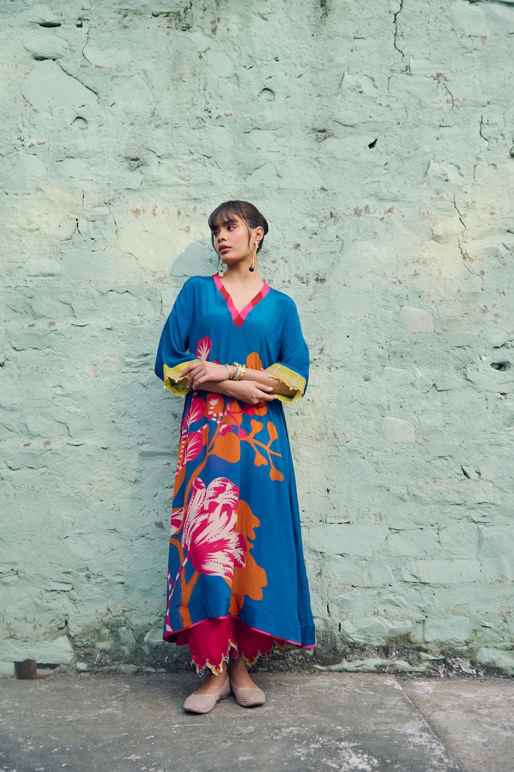 This Teal Blue flower print kaftan kurta is a perfect blend of comfort and elegance. The hand-embroidered cuff add a touch of artisanal charm and craftsmanship.. Paired with a palazzo that features a cutwork hem, this combination is ideal for a breezy day or a laid-back gathering.