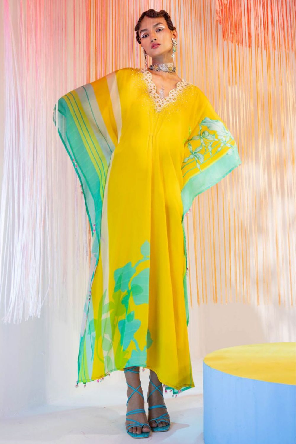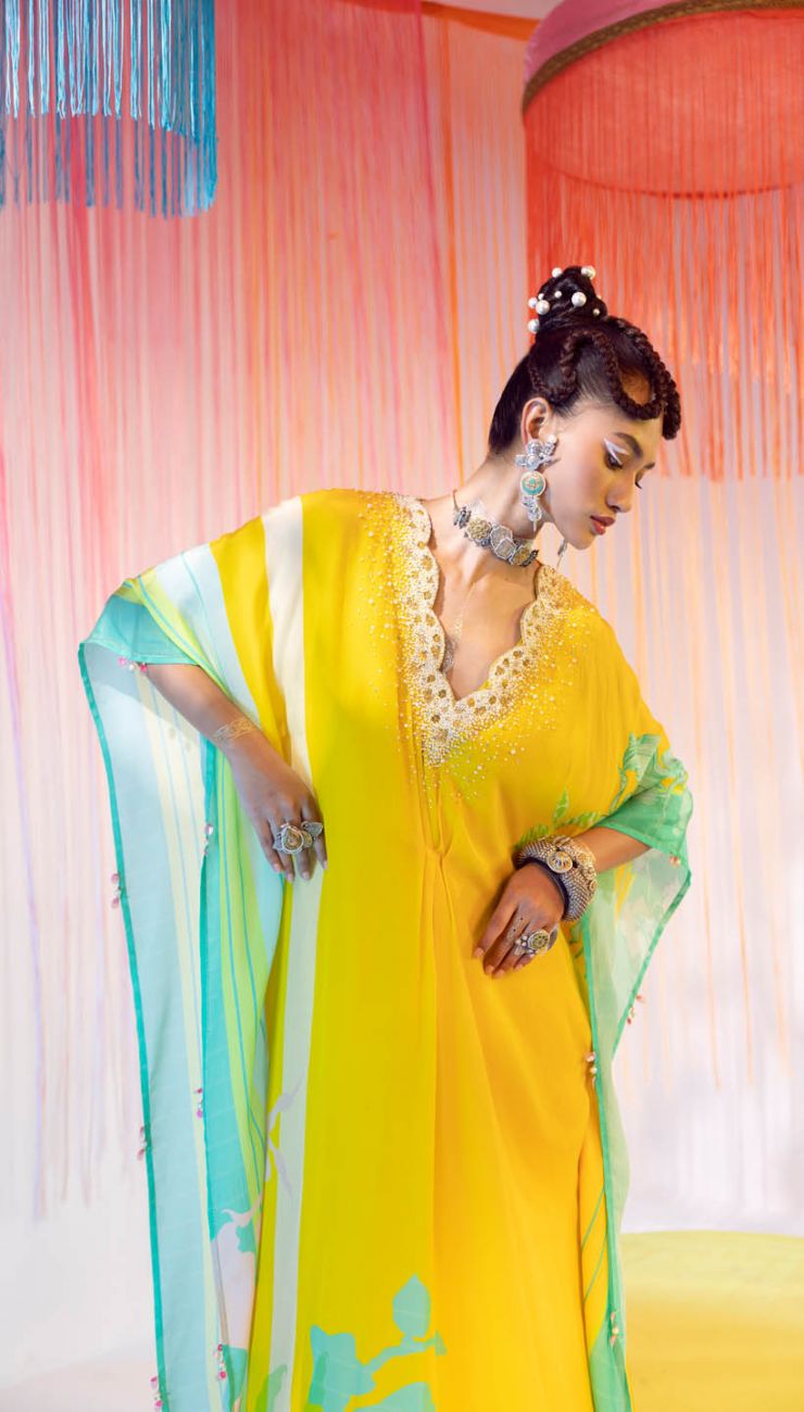 Yellow printed kaftan with intricate pearl hand embroidered scallop neck with centre pleat detailing.