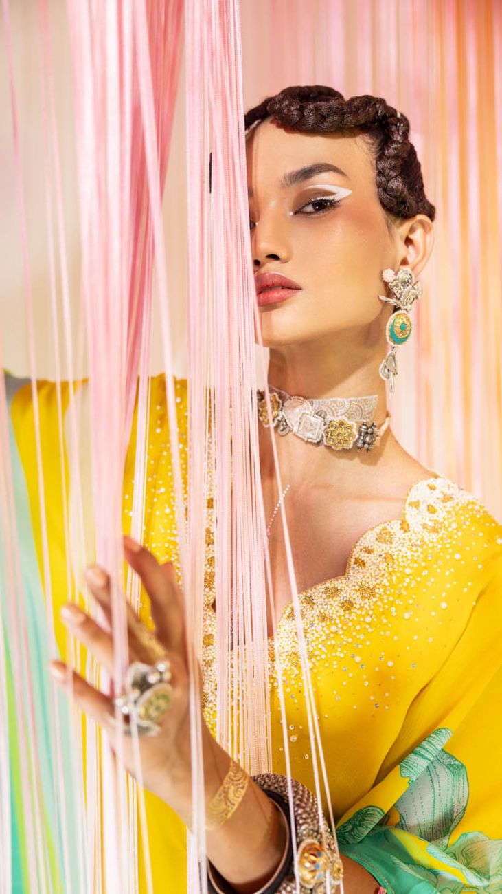 Trained at NIFT and NIFD, the sisters bring technical rigour to their craft: every garment is shaped with intention, from the drape of the fabric to the finesse of the motif. What defines RajiRamniq is this balance — expressive without excess, deeply Indian yet cosmopolitan in its sensibility.
