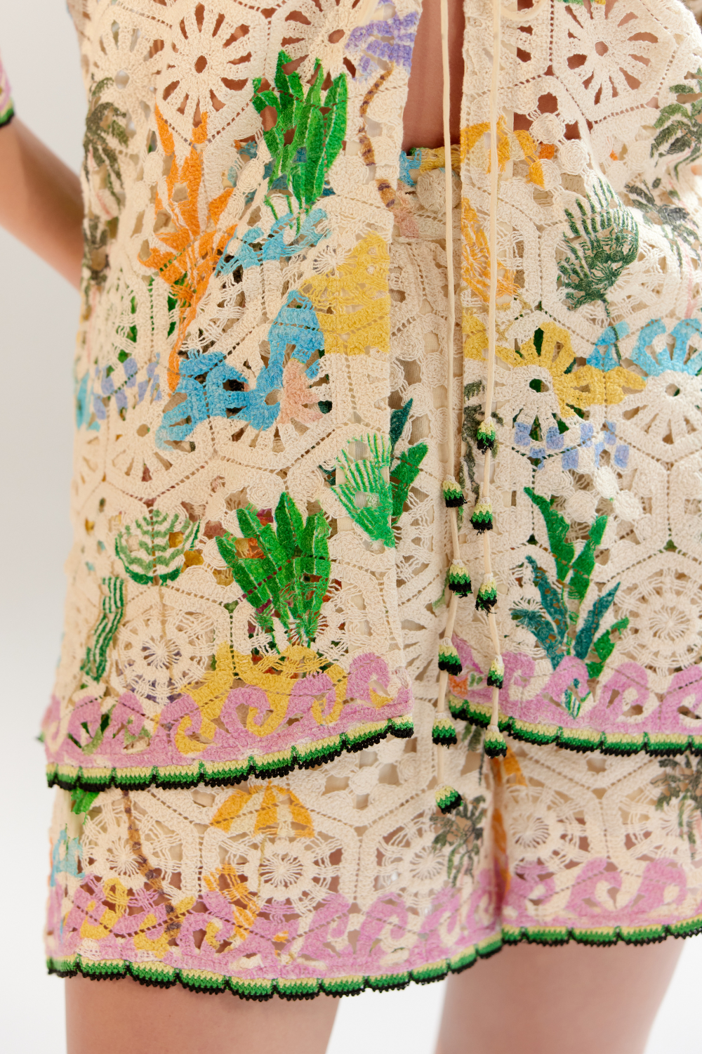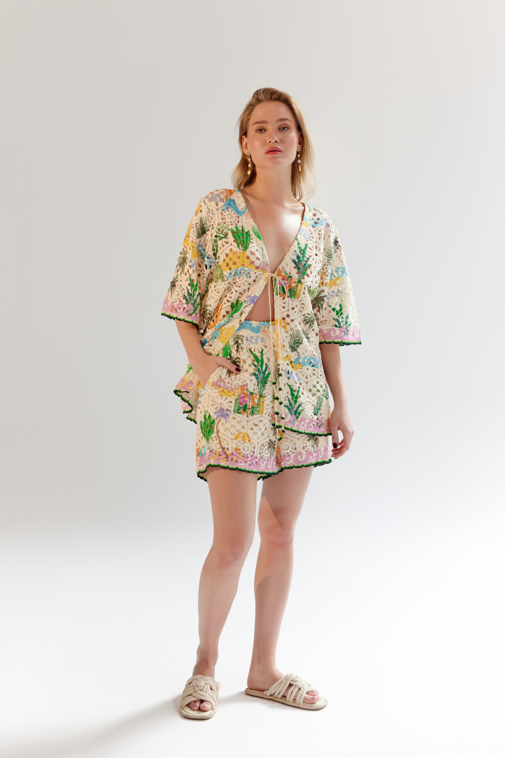 The Deya Shorts are a perfect blend of comfort and style. Available in two eye-catching variations—Postcard and By the Sea—these shorts feature intricate placement prints on textured crochet fabric, making them a standout piece for the season.