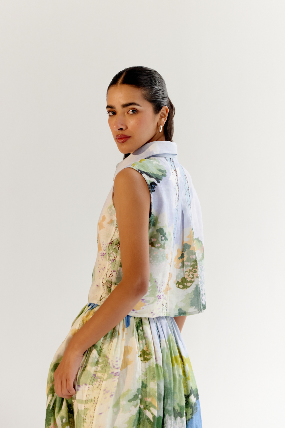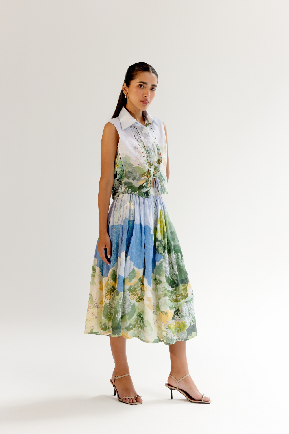 Introducing the Freya Set that is a perfect blend of elegance and versatility. This shirt-and-skirt set comes in three stunning variations: Landscape and Flora, both featuring vertical lace inserts and vibrant placement prints on breathable linen lyocell, and a classic Schiffli Embroidery design on soft viscose linen. Each sleeveless shirt is thoughtfully designed with criss-cross dori detailing at the front, adding a playful yet refined touch.