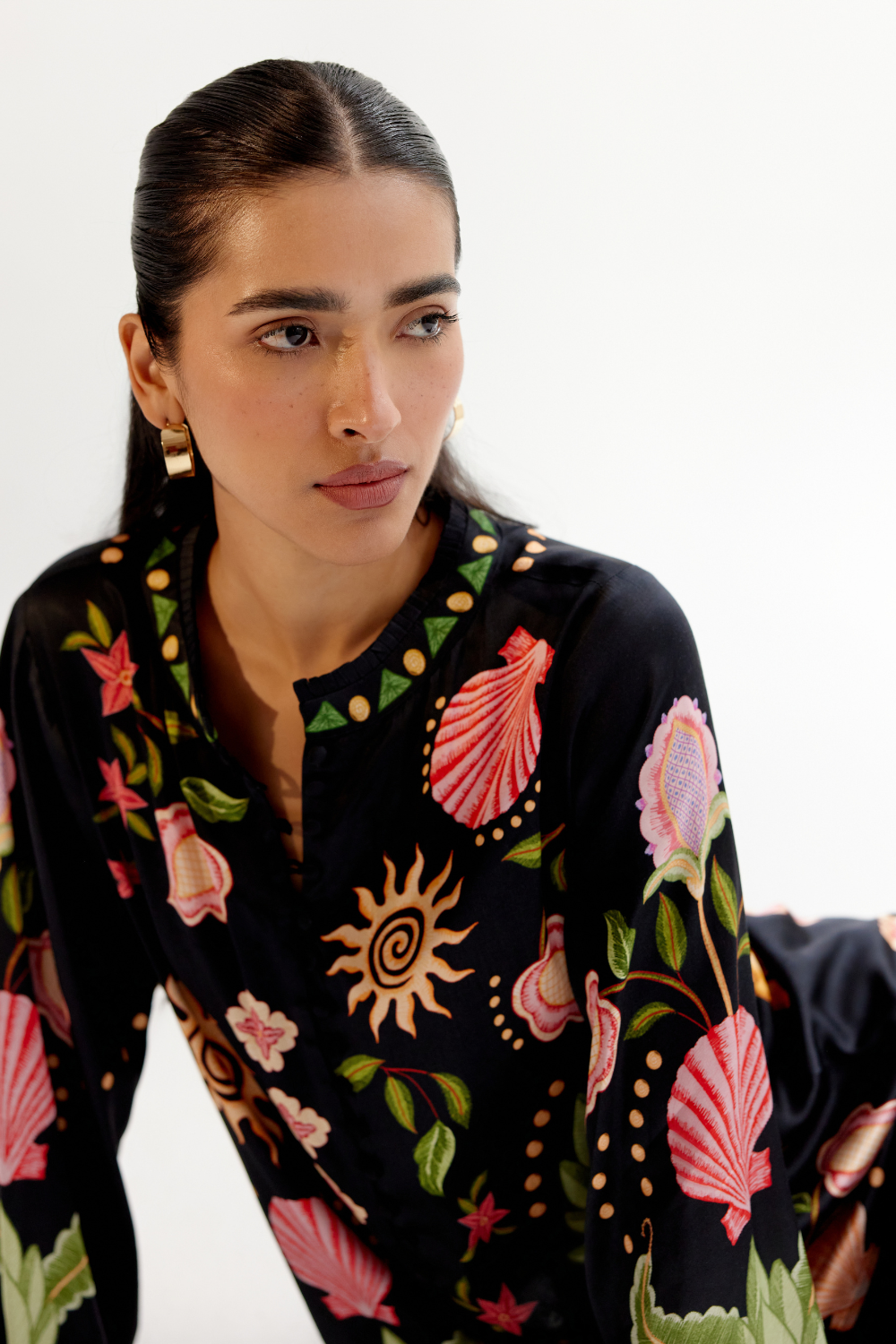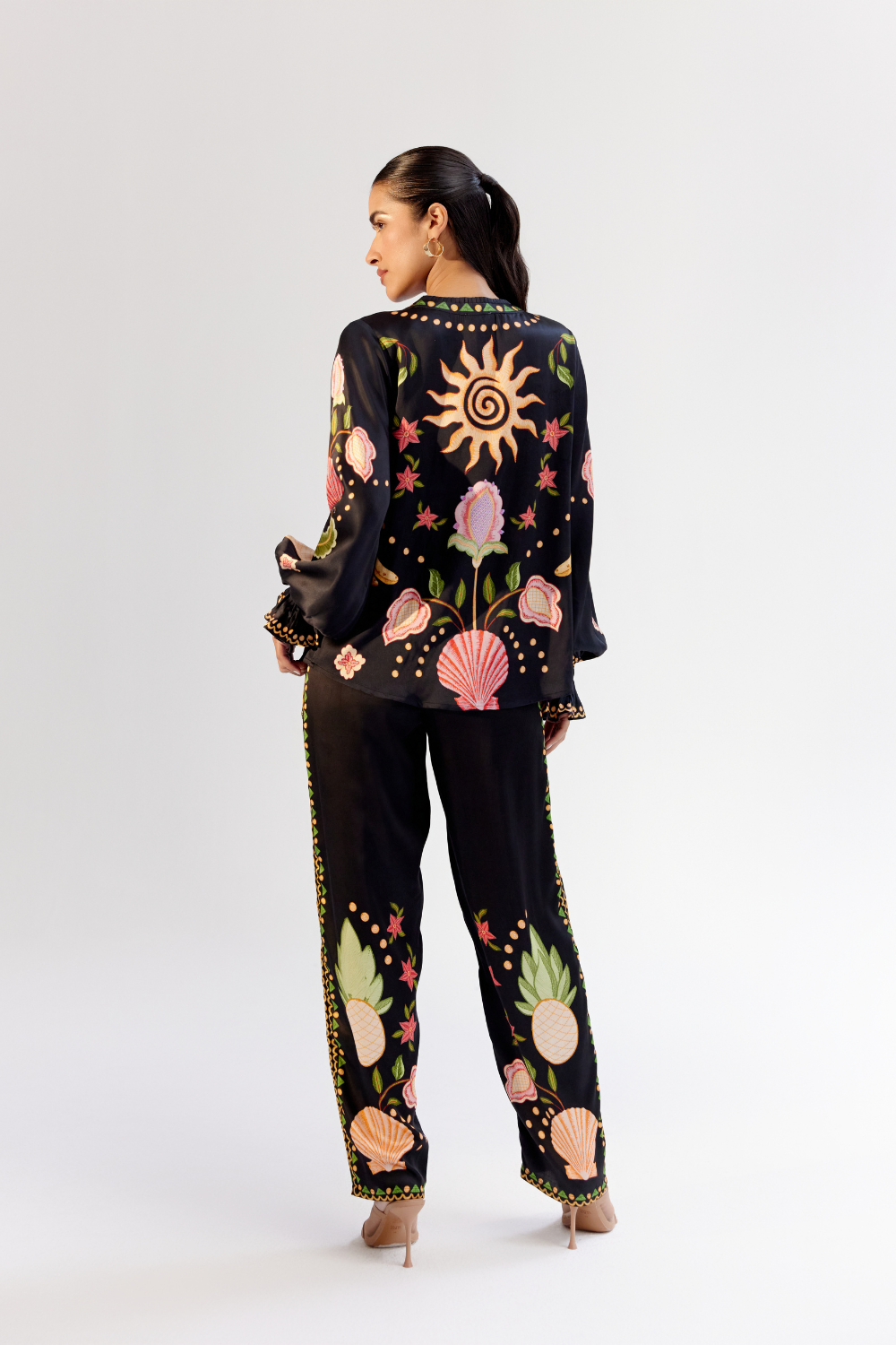 Introducing the Ilia Shirt and Pants Set that brings effortless sophistication with a touch of playful charm. Crafted from luxurious modal satin, this coordinated set features intricate placement printing in the elegant Seashell (Black) design, offering a refined, statement look. The shirt is detailed with a pleated collar and delicate ruffled sleeves, adding texture and femininity to the silhouette. Thoughtfully designed, the button loops are crafted from durable anchor thread, blending craftsmanship with style.