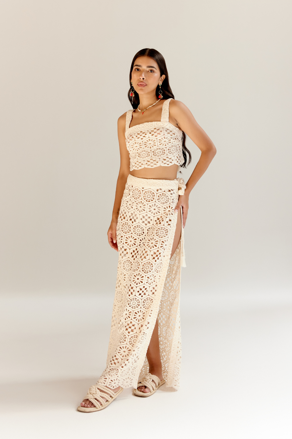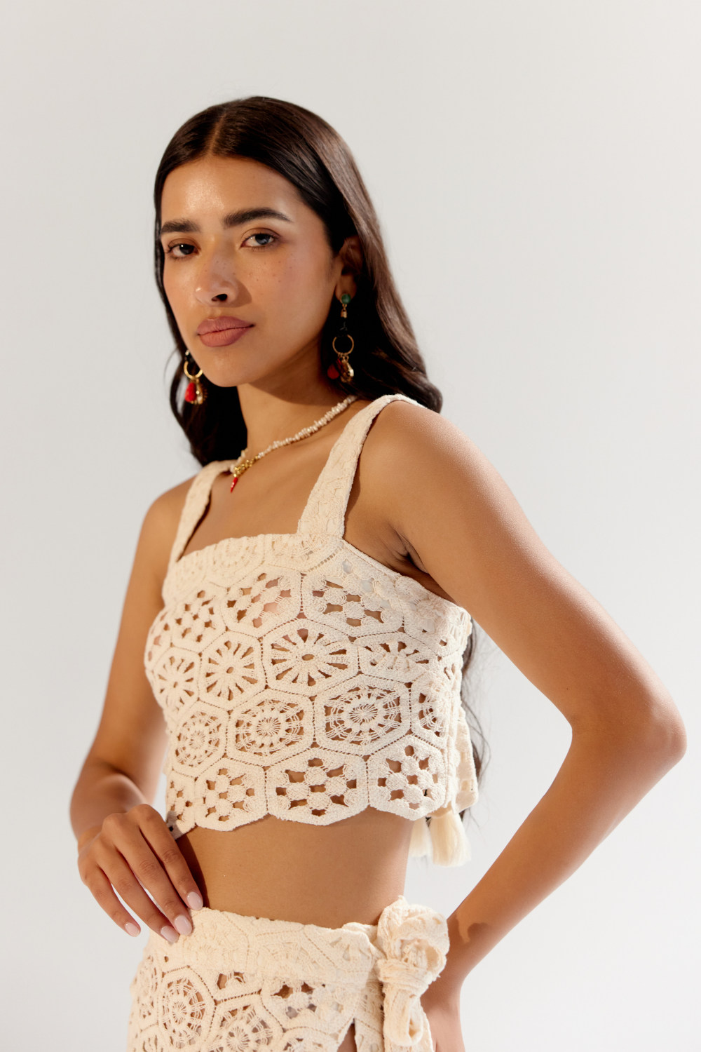 The Magda Set embodies effortless elegance and playful charm. This two-piece set features a beautifully crafted crochet fabric, with the top boasting delicate tassels adorned with beads on the straps for a touch of bohemian flair.