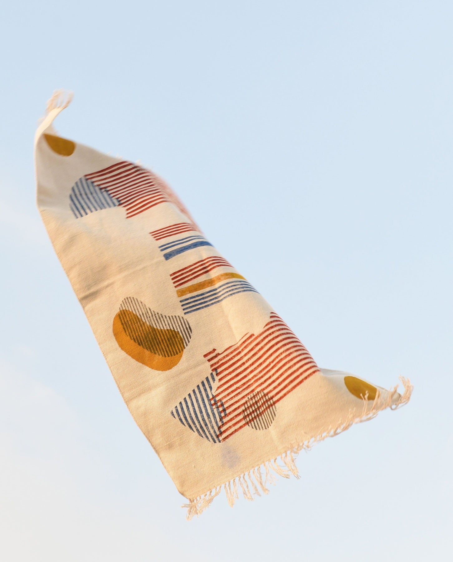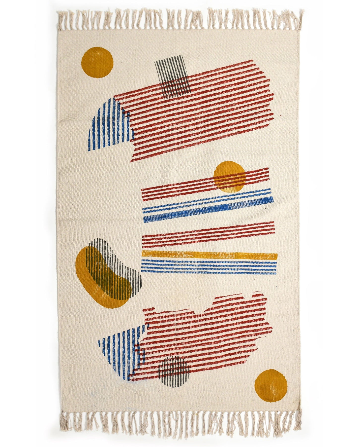 Dhurries, made using handspun Khadi, which is handwoven meticulously by diligent craftsperson from Banskho, a village in Rajasthan. Subsequently these Dhurries are handprinted in Bagru by master artisans.